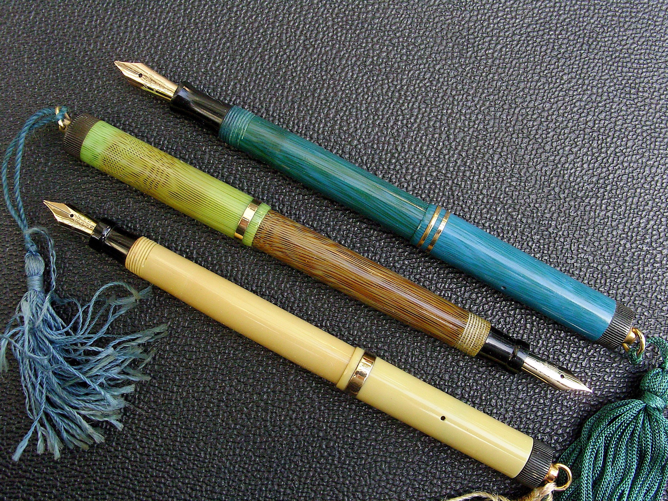 Contribuisco con le mie tre Pasrel: una Gray beige della prima serie "non moire" e con unico anello largo al cappuccio (1926), una Apple green, purtroppo piuttosto virata; questo colore che sostituì il proprio il Gray beige nel 1928. Infine una Naples blue nella versione streamlined introdotta nel 1929, che differisce per il fondello e la parte terminale del corpo più rastremati e per il puntale senza "scalino".