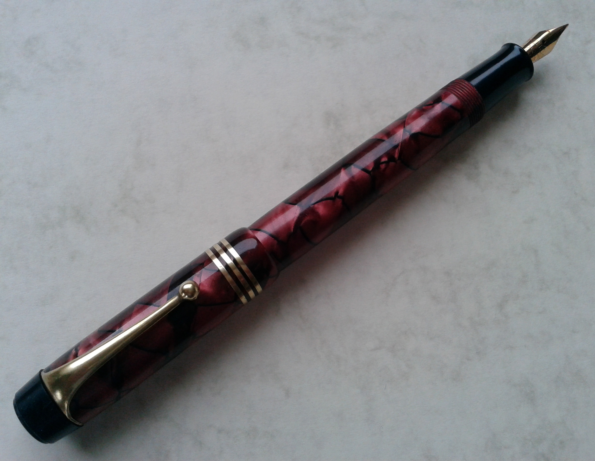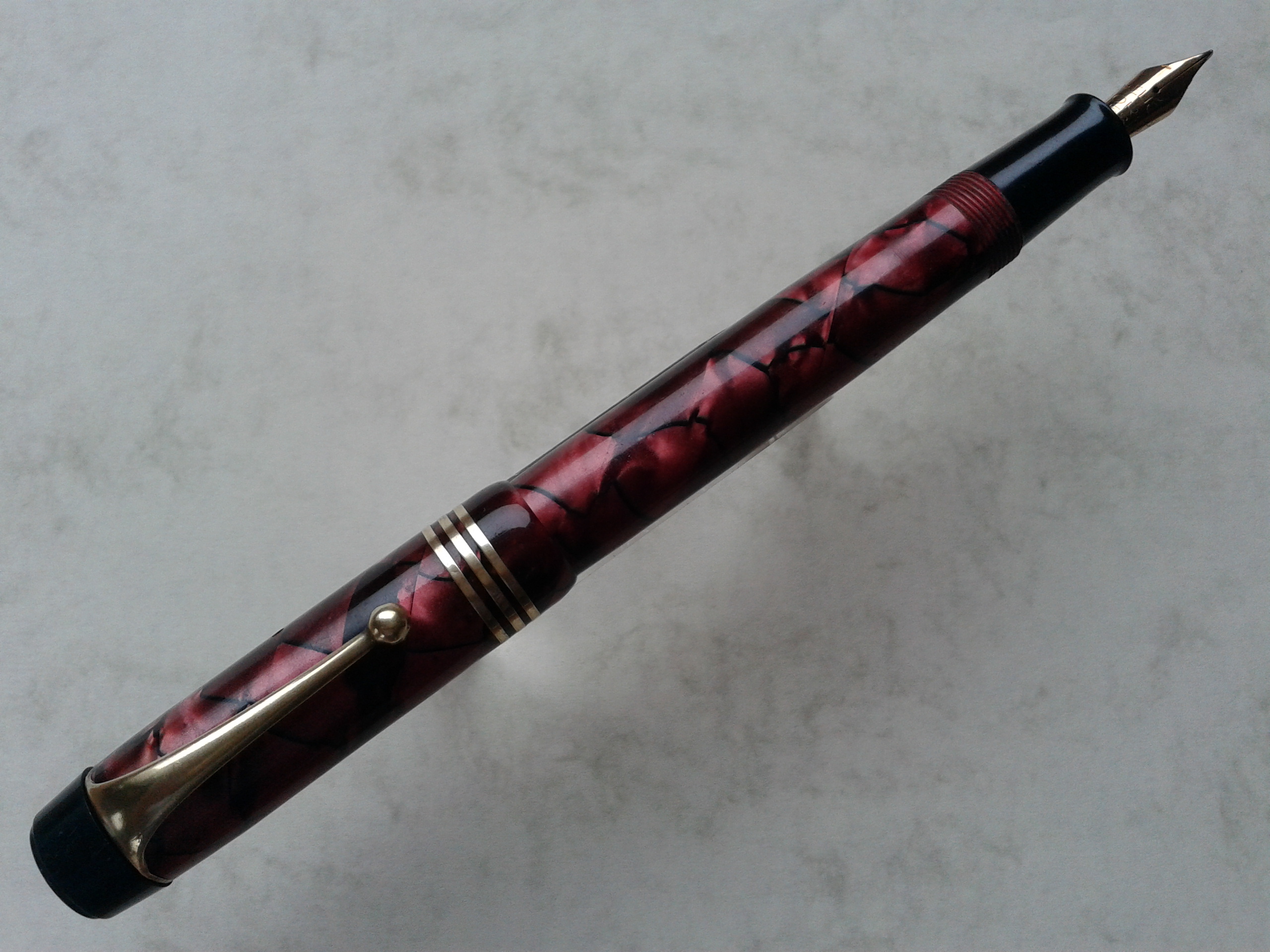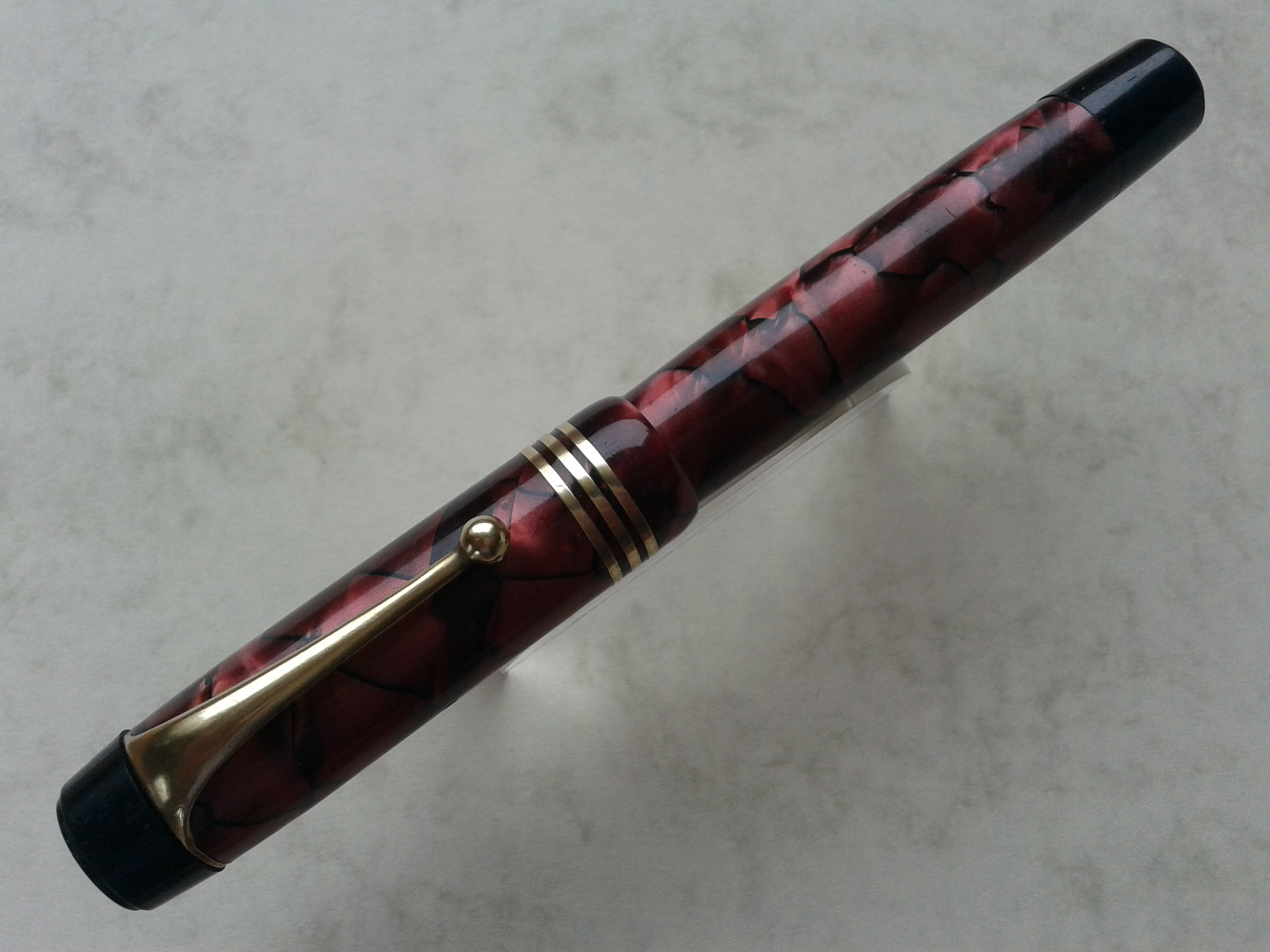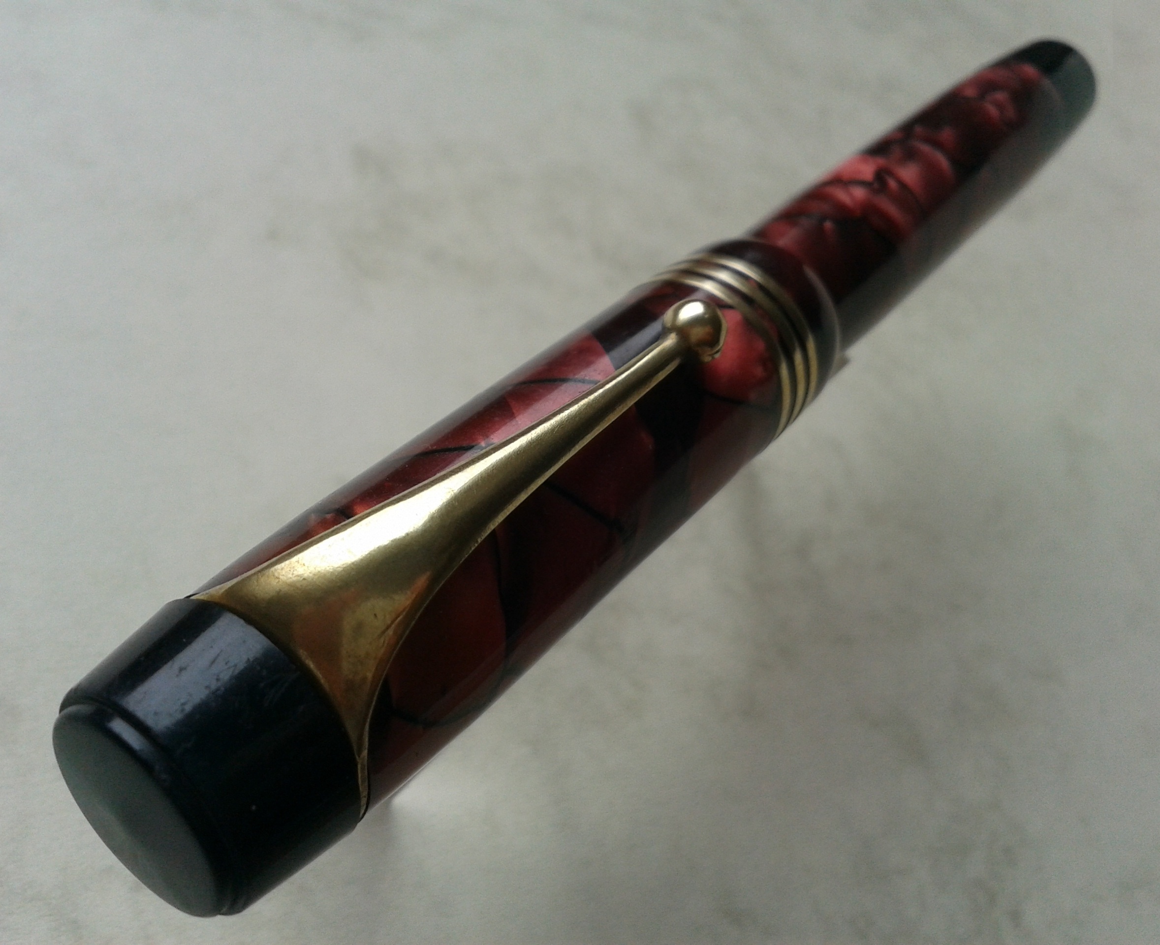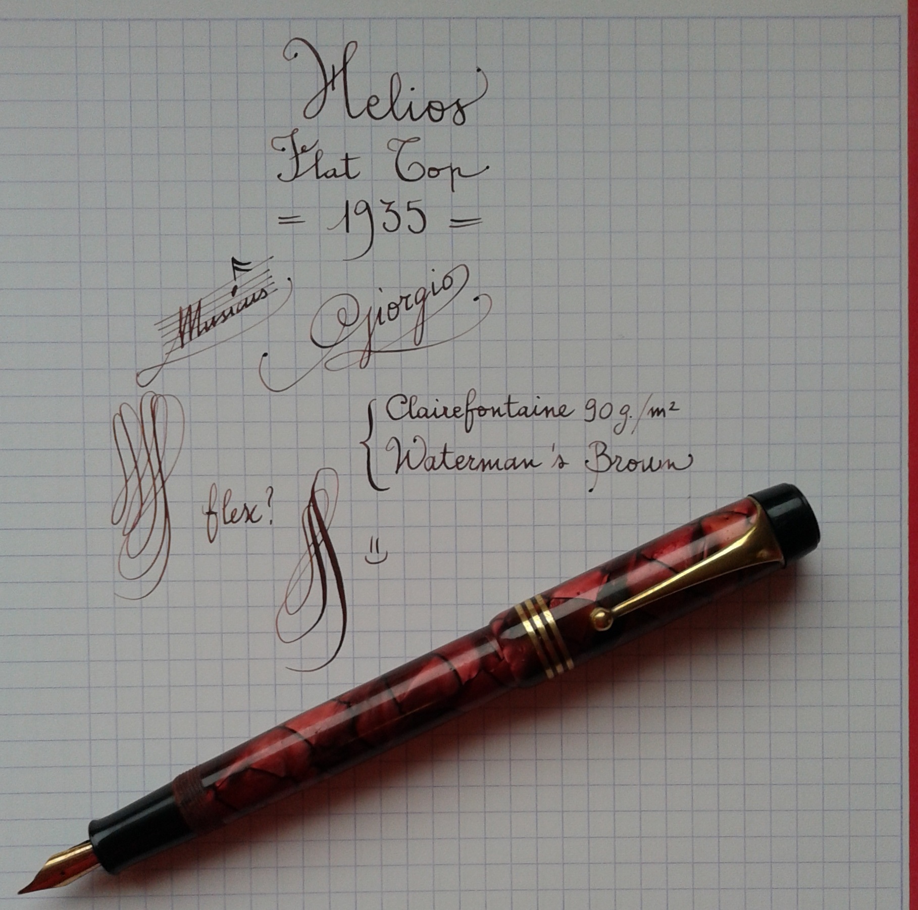 HELIOS flat top in celluloide rossa con venature nere, parti metalliche a vista placcate oro, pennino Helios in oro 14 carati, caricamento a pulsante di fondo, prodotta a Milano, Italia 1935. La Marca secondo Letizia Jacopini