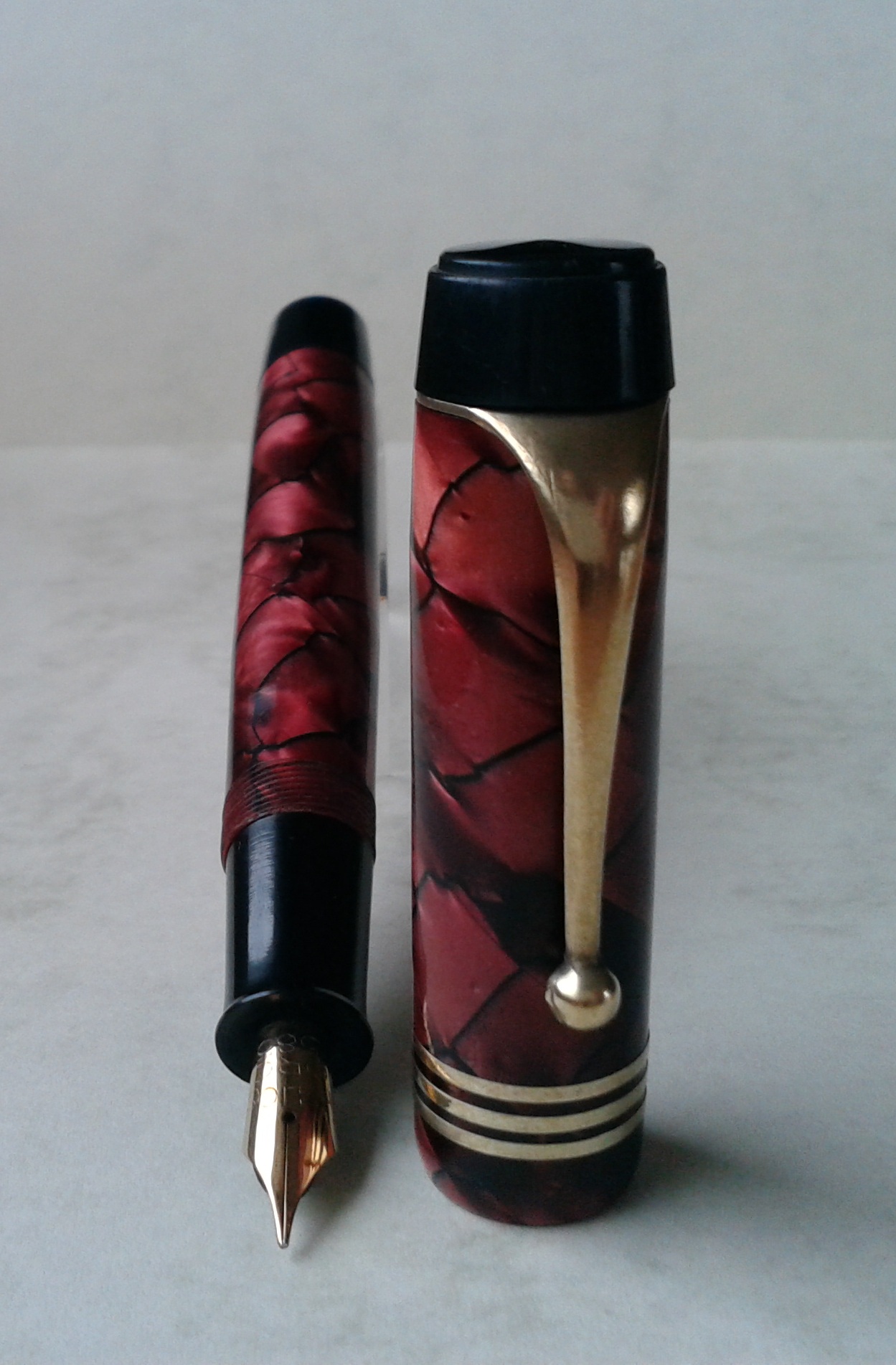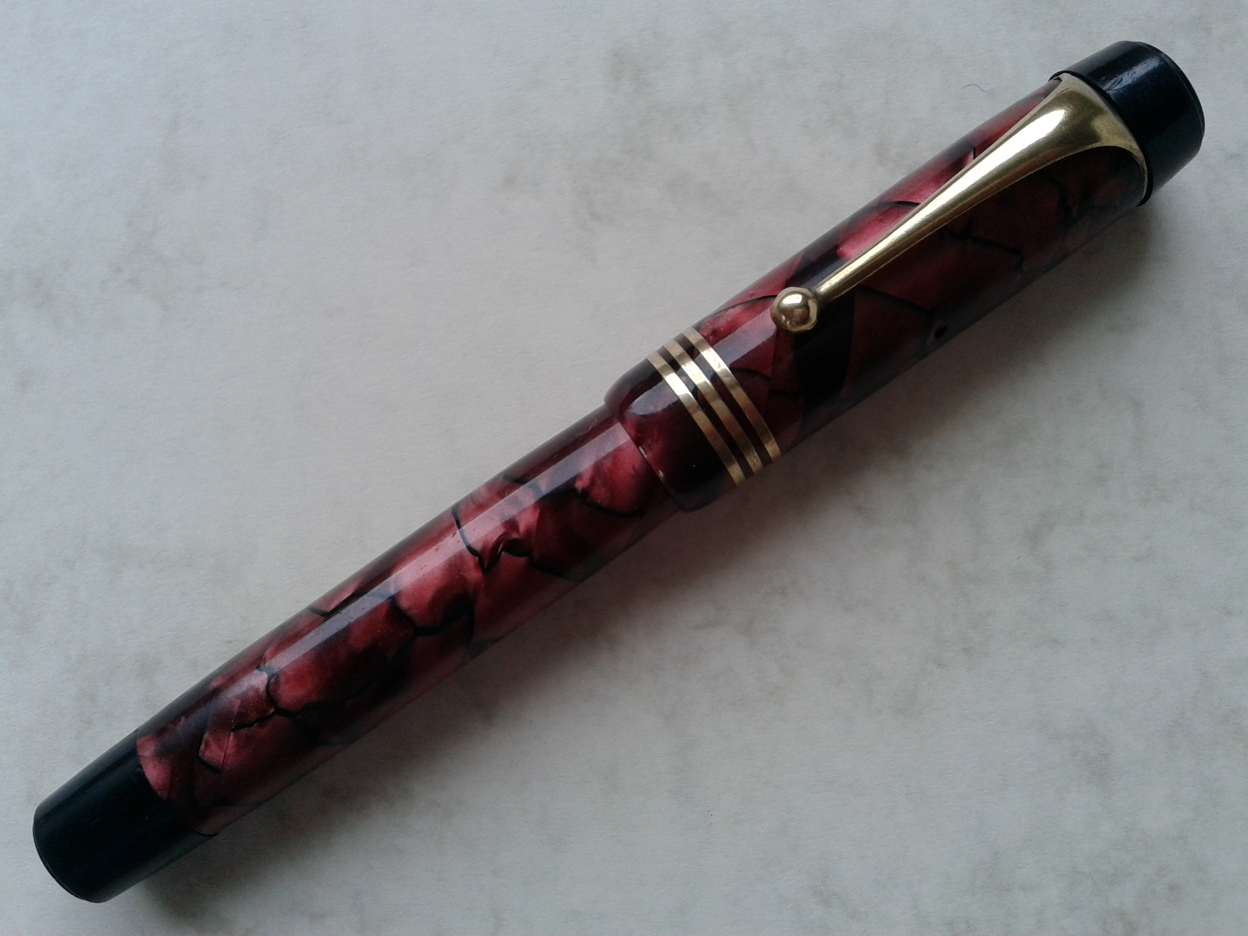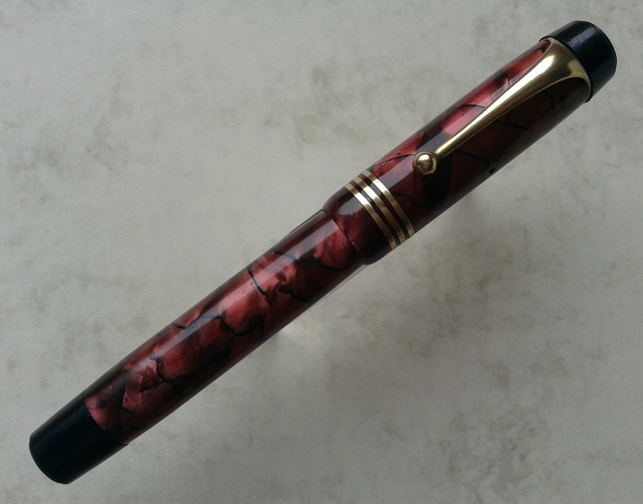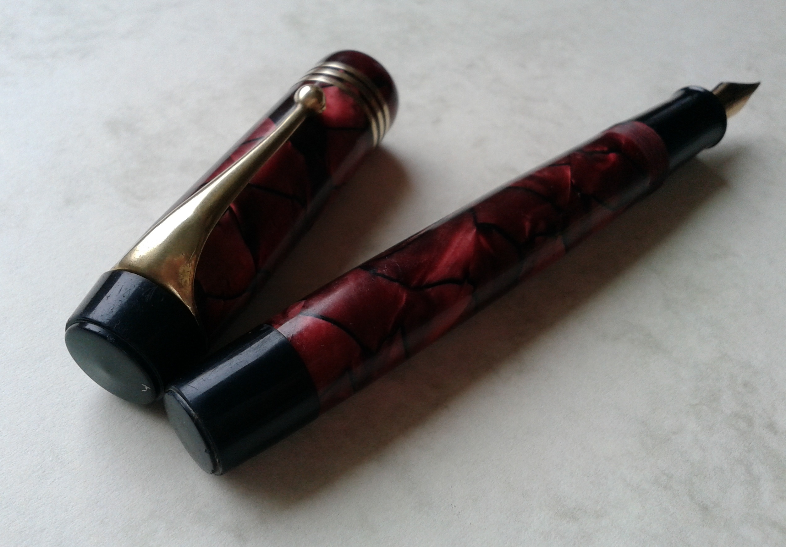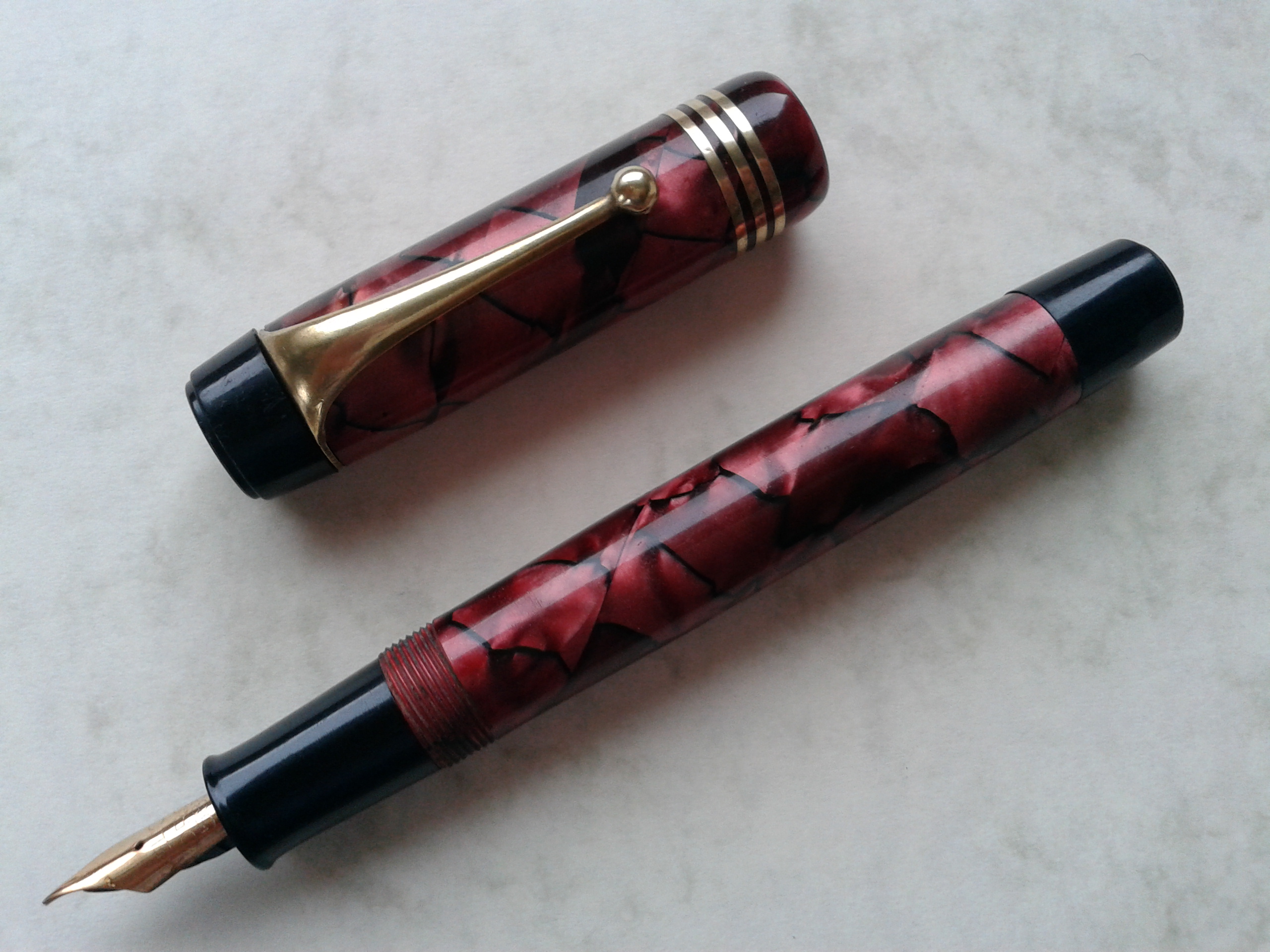 HELIOS flat top in celluloide rossa con venature nere, parti metalliche a vista placcate oro, pennino Helios in oro 14 carati, caricamento a pulsante di fondo, prodotta a Milano, Italia 1935. La Marca secondo Letizia Jacopini