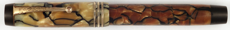 Come il cappuccio, anche il fusto (insolitamente privo dell’iscrizione principale della Marca) ha una delle estremità occupata da una celluloide nera “a contrasto”, nella più pura tradizione Duofold: entrambi i terminali, testina e fondello copri-bottone, sono tronchi di cono ingentiliti da una sottile scalinatura.