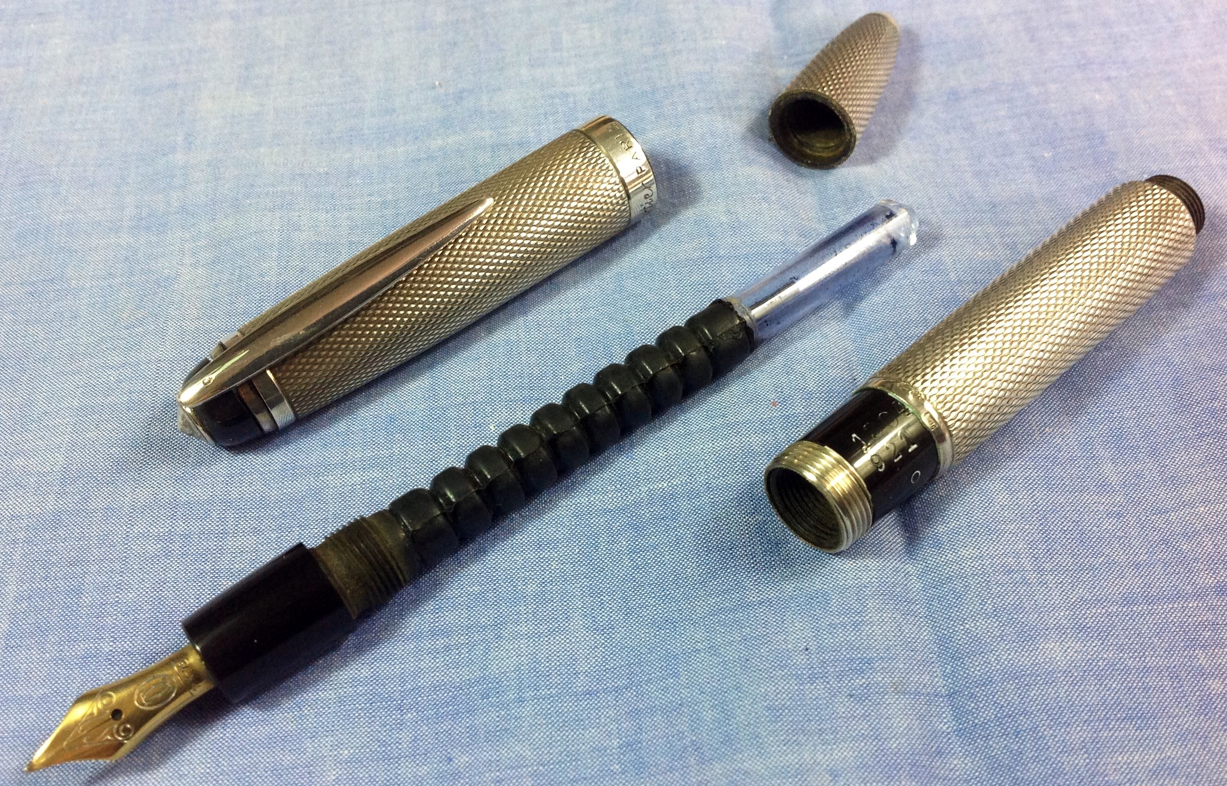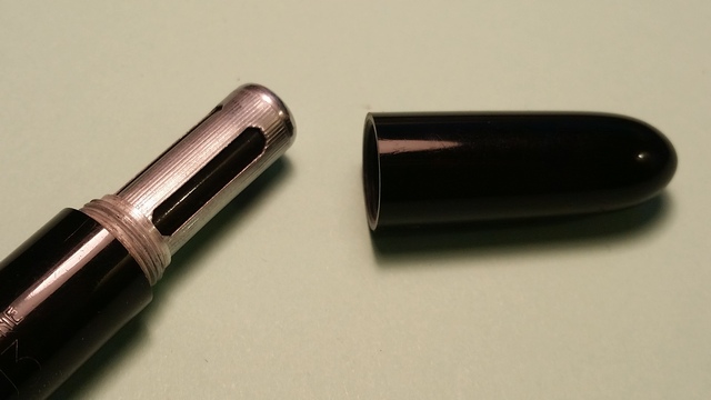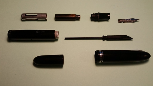 Dopo la meravigliosa esperienza al Pen Show di Bologna, vorrei condividere con voi il "bottino" della mia caccia. Inanzitutto vorrei dire che ho apprezzato moltissimo conoscere persone che coltivano questa passione, ed ho trovato questa esperienza assai interessante! E finalmente sono riuscita ad attribuire ad alcuni nomi del forum le rispettive facce, cosa nel Pen Show di Milano non ho avuto occasione di fare! Oggi voglio presentarvi la prima delle cinque nuove principesse, una principessa francese che, dopo ore di attente cure e di profonda lucidatura, eccola qui! E' la Stylomine 303, una penna che da tantissimo tempo volevo conoscere dal vivo. Una penna molto particolare e altrettanto affascinante, la cui principale caratteristica è il suo caricamento. Io adoro i caricamenti particolari, soprattutto quelli in cui si ha la possibilità di visualizzare il livello di inchiostro. Questa penna non permette il controllo della quantità di inchiostro, ma da una piccola finestrella posta sul pulsante di caricamento si può constatare il suo effettivo funzionamento. Quest'ultimo si chiama accordion filler e, per pianista amatoriale come me, non può che piacermi! La penna in se sembra fatta di resina termoplastica nera; il pennino, che presenta una corrosione nella parte basale, doveva essere una volta placcato oro. Il cappuccio presenta due verette di diversa grandezza e una clip molleggiata. La forma è molto cilindrica tranne per le parti finali affusolate. Per caricare la penna bisogna svitare un fondello che contiene una gabbietta al cui interno è presente un contenitore di plastica originariamente trasparente. Come per una Vacumatic, si preme più volte il pulsante in modo che comprimendo il sacchetto (a forma di fisarmonica) l'inchiostro venga risucchiato all'interno del serbatoio di gomma, passando per uno sfiatatoio collegato all'alimentatore. Dal piccolo contenitore di plastica si può solo vedere la presenza dell'inchiostro. Una penna davvero affascinante e misteriosa! Purtroppo il sacchetto si era sbriciolato e dopo ore e ore a cercare di smontare la penna, ne ho eliminato i resti. Il sacchetto non è di forma comune quindi la sua reperibilità è molto difficile. Se non erro questo tipo di caricamento venne utilizzato su penne russe di produzione sovietica, il cui marchio era "Soyuz" che significa "Unione". Vi mostro qualche foto della penna!