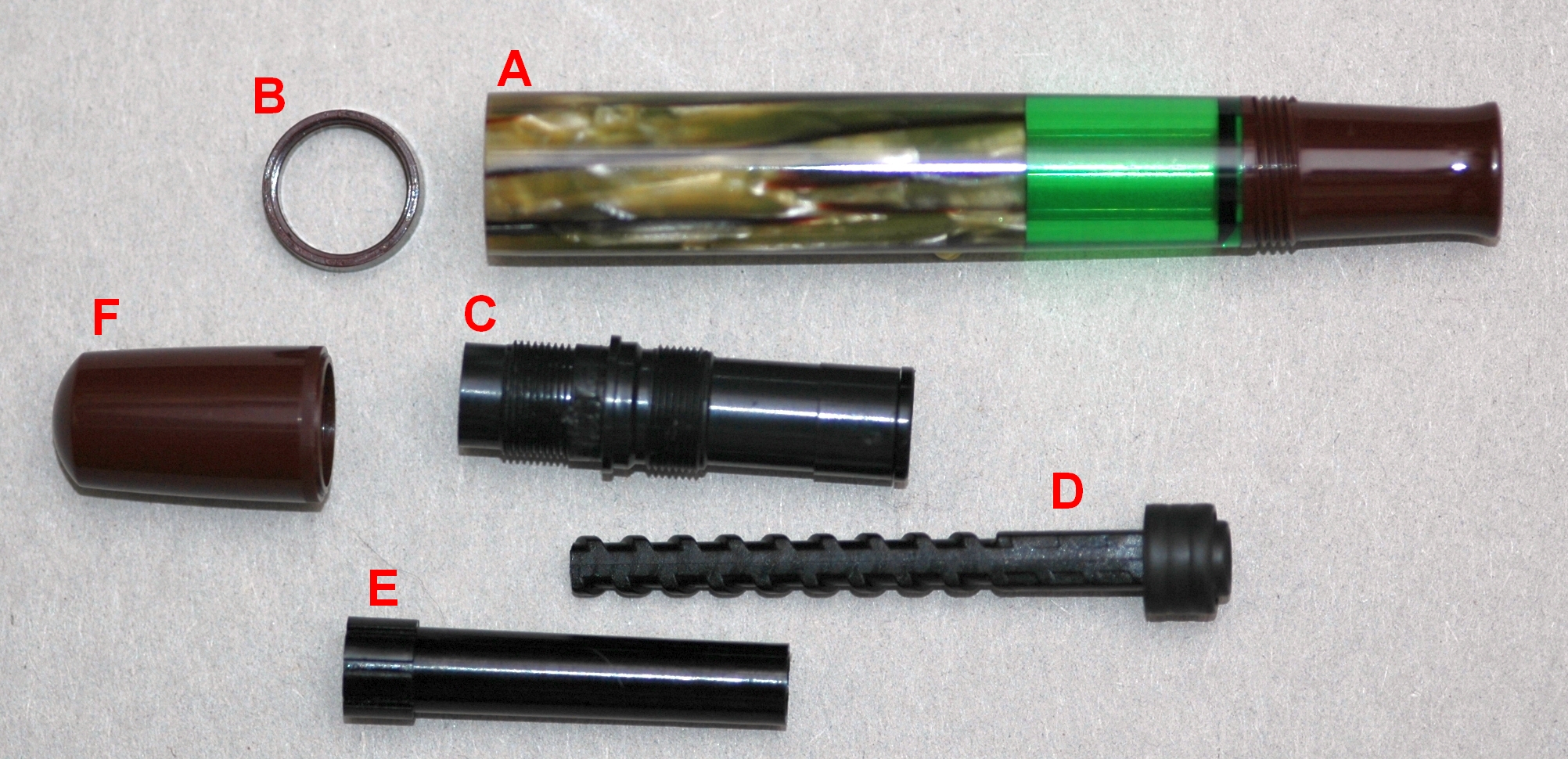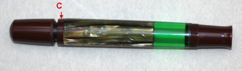 Ho letto la discussione, purtroppo però c'è una differenza sostanziale: nell'altra il gruppo si incastra nel corpo della penna, nella mia invece si avvita (in senso antioriario, nota la filettatura a destra sulla flangia C), il che complica enormemente le cose