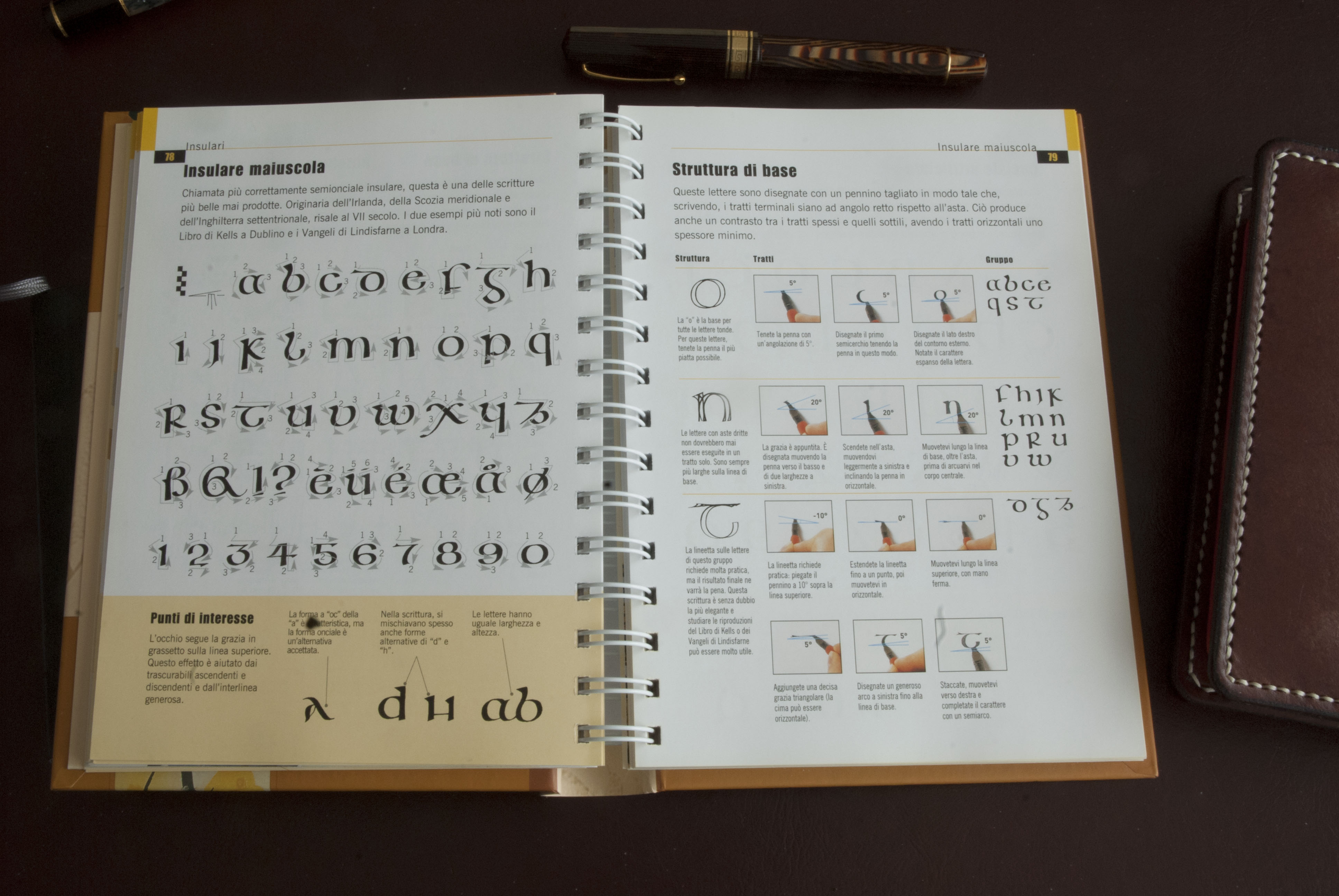 Durante le vacanze natalizie la Enciclopedia é tornata tra le mie mani e per qualche giorno é rimasta ad occhieggiarmi, inusata, sulla scrivania. Infine, l’ho riaperta, per scoprire (cosa che avevo dimenticato) che accanto alla maggior parte delle grafie classiche (nell’esempio sotto potete vedere la “insulare maiuscula”), esistono un buon bumero di scripts piú moderni, da eseguirsi con diversi strumenti di scrittura, includendo pennelli e tiralineee…