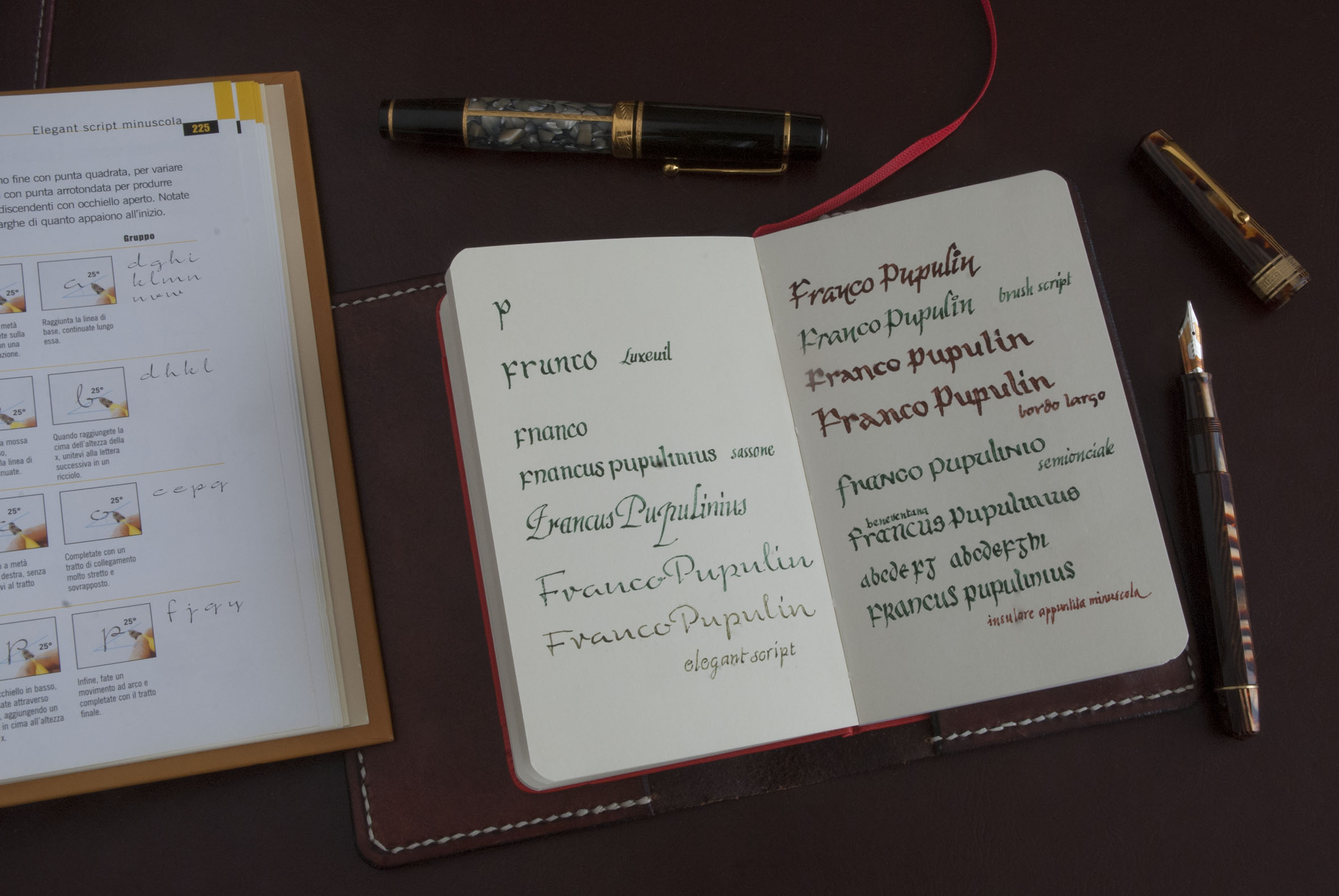 Ho provato (molto grossolanamente, di “prima intenzione") a eseguire alcune delle grafie storiche, insieme ad alcune piú moderne. Molti degli scripts antichi richiedono, per essere riprodotti con migliori risultati, un pennino “tagliato”, o italico, con i bordi sottili per imitare la forma della classica “penna d’oca” e ottenere una maggior distinzione tra le linee orizzontali (sottili) e le verticali (piú spesse). Per questi ho usato il pennino italico medio della mia Montblanc Dumas. Mi piacciono peró molto anche le grafie che possono essere realizzate con una penna stilografica “normale”, con punto di scrittura fine, medio o largo, perché ne prendo spunto per aggiungere elementi alla “scrittura di tutti i giorni”. Per il largo (in inchiostro marrone Omas) ho usato la Omas Paragon, dal cui pennino fuoriesce un fiume di tinta… Per il fine ho messo all’opera la Hemingway con l’inchiostro Diamine Safari, del quale ho accennato in un altro argomento di quest forum.