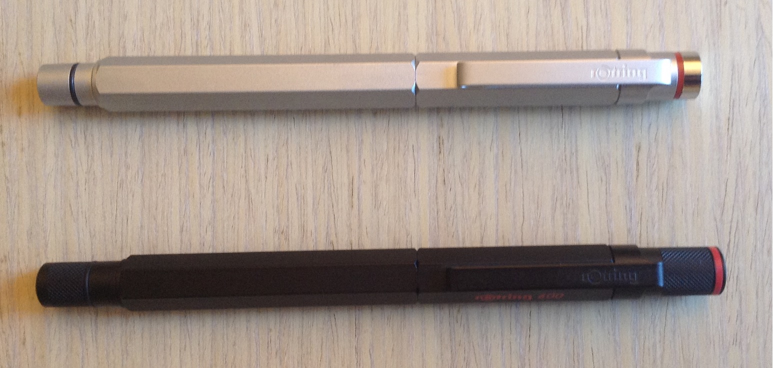 Eccole messe fianco a fianco. Come giudizio davvero "a pelle", posso scrivere che mi sembra una 600 di livello inferiore, con tanti dettagli che la rendono un poco più modesta. Rimane comunque una stilo che mi piace molto, sia per estetica che per doti di scrittura.