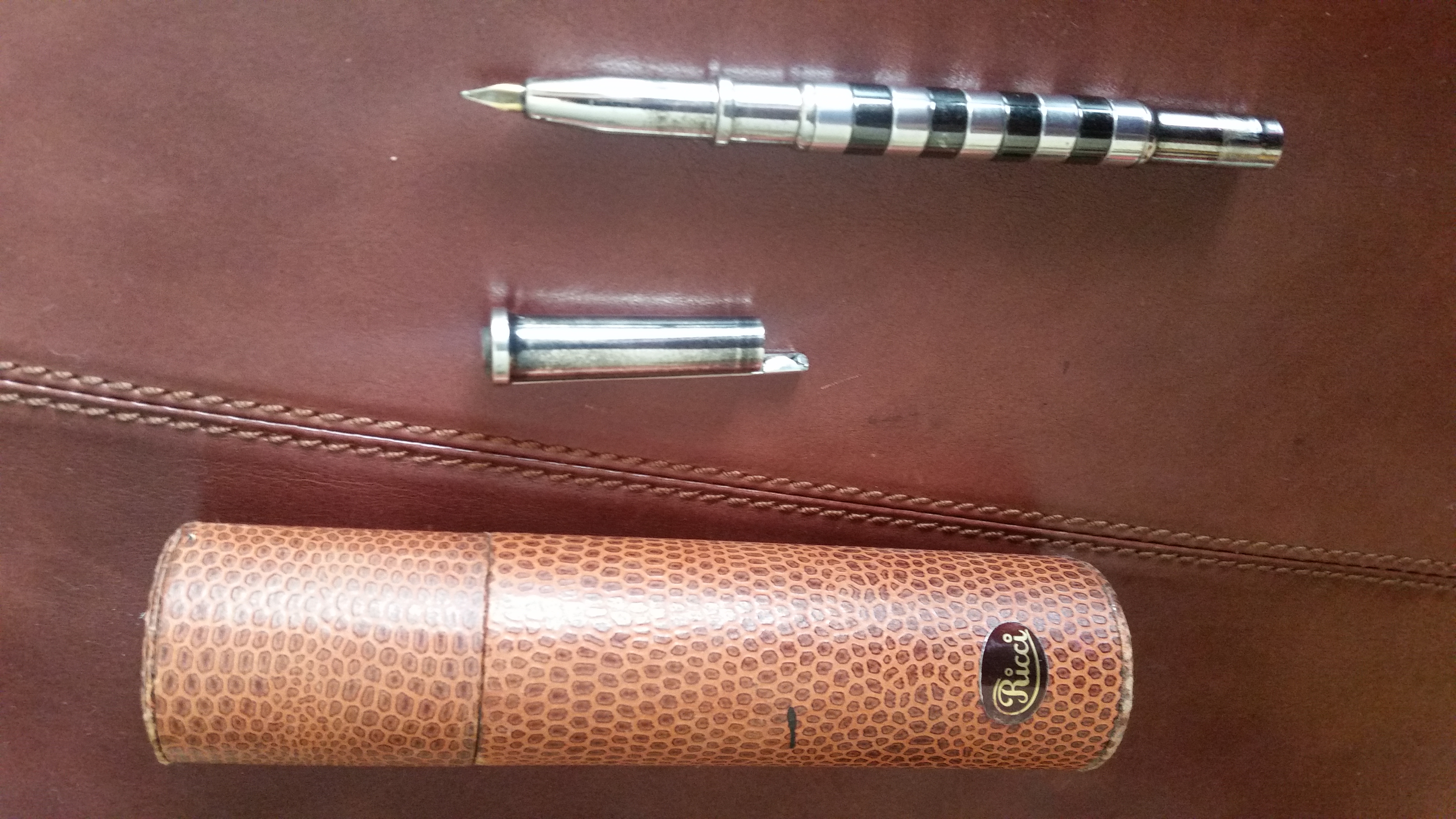 Potrebbe sì! Dunque aggiungo quello che so e che attiene ai miei ricordi personali. Questa penna è appartenuta a mio nonno, che aveva anche una nutrita collezione di cravatte. Una di questa - lo so per certo perché oggi la indosso io - è una Stefano Ricci acquistata da un noto negoziante di abbigliamento catanese. La penna me la regalò, insieme ad una Aurora 88P e a una Marco Polo personalizzata Alfa Romeo, nel 1990. La sua permanenza catanese durò dal 1981 al 1983. Posso quindi affermare che la penna in questione appartiene a quel periodo. Mi fu data ufficialmente "per giocare", ma solo dopo ho capito che lo scopo era quello di farmi familiarizzare con l'oggetto "penna". Meno male che non l'ho ridotta in mille pezzi!! Dentro c'è una cartuccia Sailor ormai secca che ho lavato e riempito di Quink nero. La penna scrive dignitosamente anche se è pesantissima nonostante le dimensioni. L'ho lucidata con Argentil ma qualche macchia ha resistito. Purtroppo sul fusto e sulla.sezione non ci sono marchi di nessun tipo.