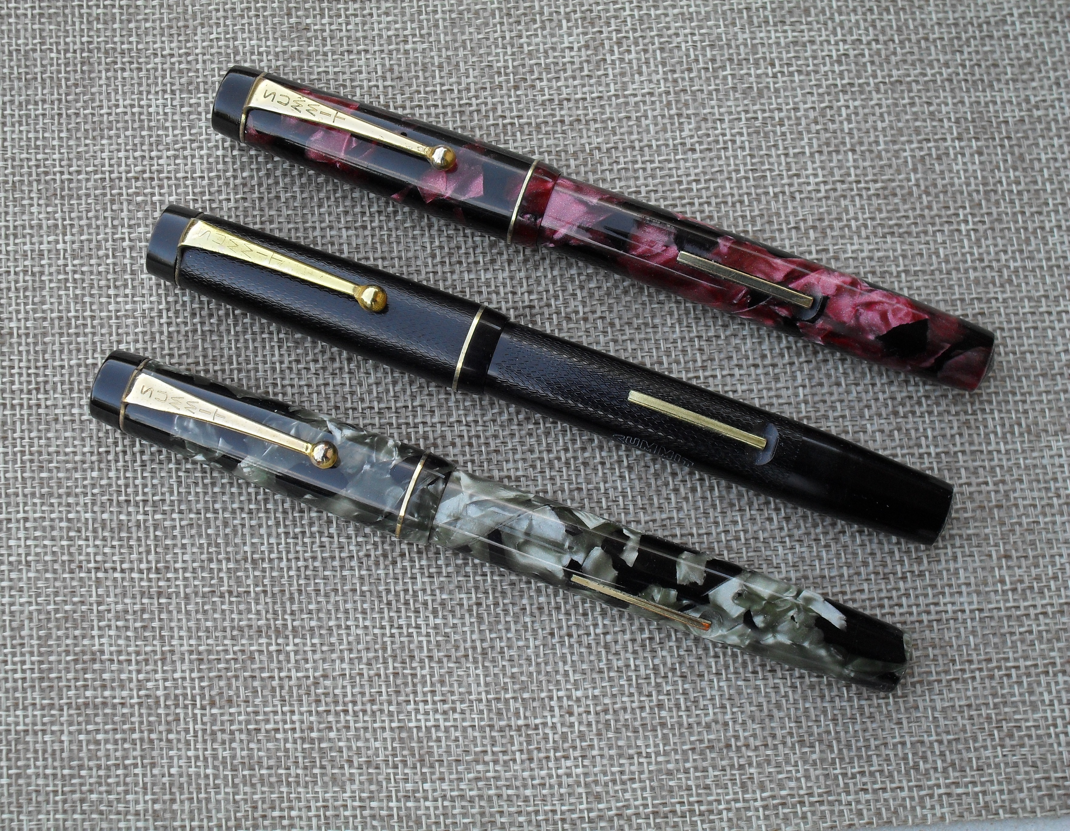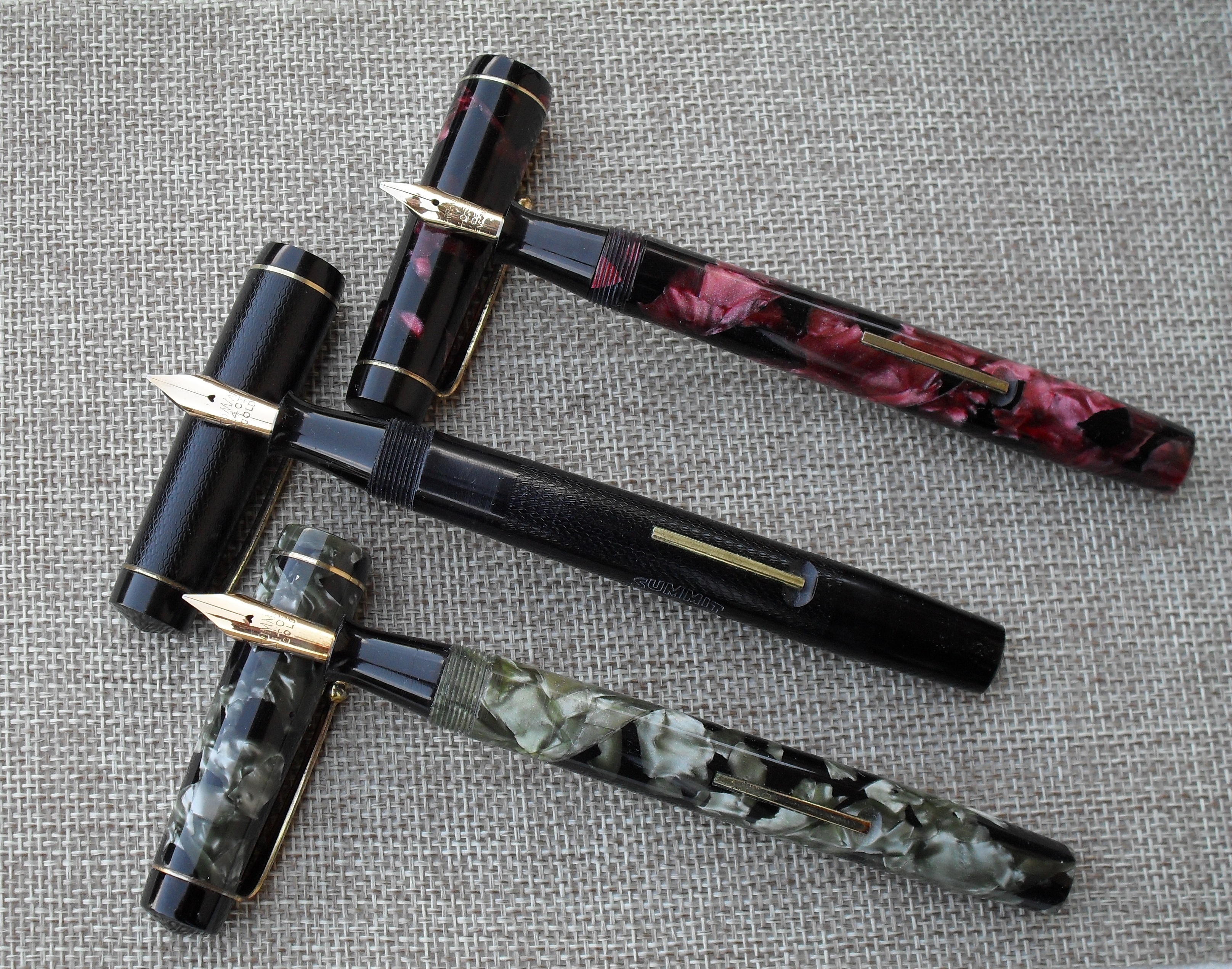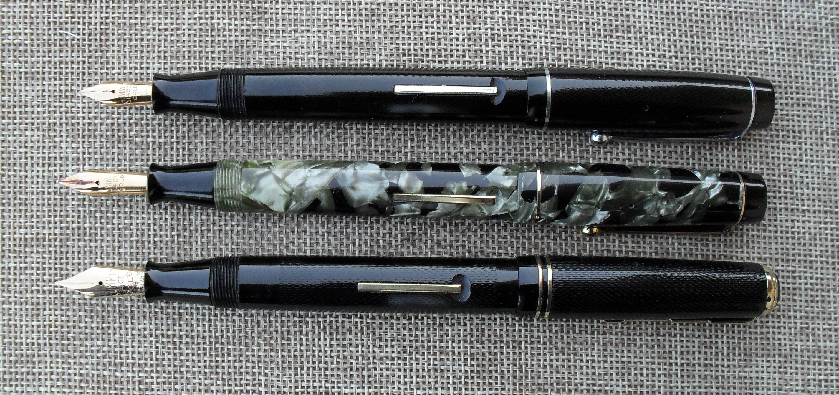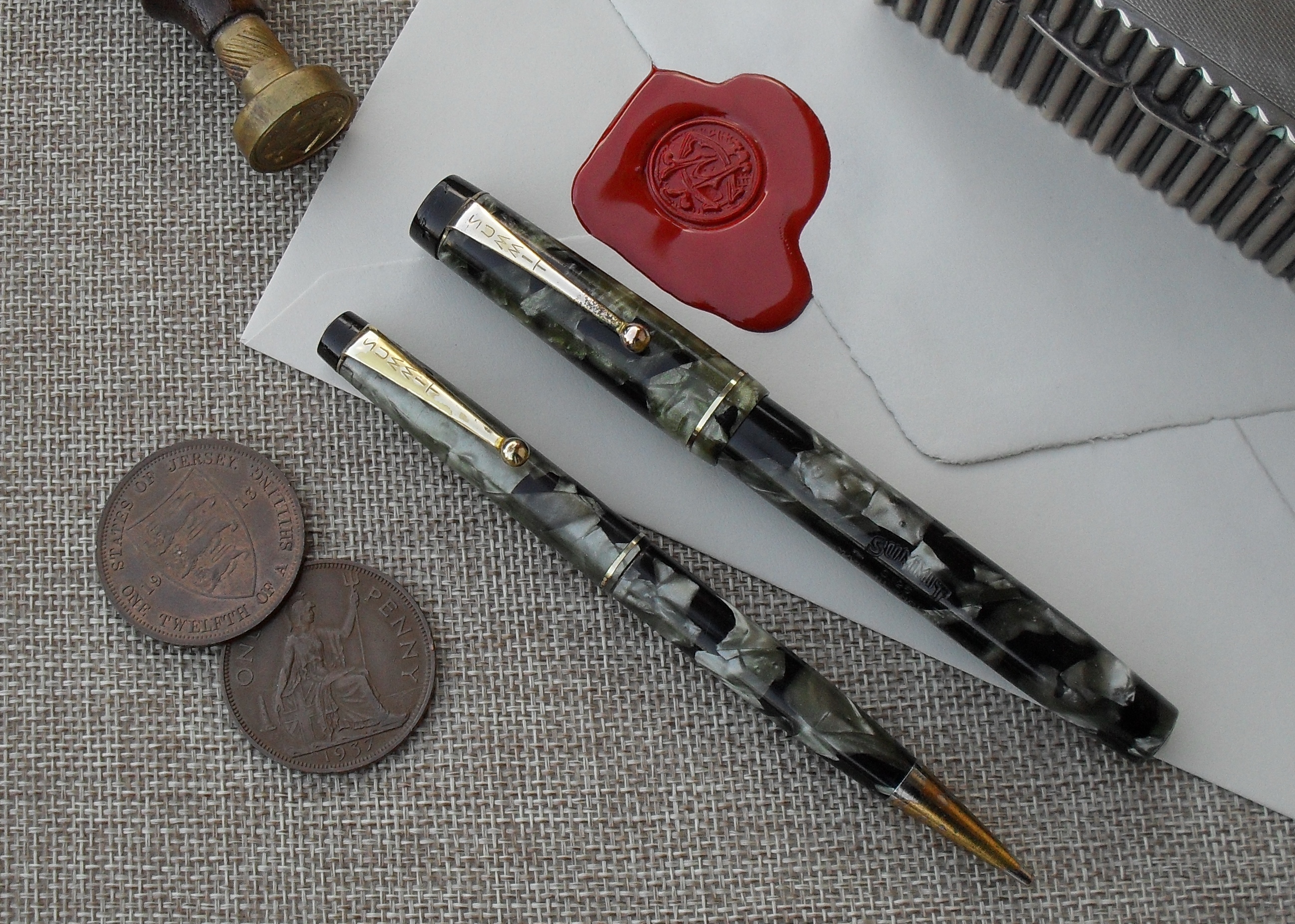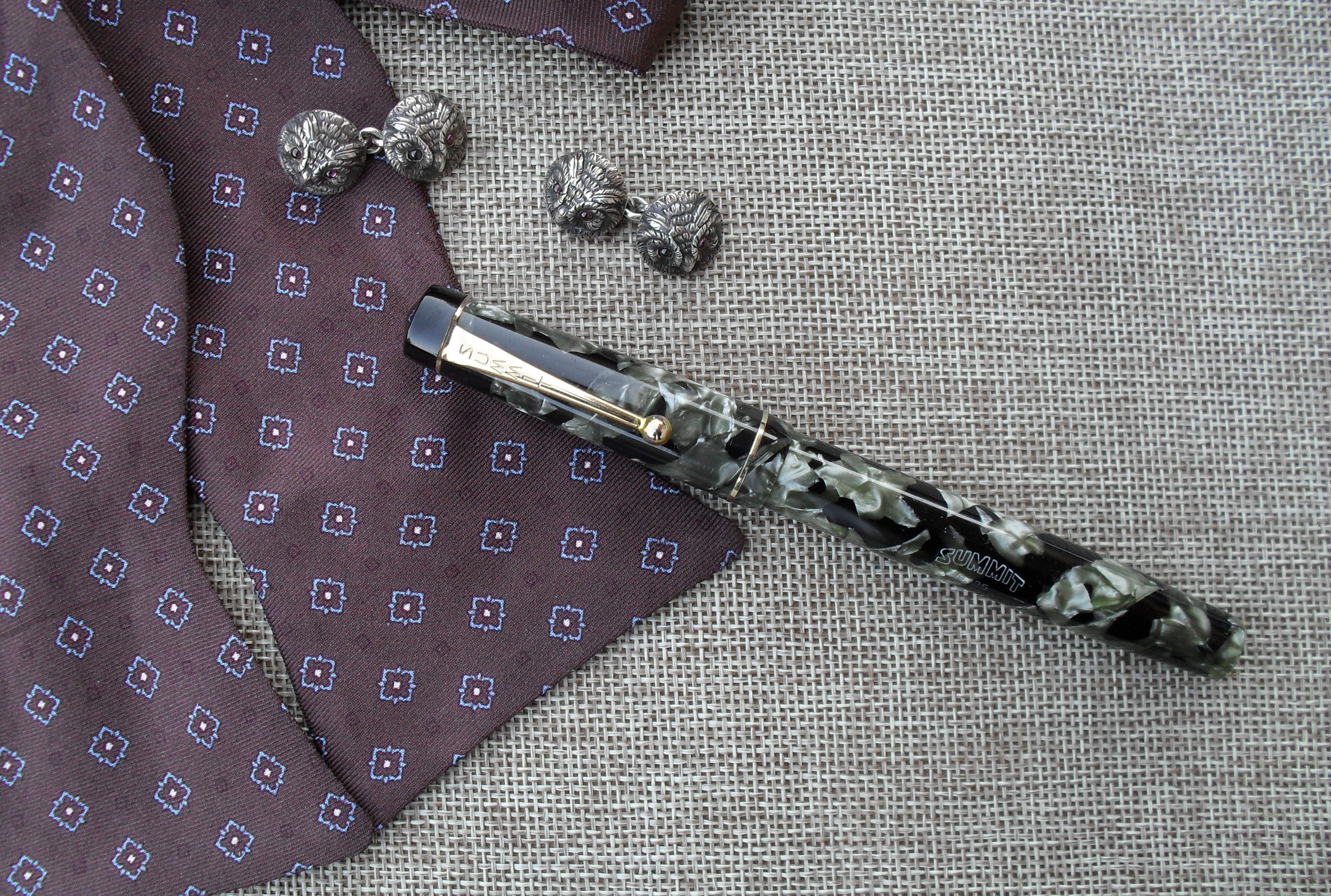 E’ il caso della stilografica che vedete, una Summit S.125 mk 1 degli anni Trenta, in celluloide marmorizzata verde e nera, con pennino in oro a 14 carati, alimentatore e testa del cappuccio in ebanite e sistema di caricamento a levetta laterale. La sigla “Mk 1”, che sta per “versione 1”, distingue questa versione dalla successiva, commercializzata dopo la seconda guerra mondiale; non è ancora chiaro se fosse utilizzata ufficialmente dalla casa produttrice ma per ovvie ragioni non è riportata sulla penna, che reca sul fusto, secondo il tipico stile Summit di quegli anni, la scritta su tre livelli “Summit - S.125 - made in England”. Il modello 125 era per così dire quello mediano nel catalogo Summit e si distingueva dagli altri soprattutto in funzione della misura del pennino, più grande di quello della S. 100 ma più piccolo, almeno dopo il 1935, di quello della S.175. A parte questo aspetto, la qualità era la medesima per tutti i modelli. Ai miei occhi, la celluloide di questo esemplare è spettacolare, con riflessi davvero ammalianti e di un colore perfettamente adatto anche all’uso maschile.