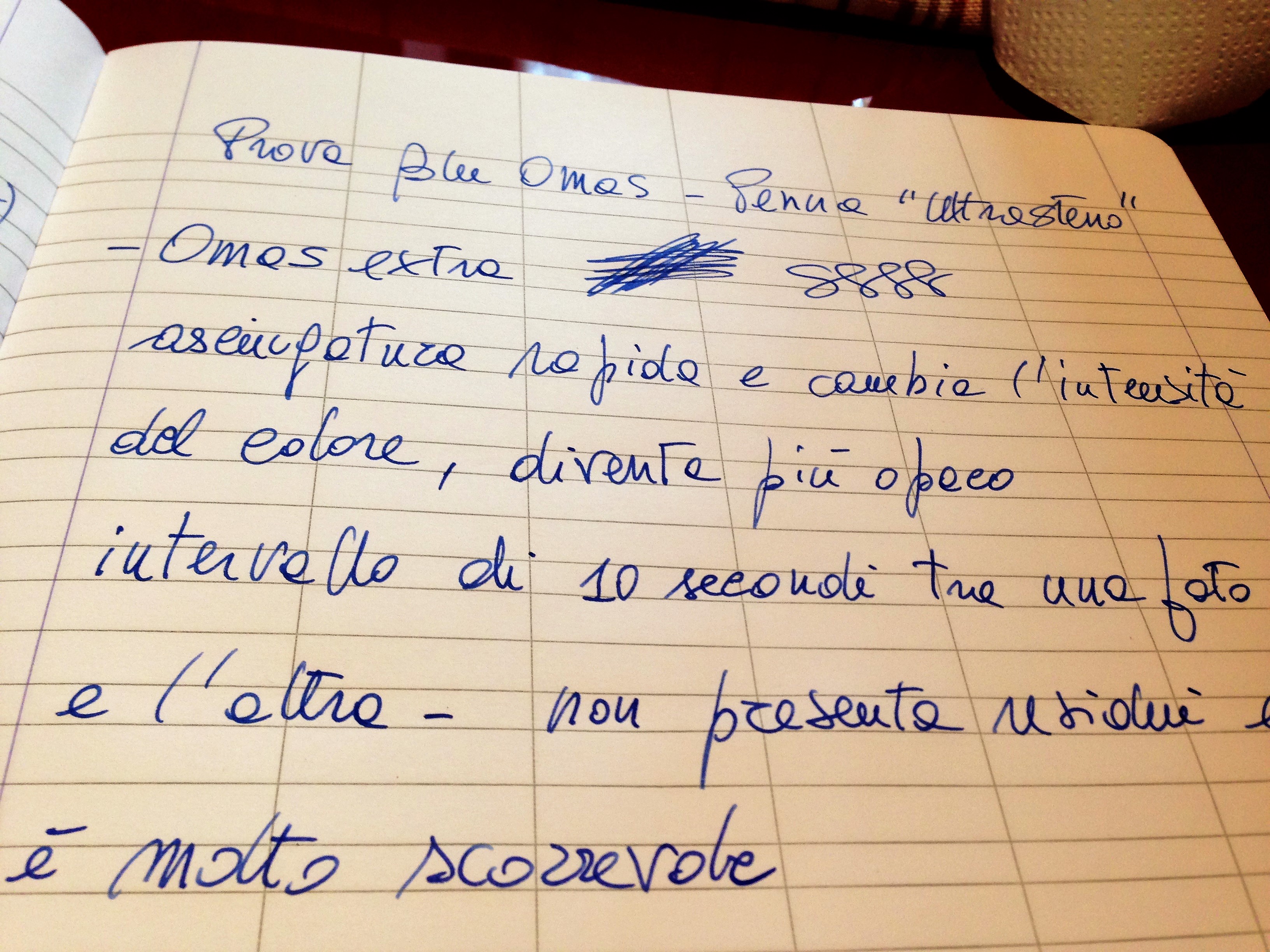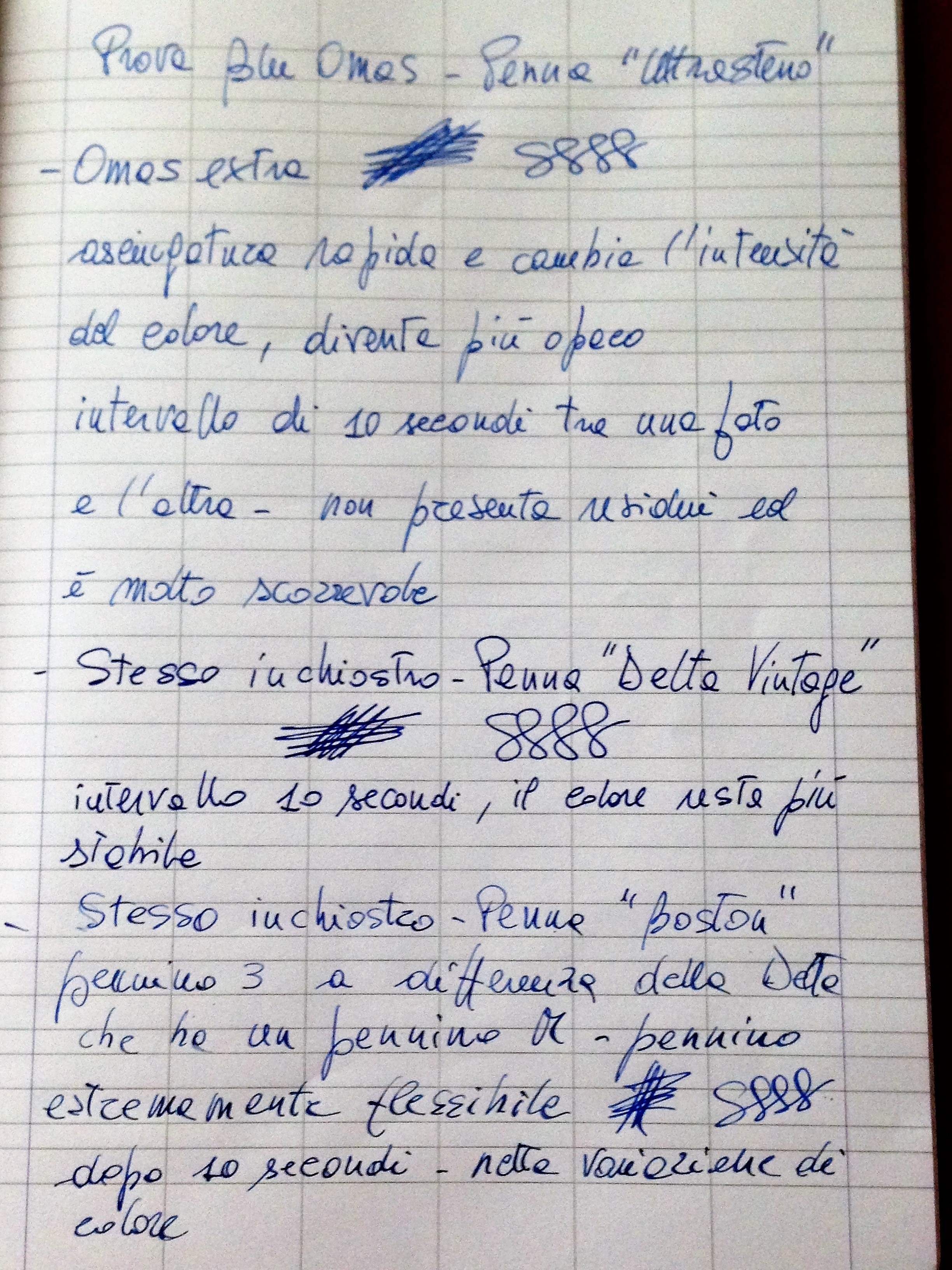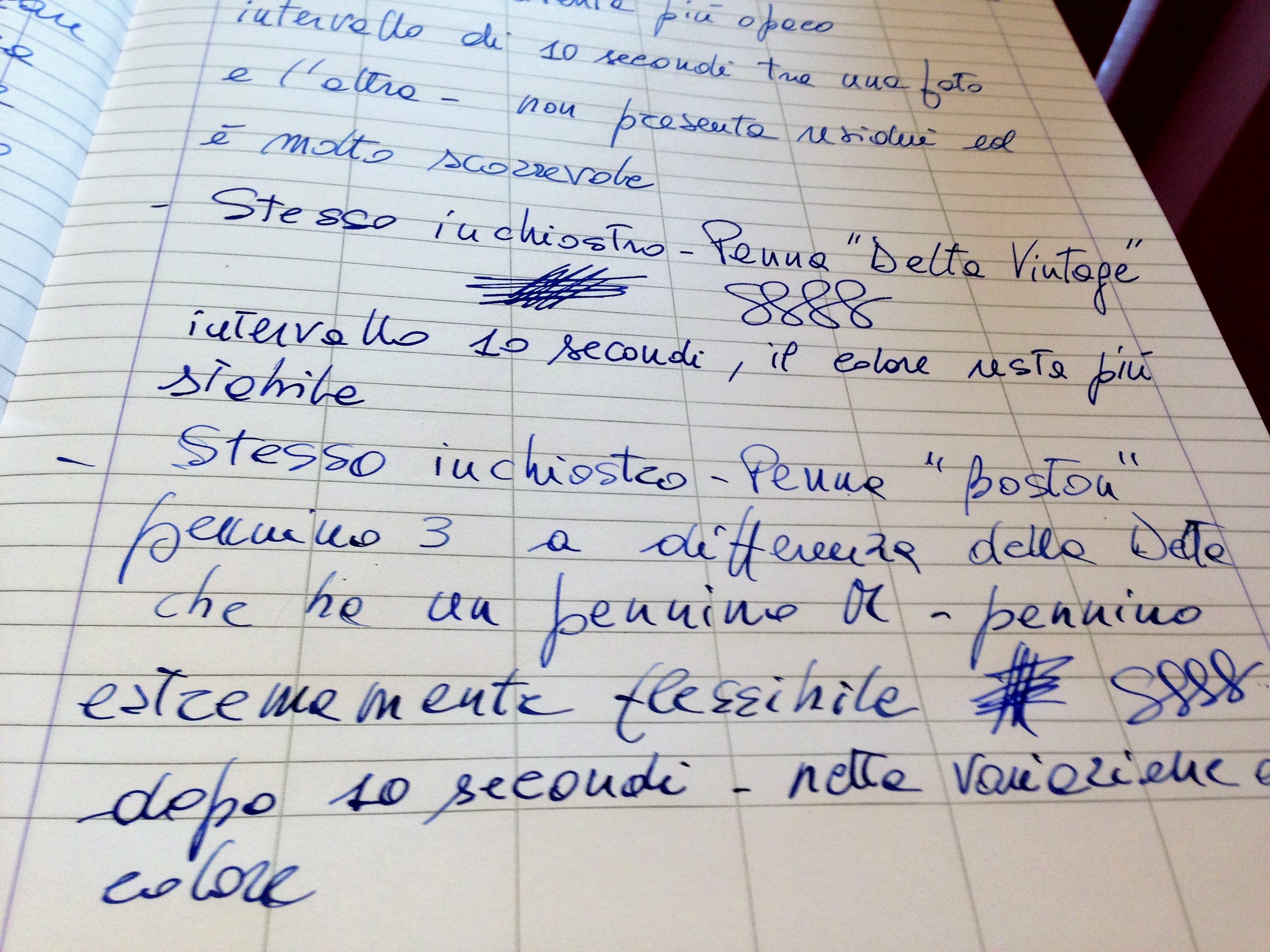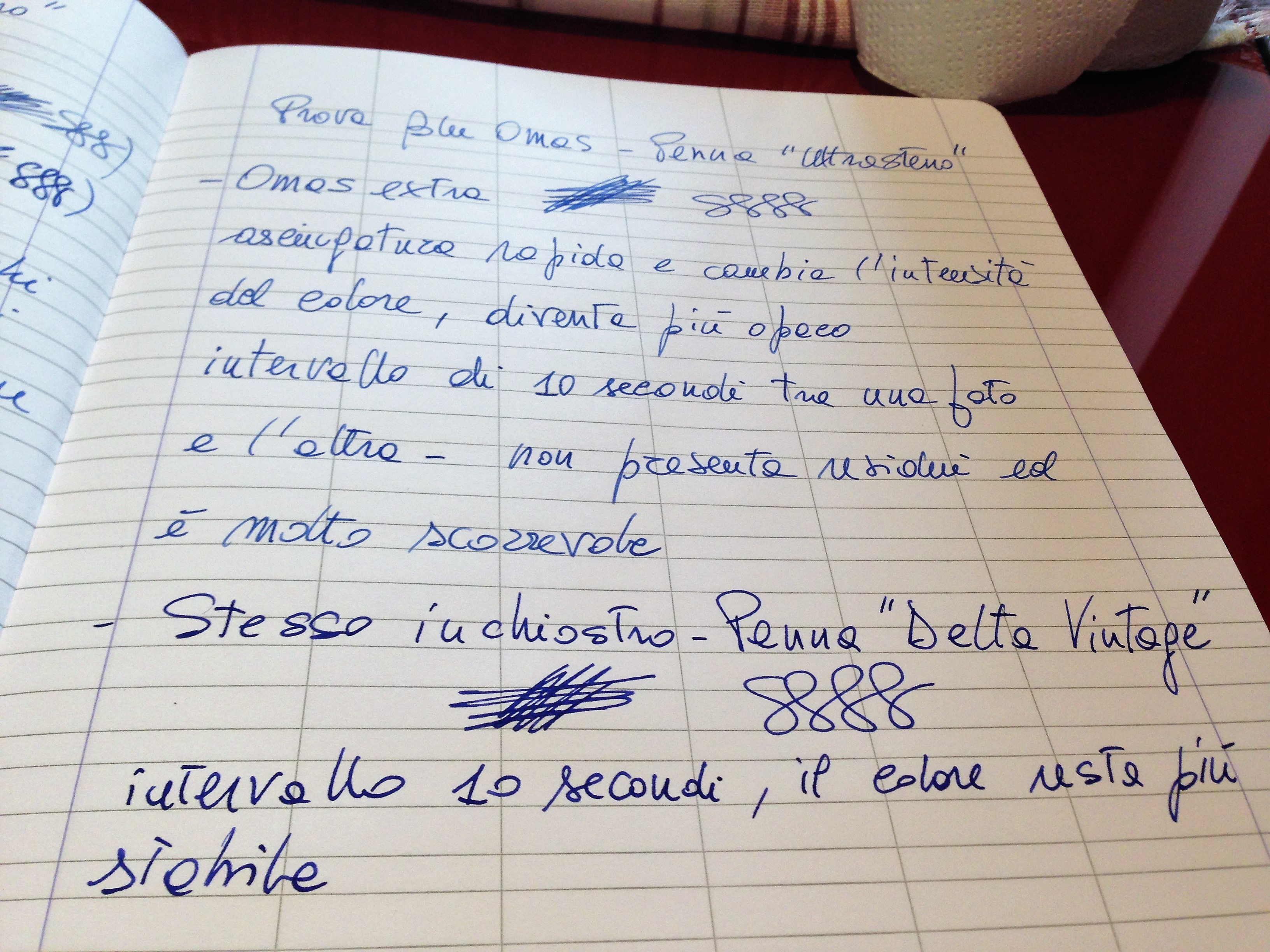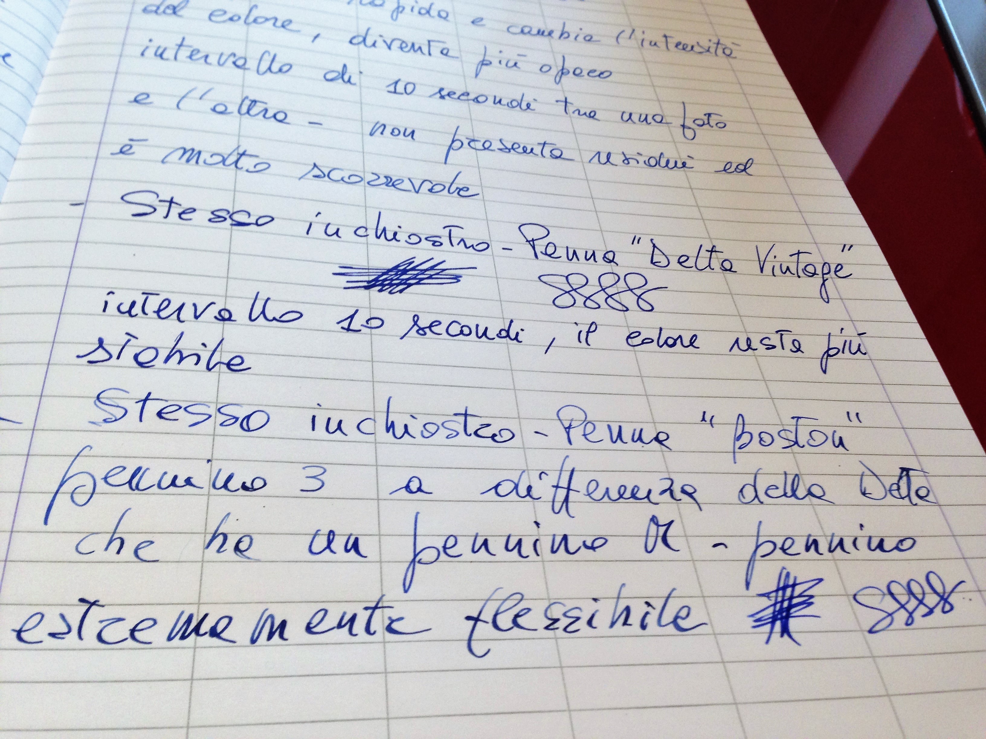 Avevo già provato i due inchiostri e cromaticamente sono identici, entrambi perfettamente conservati senza tracce di residui, tanto che ho caricato con tranquillità la Delta Vintage Bianca che sto usando, è carica da venerdì, se ne sta tranquillamente sul tavolo in orizzontale, la uso per tutti gli appunti e riparte senza nessuna indecisione, come vedrai dalle foto è una delle penne che ho usato per fare le prove, le altre due penne sono state usate per intinzione.