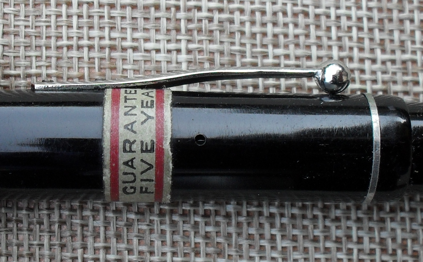 Interessante il dettaglio dell’adesivo originale, che circonda ancora il cappuccio e che menziona la durata della garanzia: 5 anni. I colori dell’adesivo riprendono coerentemente quelli scelti dal gruppo sin dagli anni Trenta per le scatole ed i fogli d’istruzione delle penne a marchio “Summit”: l’avorio, il nero ed il rosso.