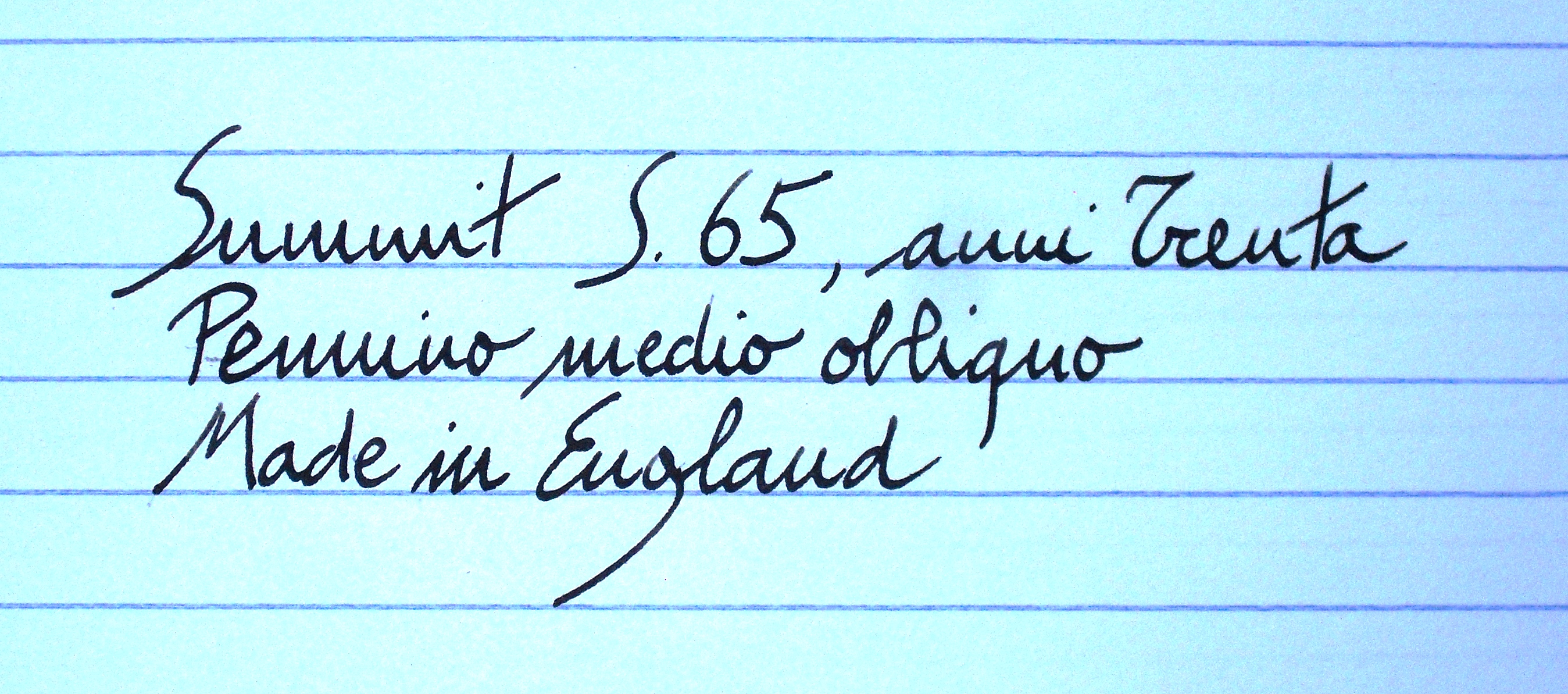 La scrittura si rivela pronta, esente da difetti, con un bel flusso. Il pennino, un bel medio obliquo anche se piuttosto piccolo, non è flessibile, ma abbastanza morbido, secondo la migliore tradizione Summit. Il bilanciamento è ottimo, anche con il cappuccio calzato. Il sistema di caricamento a leva laterale, pratico e semplice, promette efficienza e ben pochi problemi manutentivi.