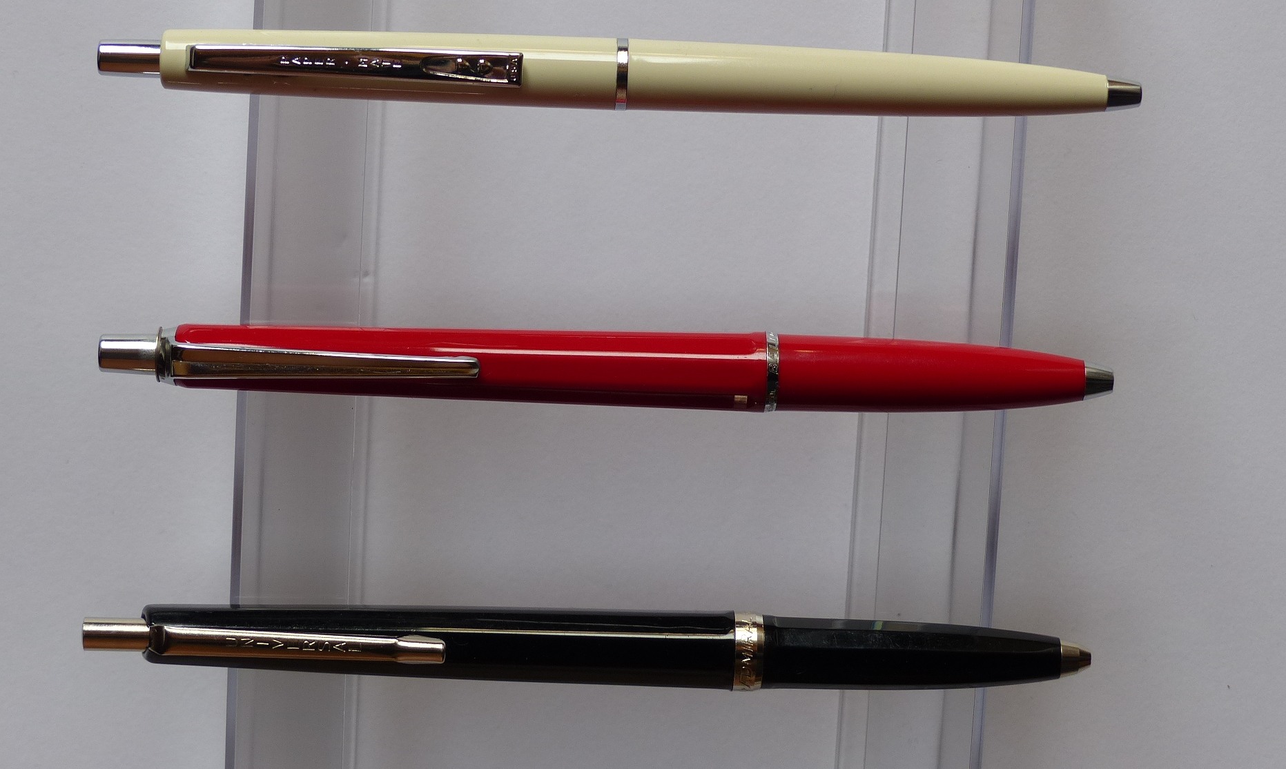 Qualche giorno fa mi sono fermato in una vecchia cartolibreria per vedere se aveva qualche stilo. Niente stilografiche ma invece mi sono imbattuto in queste 3 penne a sfera degli anni 70/80, nuove e con confezione originale: quella rossa è una Ballograf, quella bianca una Papermate e quella nera una Universal.