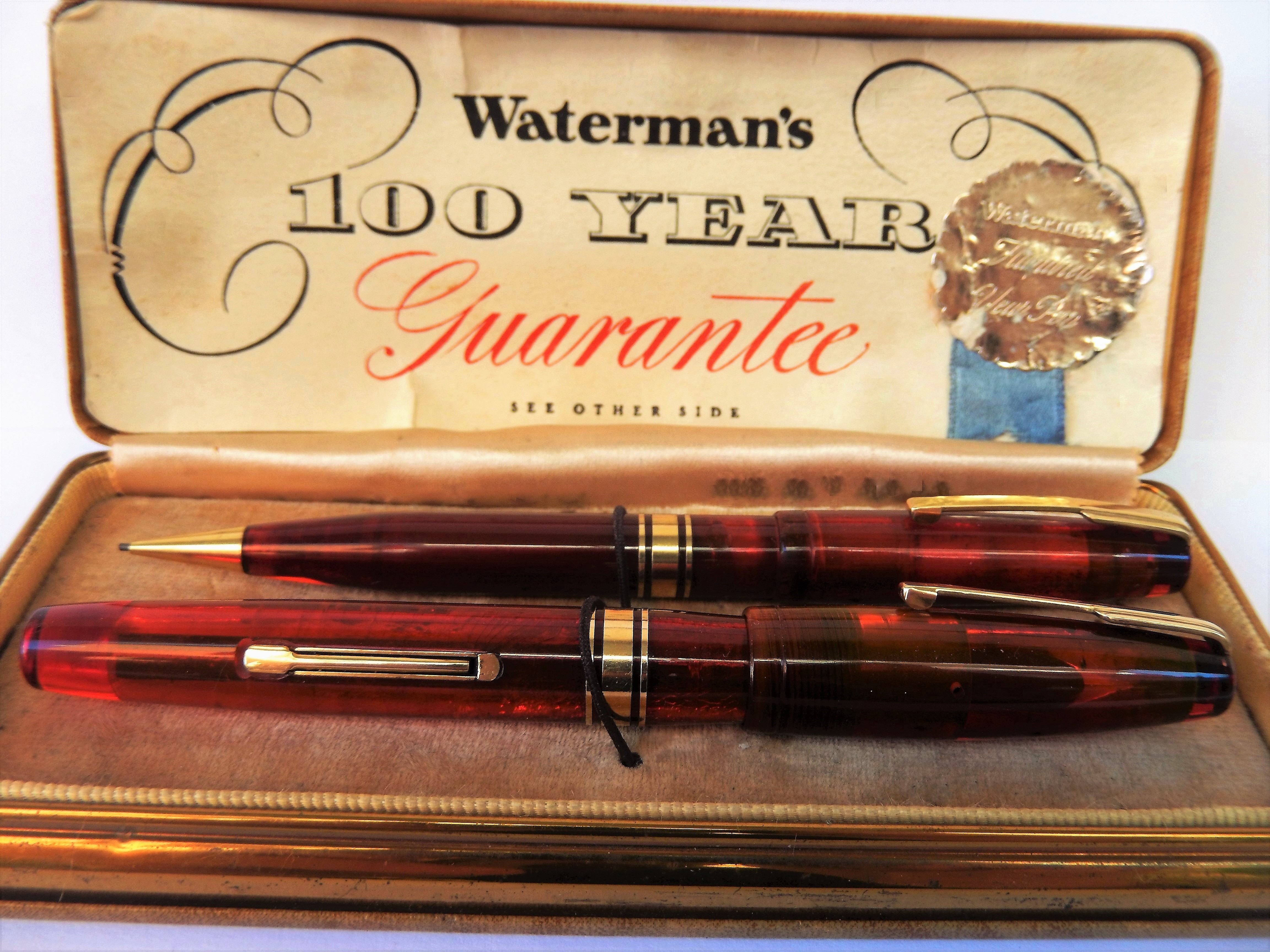 Vorrei oggi presentarVi questo set Waterman, composto da due " rosse " che mi stanno particolarmente a cuore. Il set è giunto ai nostri giorni ancora completo della scatola originale e della garanzia, con tanto di argentea coccarda, garanzia alla quale deve il nome e che stando alle promesse iniziali avrebbe dovuto essere valida ancora oggi e per altri 25 anni circa.