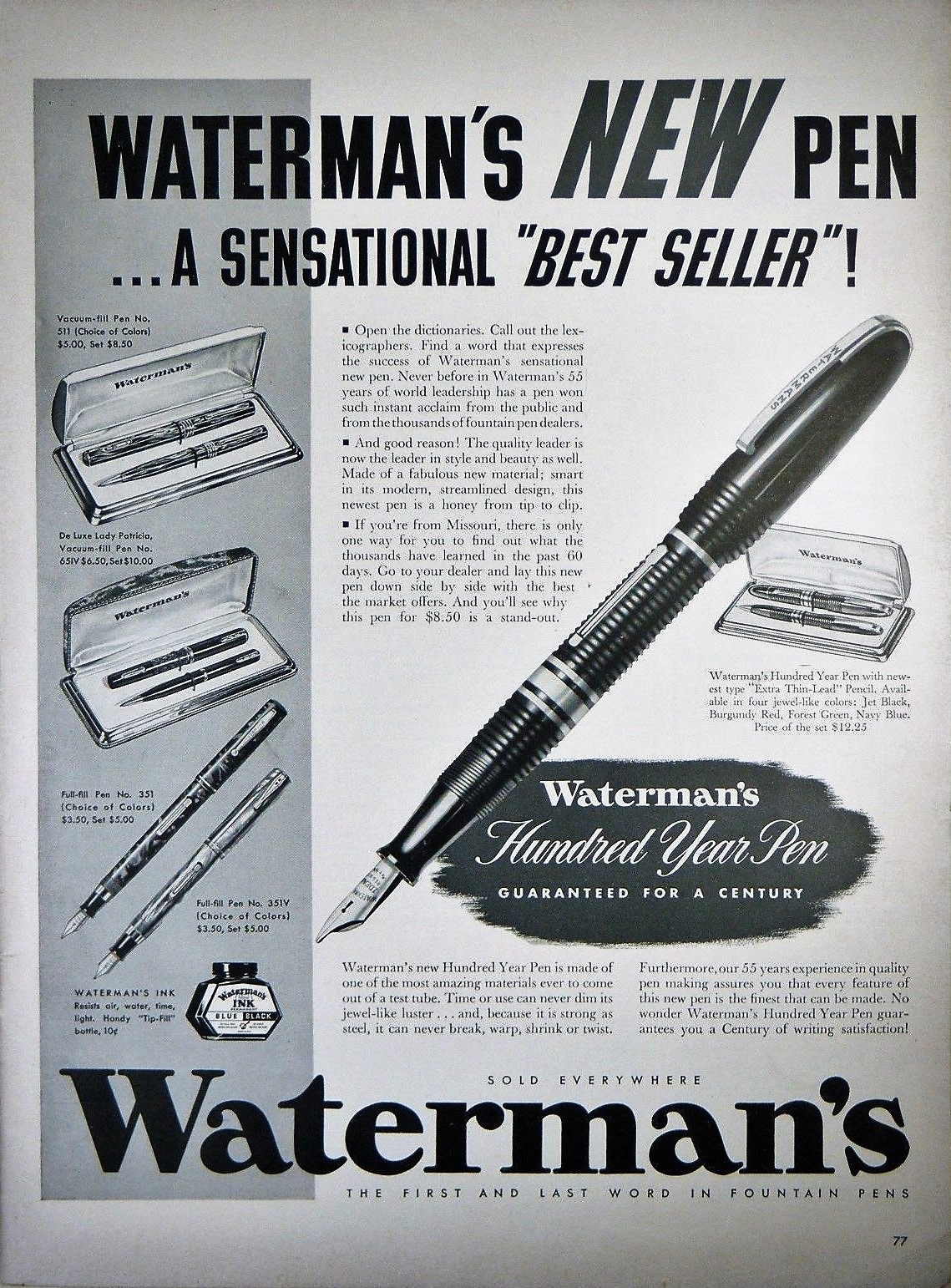 Year fu commercializzata dalla fine del 1939 , dunque un paio di anni prima della Parker 51 e della Skyline. Il modello, tradizionale nel sistema di carica, ma innovativo sia nel materiale usato che nel disegno, fu una invenzione del grande John Vassos, un geniale designer nato nel 1898 in Romania da genitori greci. Il giovane John fino ai 16 anni visse a Costantinopoli, dove all'epoca il padre lavorava, manifestando ancora ragazzo una grande passione e talento per il disegno. Le cronache raccontano che però dalla Turchia dovette precipitosamente fuggire a causa di alcune sue vignette giudicate irrispettose della autorità politica e che gli stavano per costare l' arresto. Si arruolò dunque come marinaio su un mercantile britannico, girovagando in quegli anni di guerra i mari fra l'Europa ed il Medio Oriente. A 20 anni emigrò negli Stati Uniti, a Boston, dove inizialmente si mantenne facendo il lavavetri ed il pittore di insegne pubblicitarie, ma riuscendo contemporaneamente a frequentare i corsi serali di una nota scuola d'arte. Cominciò cosi a farsi conoscere fino poi a trasferirsi a New York dove fu consacrato il suo successo. A lui si devono sia progetti industriali, come i tornelli della metropolitana ed i primi televisori, sia importanti lavori grafici come l'illustrazione in stile art decò di alcune opere di Oscar Wilde fra cui, trenta anni dopo la originaria versione di Beardsley, la Salomè Ma lasciamo Salomè ad attendere che le sia servita la testa del profeta e torniamo alla Hundred Year. La prima serie fu prodotta in quattro colori ( rosso , verde, blu e nero ) in una unica misura ed utilizzando una nuova resina particolarmente luminosa, chiamata " lucite". Inizialmente il prezzo di vendita era di 8,50 dollari per la penna e 12,25 per il set, come si evidenzia in questa pubblicità apparsa nel febbraio del 1940 sul Life Magazine, che, se utile, è
