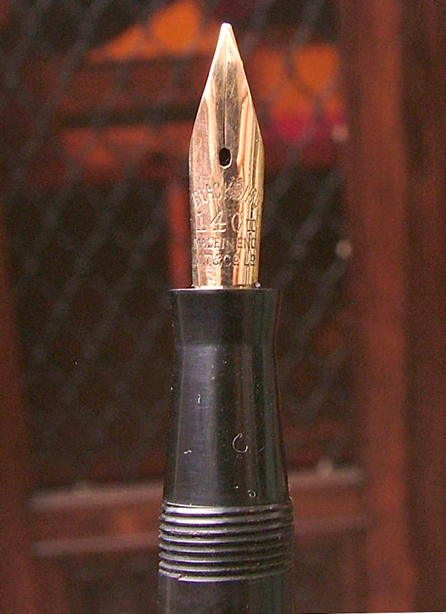 Per l'anno di costruzione dovete aiutarmi, credo sia degli anni '20 ma vado a naso, il pennino è con il foro a pentagono, ne ho viste altre su Wiki mail foro sul pennino su una è a cuore, sull'altra di forma circolare.