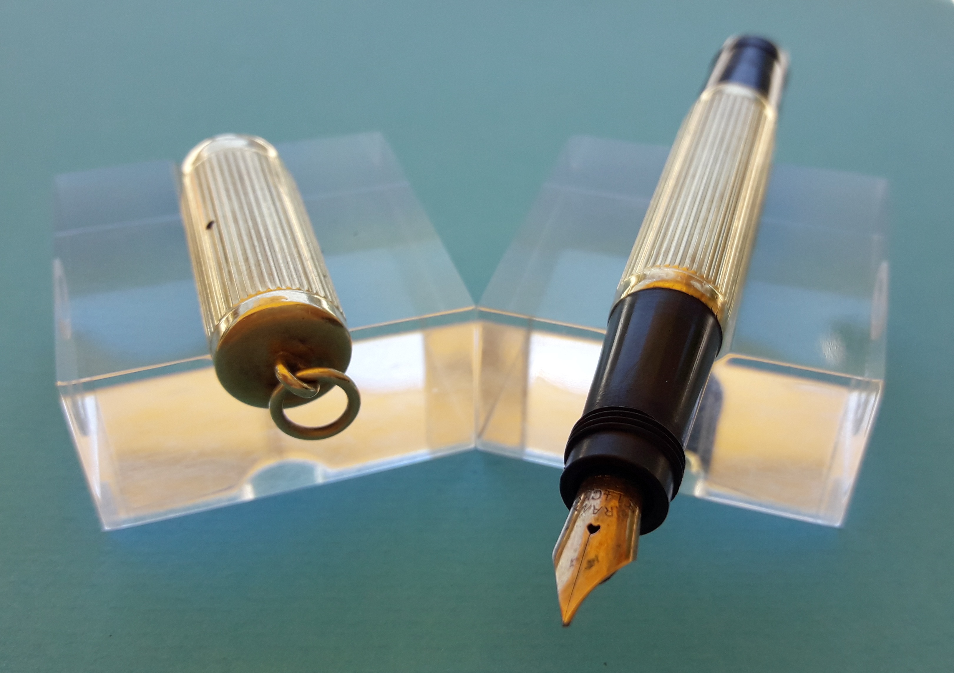 Purtroppo, a questa bella penna manca il pennino originale, sostituito (già all’epoca, si direbbe) con un Warranted in oro 14 Ct. che, come potete constatare, svolge comunque egregiamente il suo compito, permettendomi di impugnare con gioia e soddisfazione il mitico strumento…