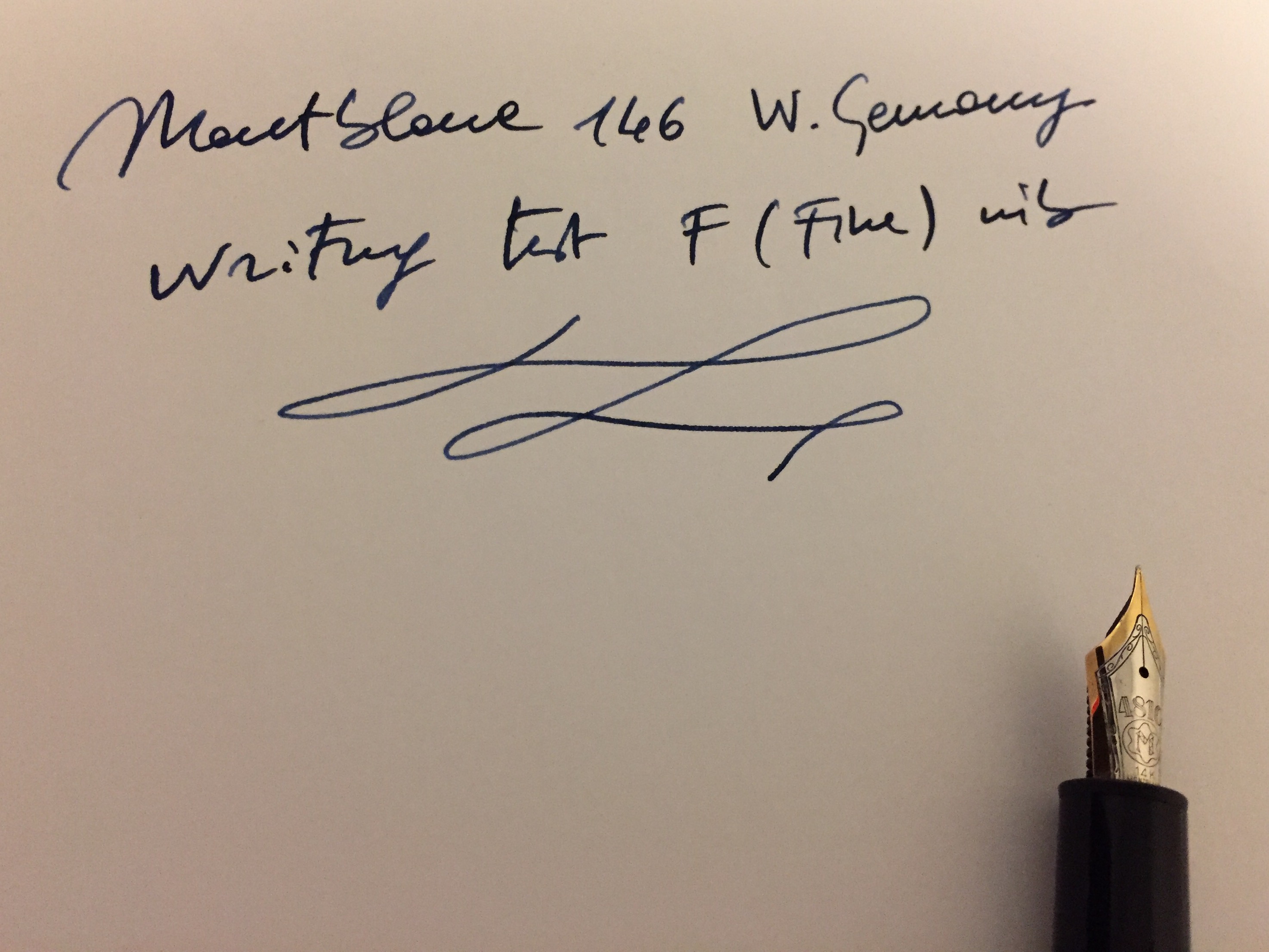 Ecco la prova di scrittura. Sono sempre un po' perplesso sui pennini fini perché mi é già capitato che il flusso non sia perfetto, il medio mi dà più garanzie (poi dipende dalla marca, coi pennini F di Waterman, Aurora e Pelikan per esempio mai avuto problemi, Montblanc a volte hanno incertezze). Questa invece ha un pennino F ma non perde mai il tratto.