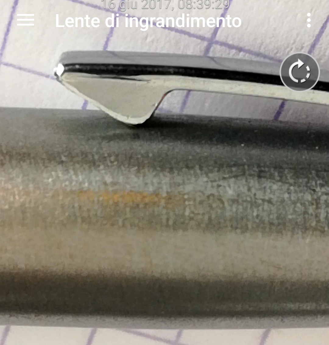 Sotto la clip si vede un segno giallo che sembrerebbe un materiale sottostante che affiora. E allora il cambio di colore Non vorrei fosse lo strato superficiale assottigliato, come spesso capita per esempio ai manici dei rasoi vintage.