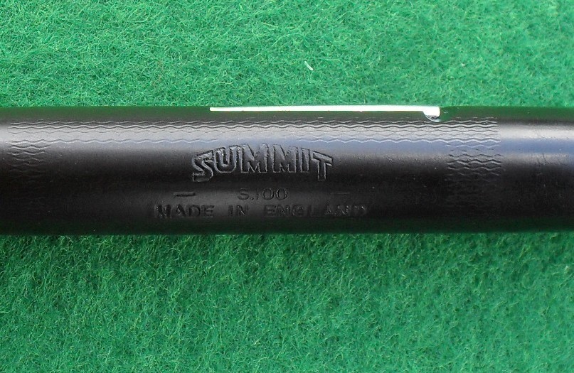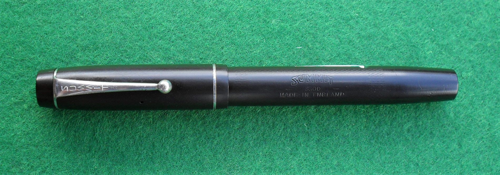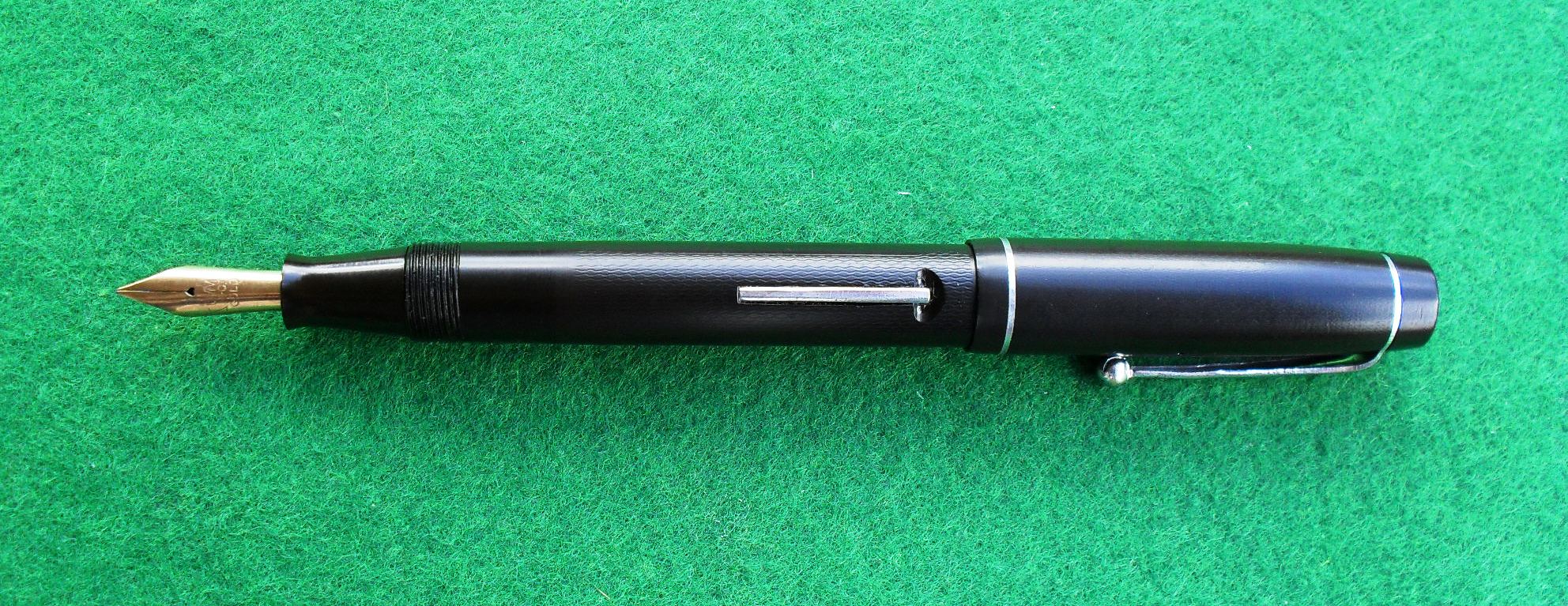 Questa volta si tratta di uno dei modelli più conosciuti sul mercato inglese degli anni Trenta: la Summit S.100. L’esemplare che mi è capitato fra le mani non è in cattive condizioni, anche se, come potete vedere dalle immagini, richiede notevoli cure estetiche. Corpo e cappuccio sono infatti d’ebanite, mentre la sezione è in celluloide. Il pennino è un classico Summit d’oro a 14 carati, morbido e ben proporzionato.