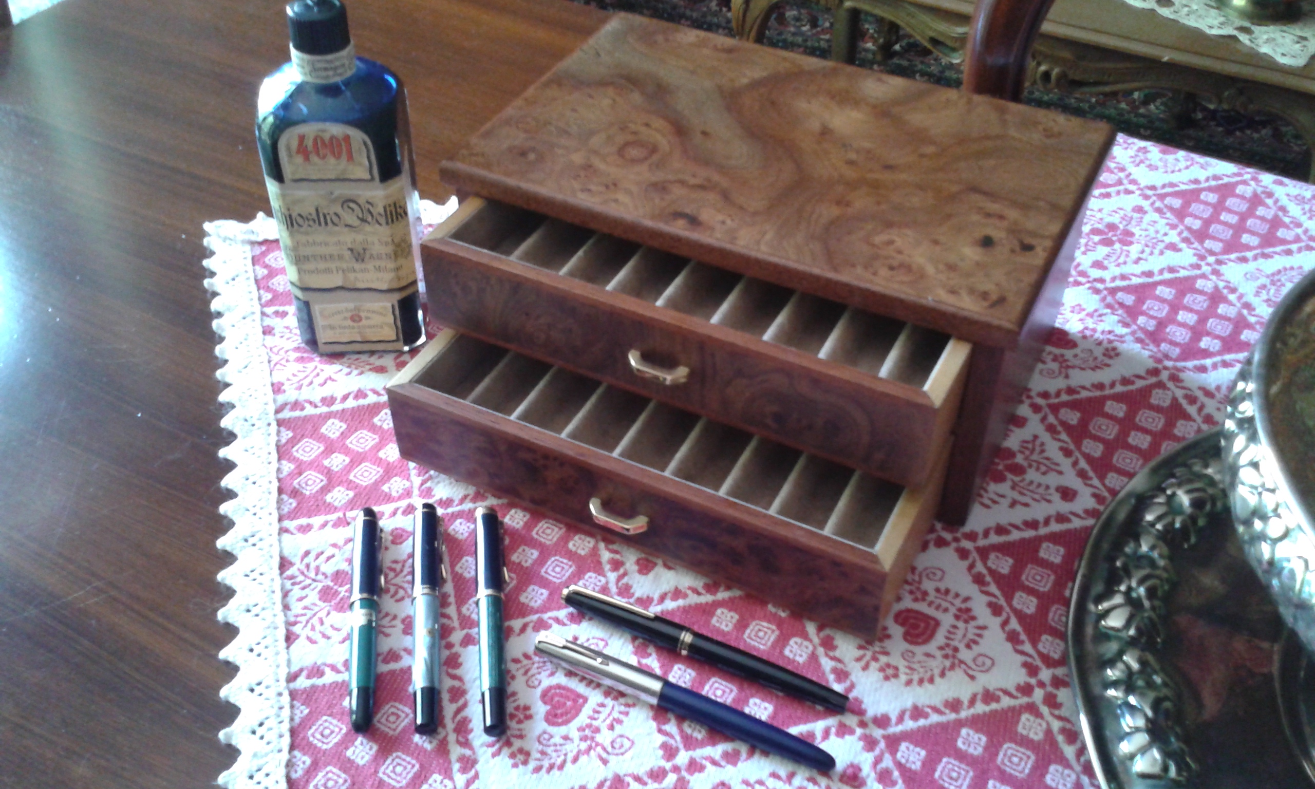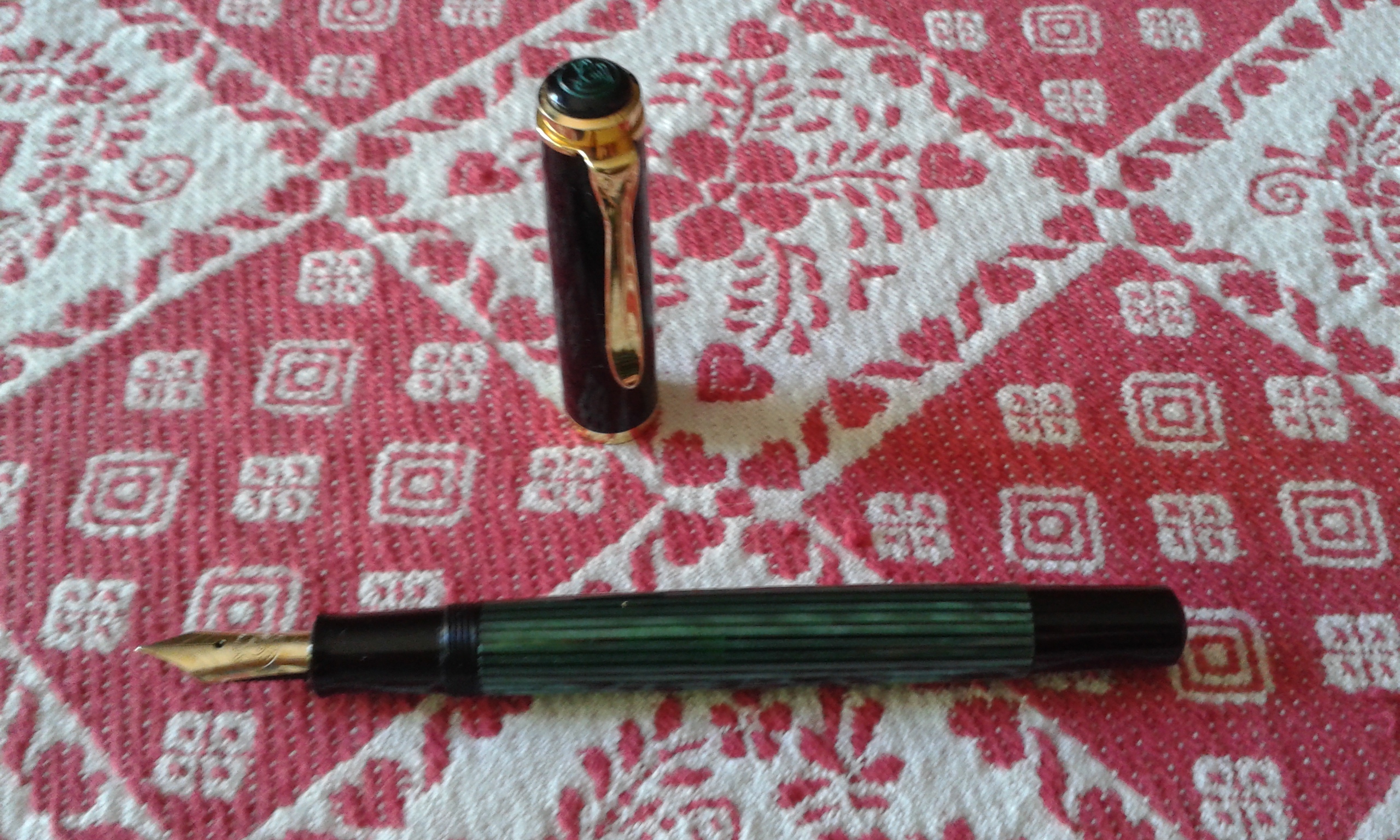 Ecco più di una generazione a confronto, inchiosto Pelikan 4001 blue-nero fabbricato dalla Spa Gunther Wagner, prodotti Pelikan-Milano, Bottiglia in vetro di forma quadrata, da 1/2 litro ancora fluido e forse utilizzabile databile anni 50(?); Pelikan 120 ancora con bollino su fusto in buone condizioni; Pelikan M200 Grigio marmorizzato seminuova; Pelikan M400 praticamente quasi nuova; MontBlanc Generation in ottime condizioni con converter originale MB ; Parker a pulsante di fondo, pennino oro, funzionante ma non conosco il modello e anno di produzione; matita meccanica Waterman funzionante anche dI questa ignoro il modello. Ho trovato anche un porta penne in legno, da 18 posti, mi è sembrato molto carino.