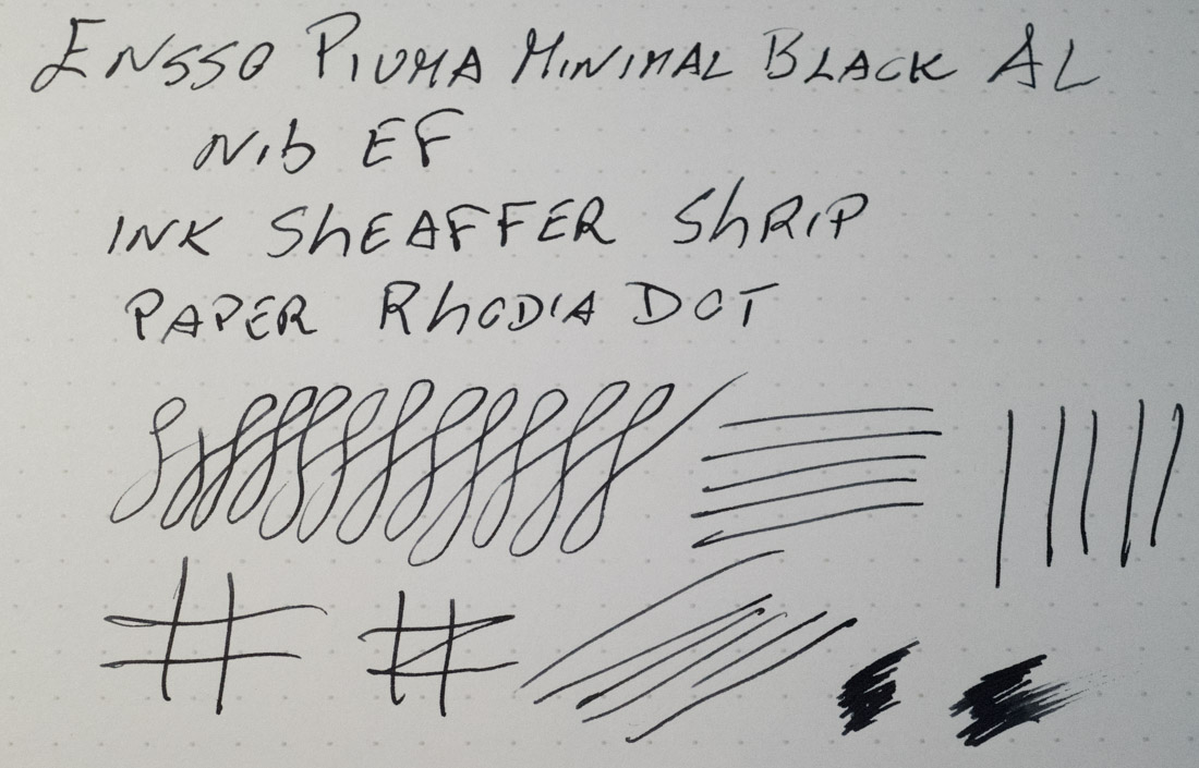 L'esperienza di scrittura è molto piacevole con una bella sensazione di metallo. La scrittura del pennino EF con inchiostro Sheaffer Shrip è stata piacevole anche se ha dato l'impressione di non avere sempre un flusso costante, probabilmente merita un rodaggio maggiore e forse renderebbe al meglio con inchiostri tipo il Diamine, tutto sommato si è comportata bene anche se il tratto è sicuramente un EF di tipo europeo e non certo paragonabile all'EF giapponese.