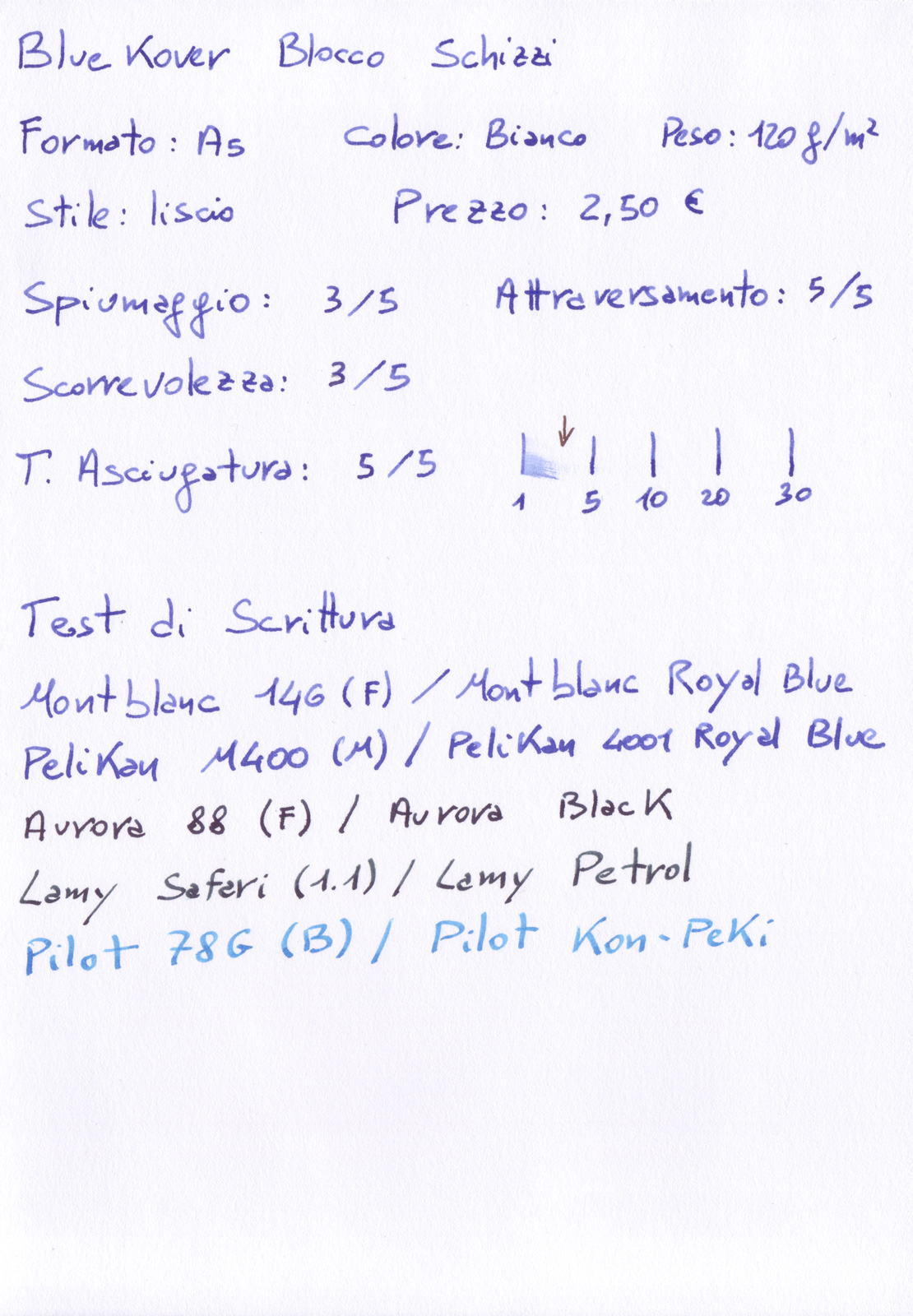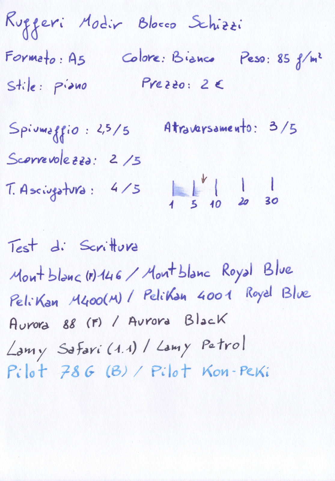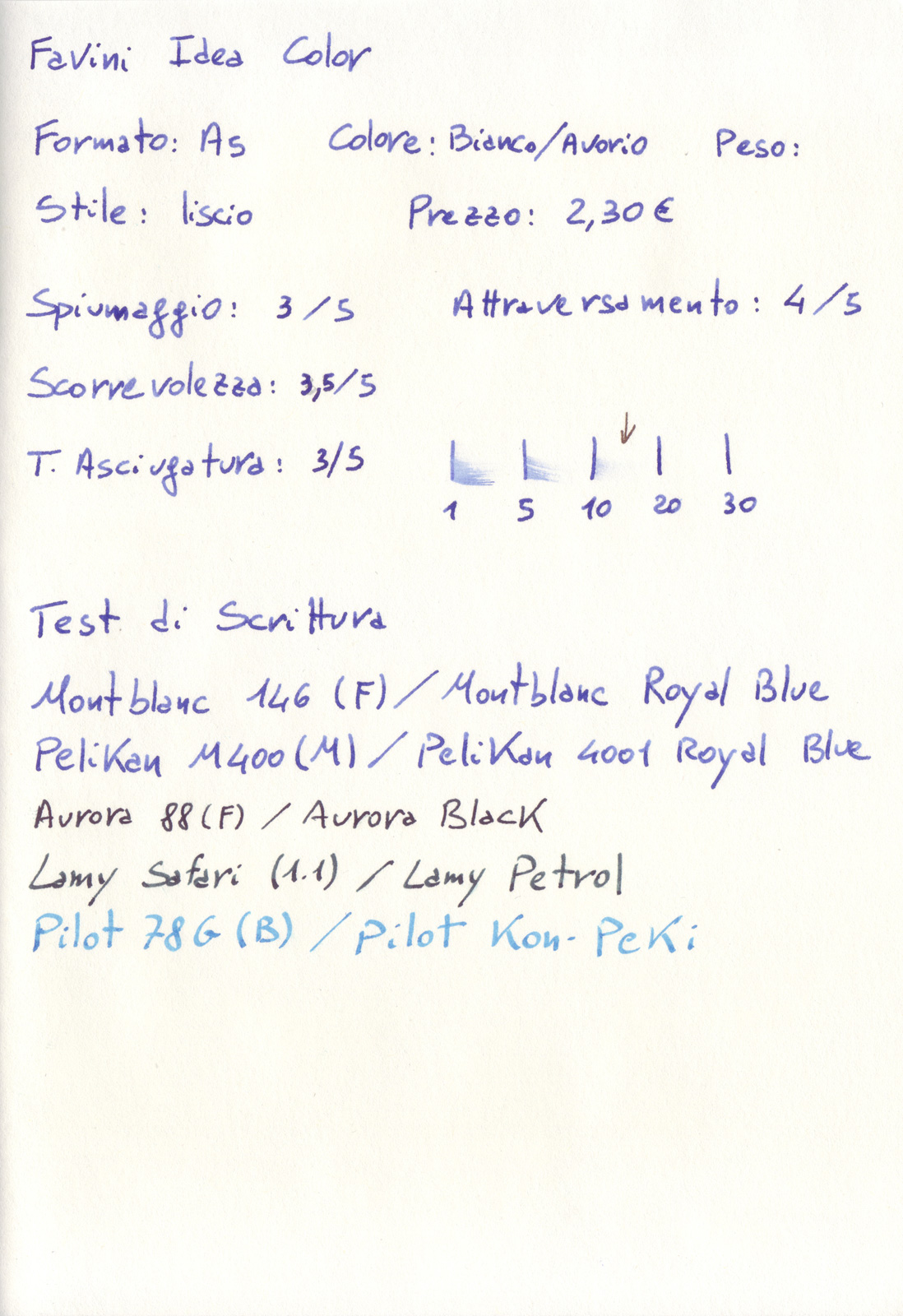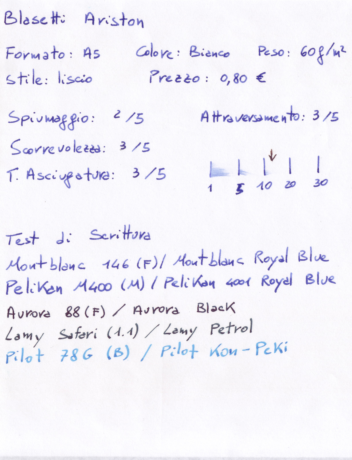 Infine è stato effettuato un test di scrittura, scrivendo poche parole in modo naturale, come si farebbe usualmente. Sono state utilizzate 5 diverse combinazioni penna/inchiostro piuttosto note ed aventi caratteristiche diverse :