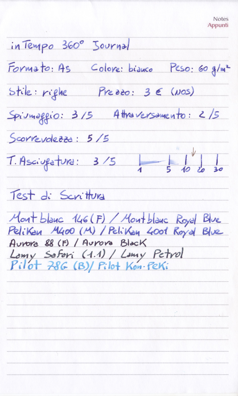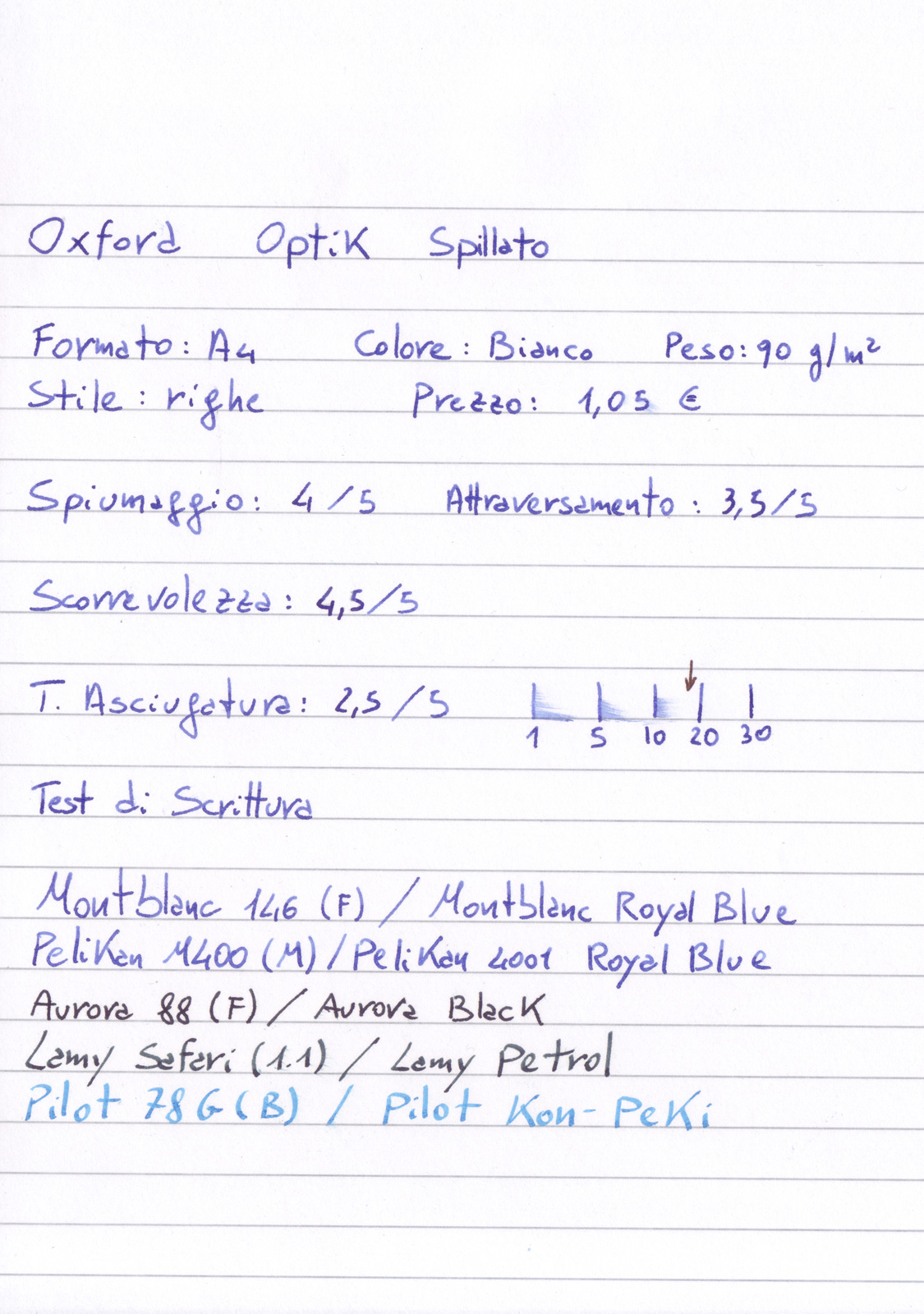 Mi riferisco in particolare al quaderno A4 Oxford, che pur essendo uno dei supporti più economici e dall'aspetto "informale" mi ha dato sensazioni davvero positive: una scorrevolezza ottima che fa volare anche i pennini un po' ostici (così come la inTempo 360, o la carta di test della Lamy), basso attraversamento (solo l'Aurora Black ha passato, ma non tantissimo) ed in generale un'ottima piacevolezza di utilizzo