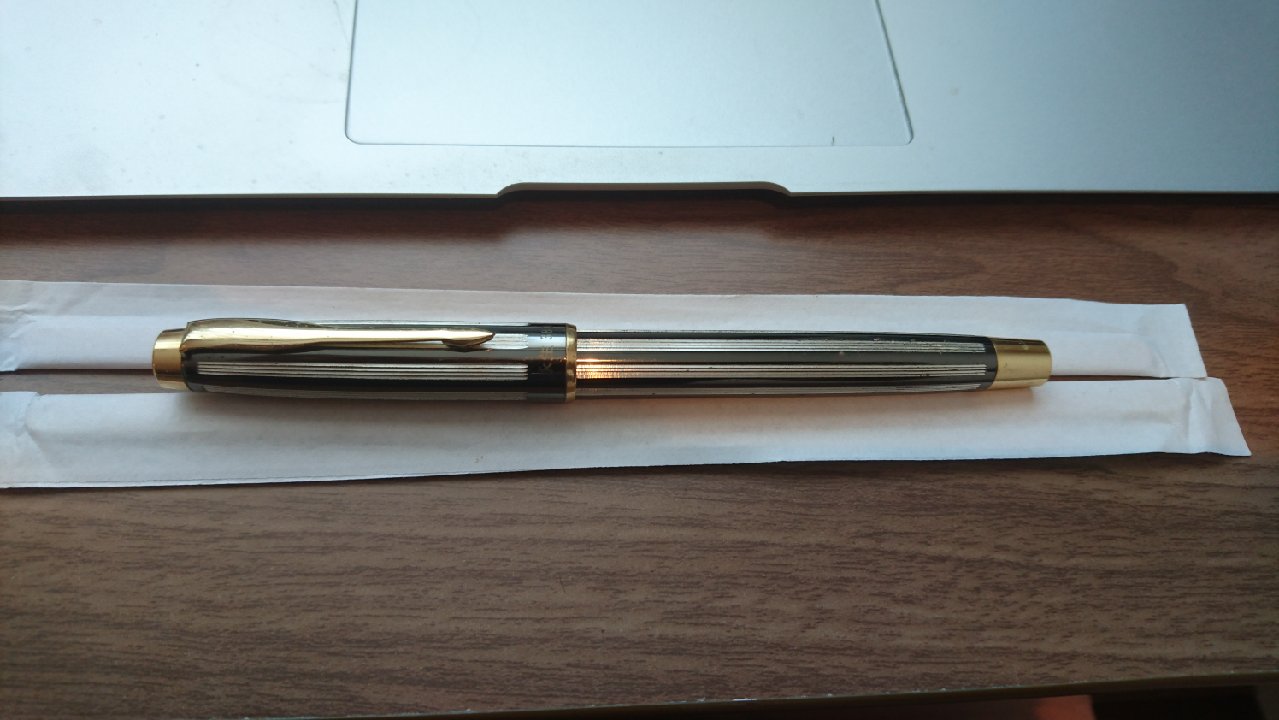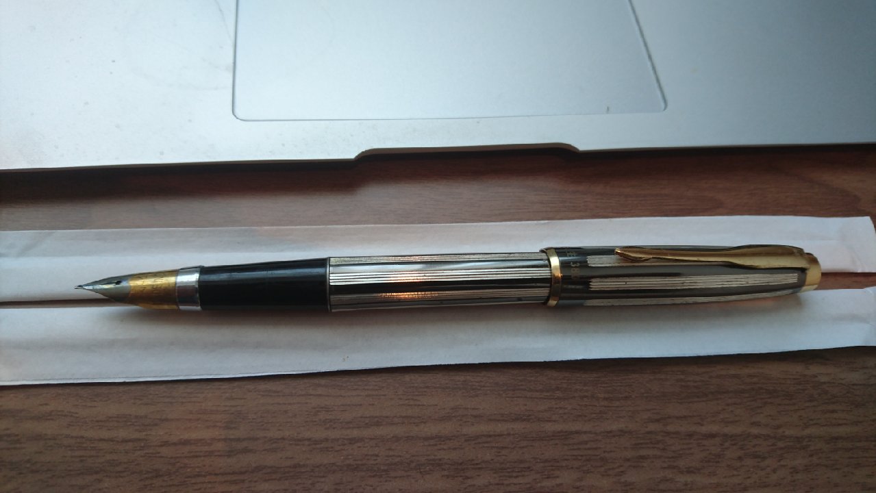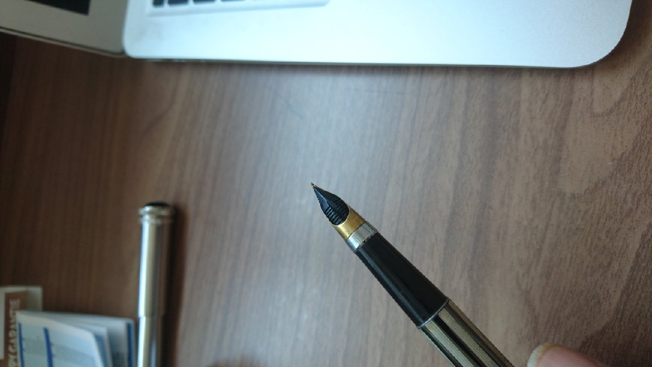 Questa penna (comprata in un mercatino dell'usato) non è particolarmente interessante ma mostra un buon connubio tra caratteristiche Parker (clip, forma della sezione) e Sheaffer (pennino conico).