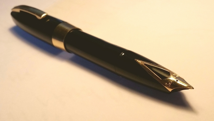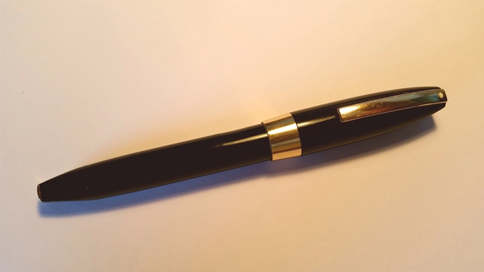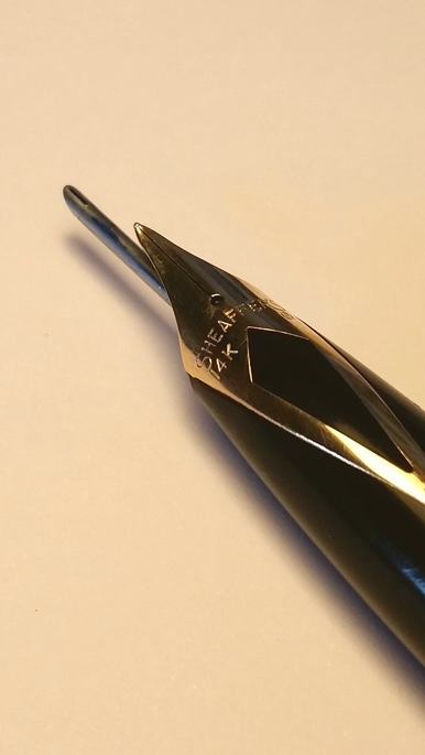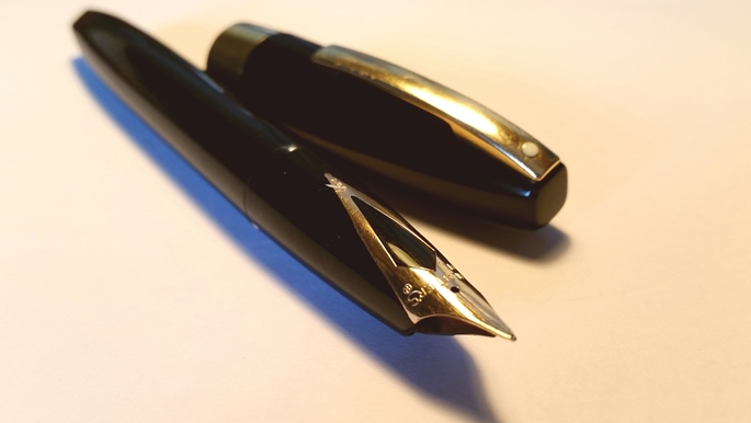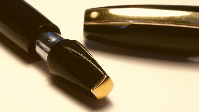 Il design è quasi minimalista: niente decorazioni o incisioni, a parte un leggero "Sheaffer's" sopra la banda metallica (perciò la penna risale a prima del 1963, anno in cui l'azienda dismise il logo Sheaffer's). Questo, però, non esclude uno stile originale che non passa inosservato: linea geometrica ma per nulla impegnativa, forme dolci e non aguzze. La clip, pulita e lineare, porta appresso il famoso "white dot" che ne descrive la garanzia a vita. L'unica versione della PFM che non presenta il "white dot" è la MK I (cappuccio e corpo in plastica, finiture acciaio e pennino in palladio-argento). Per la Mk III si ha sia il cappuccio che il corpo in plastica, con finiture placcate oro e pennino in oro 14K. Un solo dettaglio non corrisponde: come già anticipato nell'altro argomento, la Mk III non prevedeva il fondello munito di placchetta dorata, dettaglio riservato solo alla Mk IV e alla Mk V, ovvero con cappuccio ripettivamente in acciaio/placcato oro e totalmente placcato oro. Perciò suppongo che questa sia una Mk V con il cappuccio di una MK III, ma non essendo destinata alla vendita devo dire che il dettaglio sul fondello la rende a parer mio più completa, richiamando i dettagli dorati della banda e della clip. Quando mia madre l'acquistò con me da un rivenditore di vintage, il corpo era piuttosto opacizzato e presentava graffi più o meno profondi. Dopo averla pulita profondamente, lubrificata e lucidata, ora è pronta per ritornare in pista.