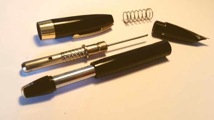 Ecco un punto davvero fondamentale di questa penna, il caricamento! La PFM cela al suo interno uno dei caricamenti più complessi, ingegnosi e affascinanti di tutto il mondo stilografico, e come futuro ingegnere meccanico non posso far altro che restare impressionato e posizionare in cima alla mia classifica di caricamenti preferiti questo gioiello di meccanica. Già testato sulla Snorkel Pen, questo caricamento permetteva di caricare la penna senza sporcare il pennino, attraverso un tubucino estendibile. Quest'appendice fu chiamato come le prese d'aria che i sottomarini utilizzavano per far funzionare i propri motori, estendendole al di sopra della superficie del mare e permettendo perciò al sottomarino di rimanere nascosto in acqua. L'unica (relativa) pecca di questo caricamento è la scarsa capienza, oltre alla complessità e alla sua difficile riparazione; relativa perchè la penna necessita di essere caricata più volte, e qual miglior ludico momento si può avere se non estendere lo snorkel e caricare la penna! Per caricarla bisogna ruotare il fondello in senso antiorario fino all'estensione massima dello snorkel, dopo di che funziona come una normale Touchdown, dove al posto di immergere il pennino si immerge solo lo snorkel, e il pennino rimane intonso. Detto questo, rimane il fatto che più la complessità (e in questo caso anche il fascino) aumenta, più il rischio di rottura o necessià di pulizia aumenta di conseguenza. Perciò, se volete una penna che necessiti di poca manutenzione, questa di sicuro ne necesita parecchia, ma il divertimento (anche nel cosiddetto "servicing") è assicurato!