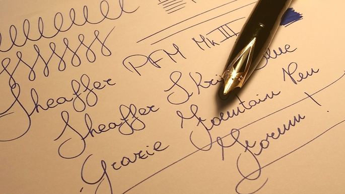 Una penna stilografica, per essere usata quotidianamente, deve essere all'altezza dal punto di vista della scrittura: non deve affaticare, deve essere piacevole e deve essere sempre pronta a scrivere, senza pause né lacune. Questa PFM risponde a pieni voti alle richieste, e in oltre quel leggero grattare che si avverte scrivendo permette di avvertire meglio il foglio e dà una sensazione piacevolissima! Flusso continuo e uniforme, abbondante ma non eccessivo, abbastanza da non incidere il foglio tipo scrittura cuneiforme e abbastanza da non pattinare sul foglio tipo pista di ghiaccio. Insomma, un pennino che scrive così bene penso di non averlo mai provato altrove, così morbido e scorrevole, davvero una favola! Fino ad ora non ha mai dato false partrenze o interruzioni di flussi durante la scrittura; e poi, di una bellezza incredibile: elegante e raffinato, ma innovativo. Il cosiddetto "Inlaid Nib" mi ricorda vagamente la mitra del vescovo, ma davvero un pennino fenomenale, pulito e di classe! La sua misura la paragonerei ad un F ma non troppo. Ecco una breve prova di scrittura con un Sheaffer Skrip Blue giusto per rimanere in tema.
