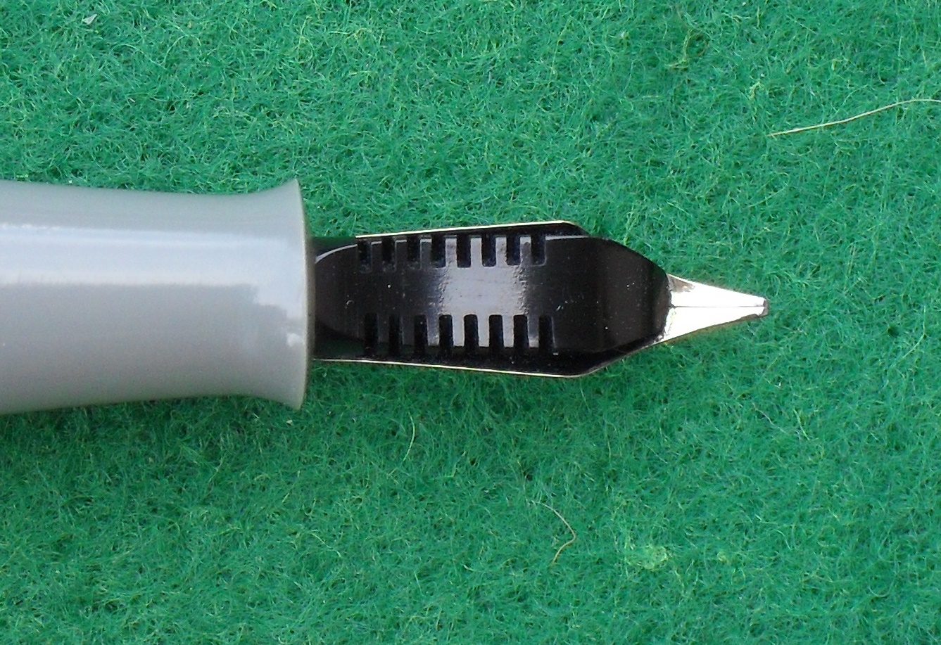 Come ho scritto, il pennino è davvero flessibile. Lo dimostrano le due fotografie che seguono, scattate una dopo l'altra, esercitando pressione e rilasciando. La flessibilità è pari a quella di uno Swan n. 2.