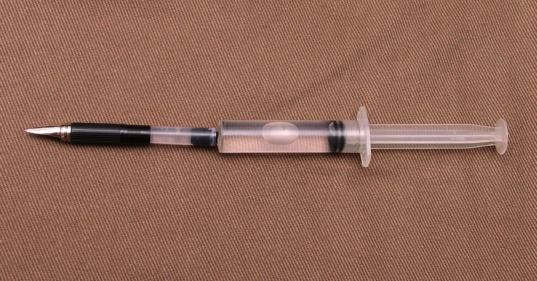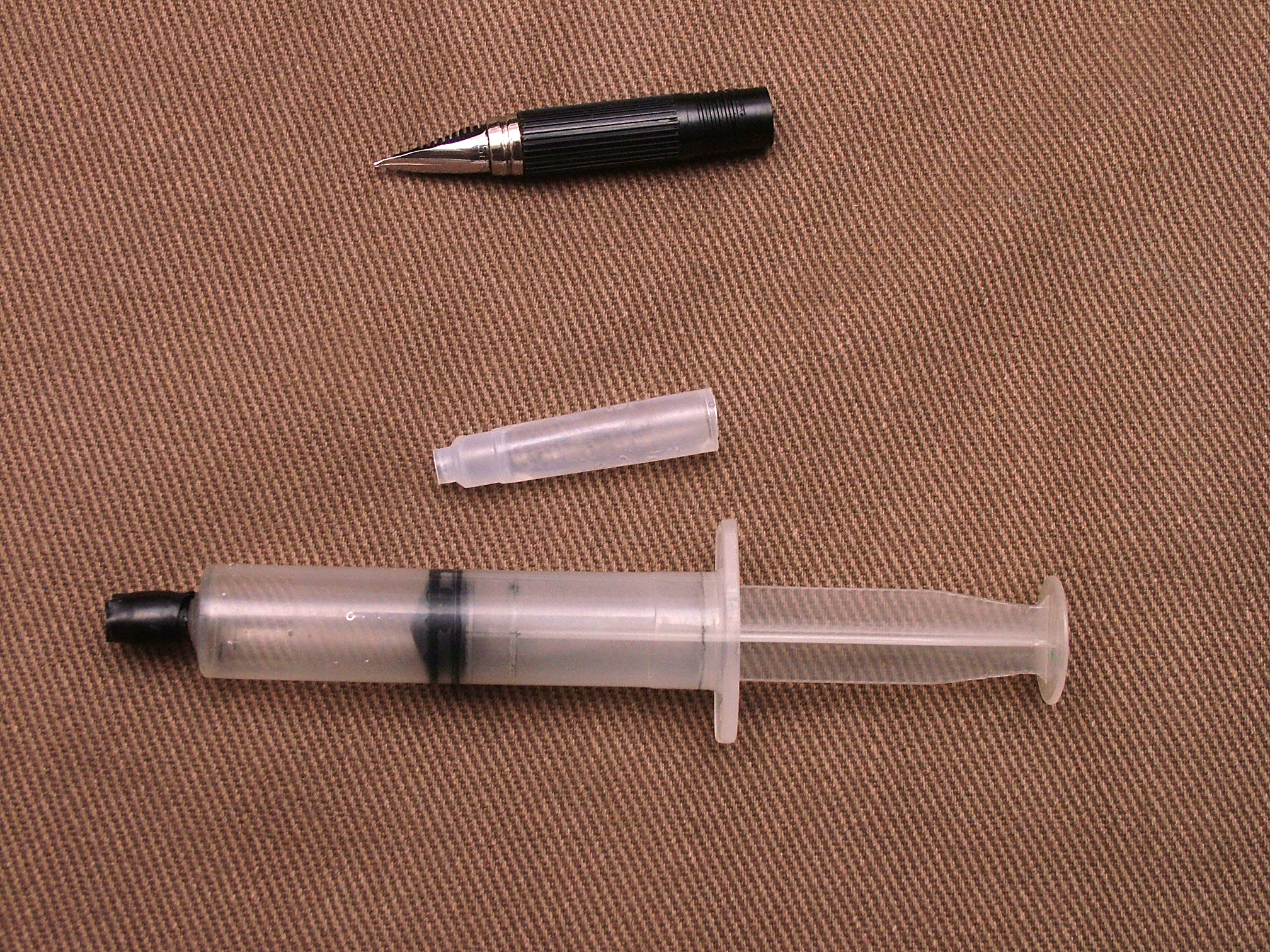 Ciao Maxpop, scusami ma ho visto solo ora il tuo messaggio con la costruzione della siringa + cartuccia. Ispirato da un vecchio post che mi pare di ricordare fosse di Medicus, anch'io alcuni mesi fa ho fatto la stessa cosa, ma forse semplificata: ho tagliato la parte del porta ago con l'ago. lasciando quindi il supporto che si incastra nella siringa. Tale supporto, che è leggermente conico, aderisce perfettamente a tutte le cartucce che ho provato, Pelikan, Parker, Lamy ecc.: un filo di colla fra cartuccia tagliata e supporto ed il gioco è fatto. Ciao. Davide