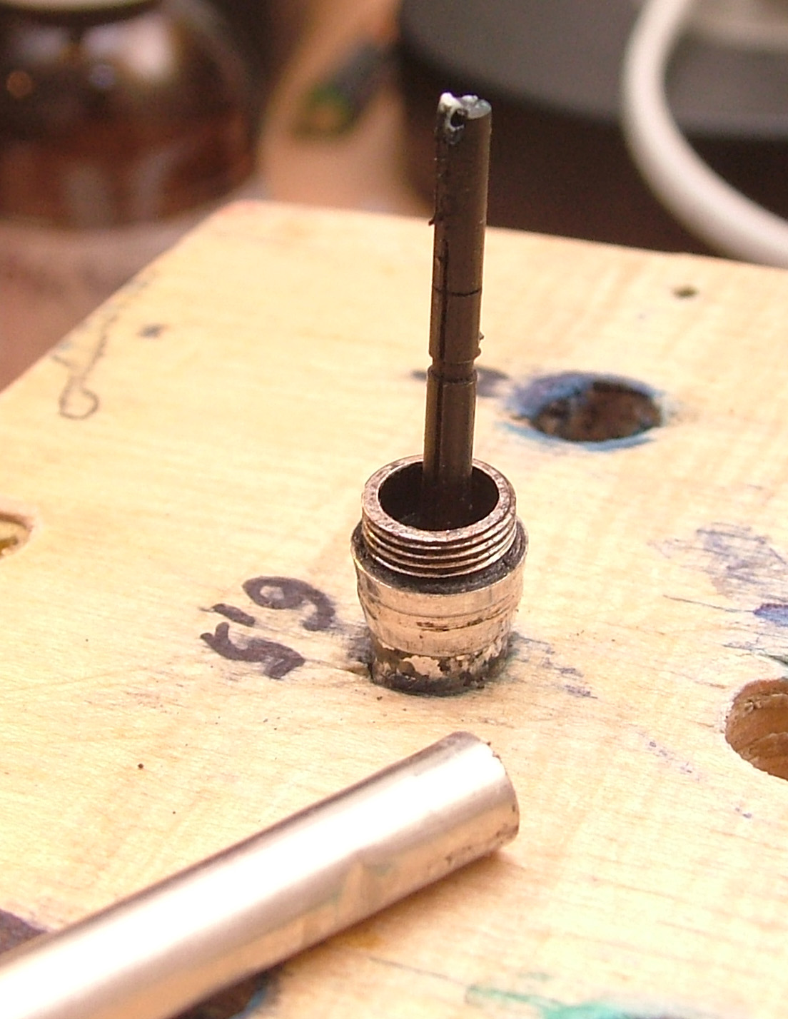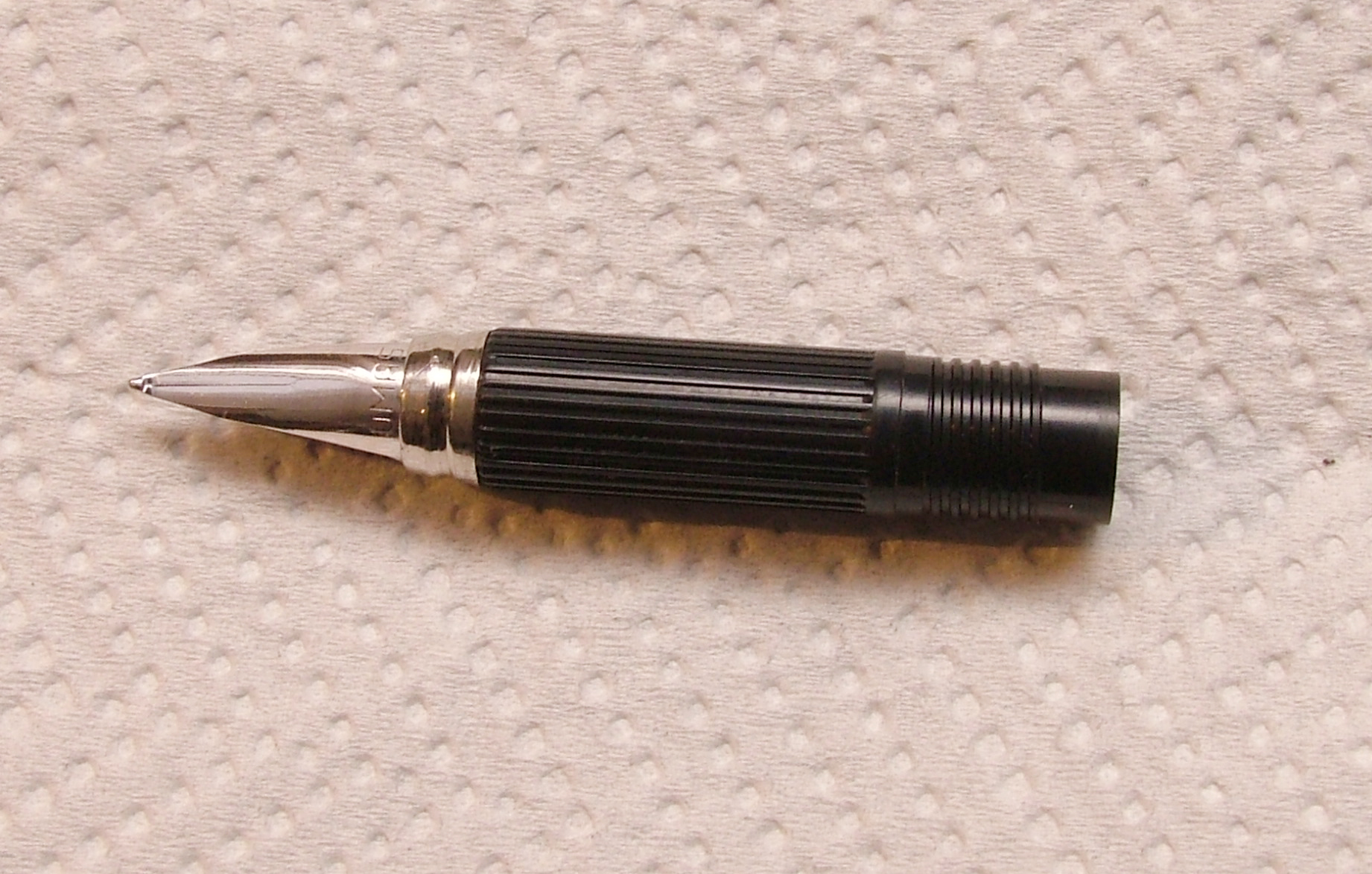 Lavoro finito pulita e montata, sembra strano una penna in argento massiccio col pennino in acciaio, visto che non c'è nessun segno che mi dica che è d'oro, però una volta smontata si legge 14 KR.
