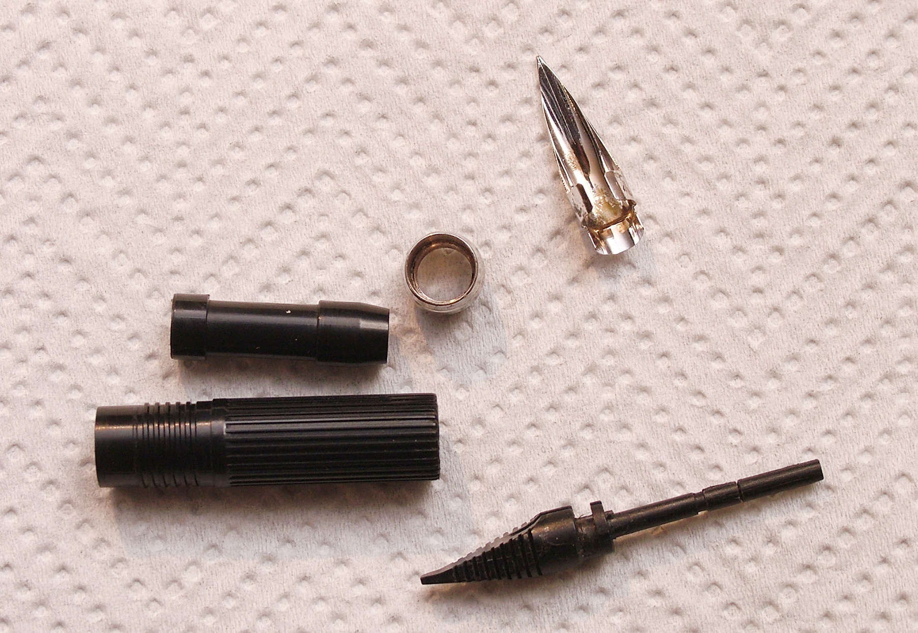 Mi sono reso conto che si può anche provare a levare solo il pennino ed alimentatore tipo la Parker 75 con leggeri movimenti a destra e sinistra, ma se è bloccato bisogna agire come su illustrato.