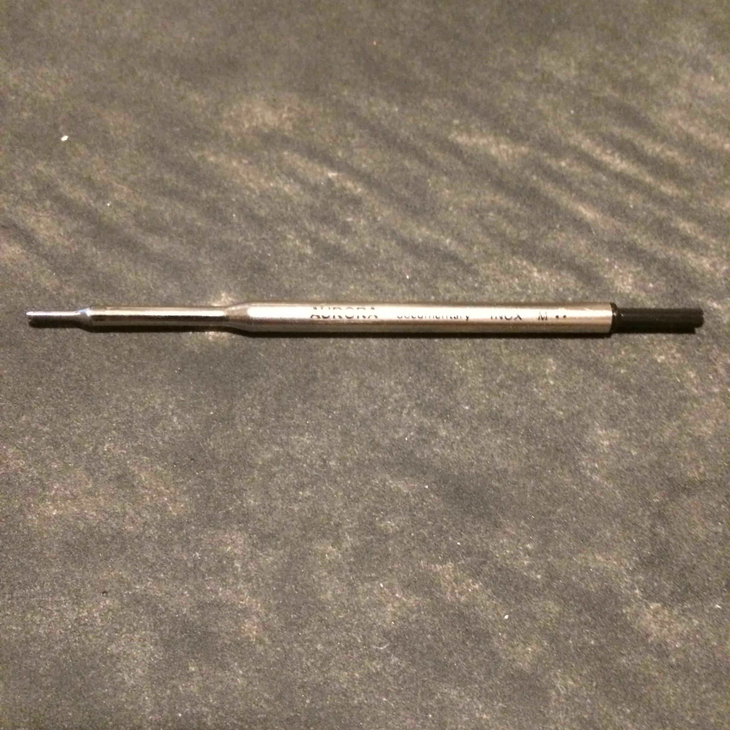 Questo il refill originale denominato "Aurora Documentary Inox M" (dove M dovrebbe stare per medio) con a seguire due pallini: Per il refill: diametro max 0,5 mm, lunghezza massima 10,7 mm, lunghezza del tappo (nero) 1,6 mm.