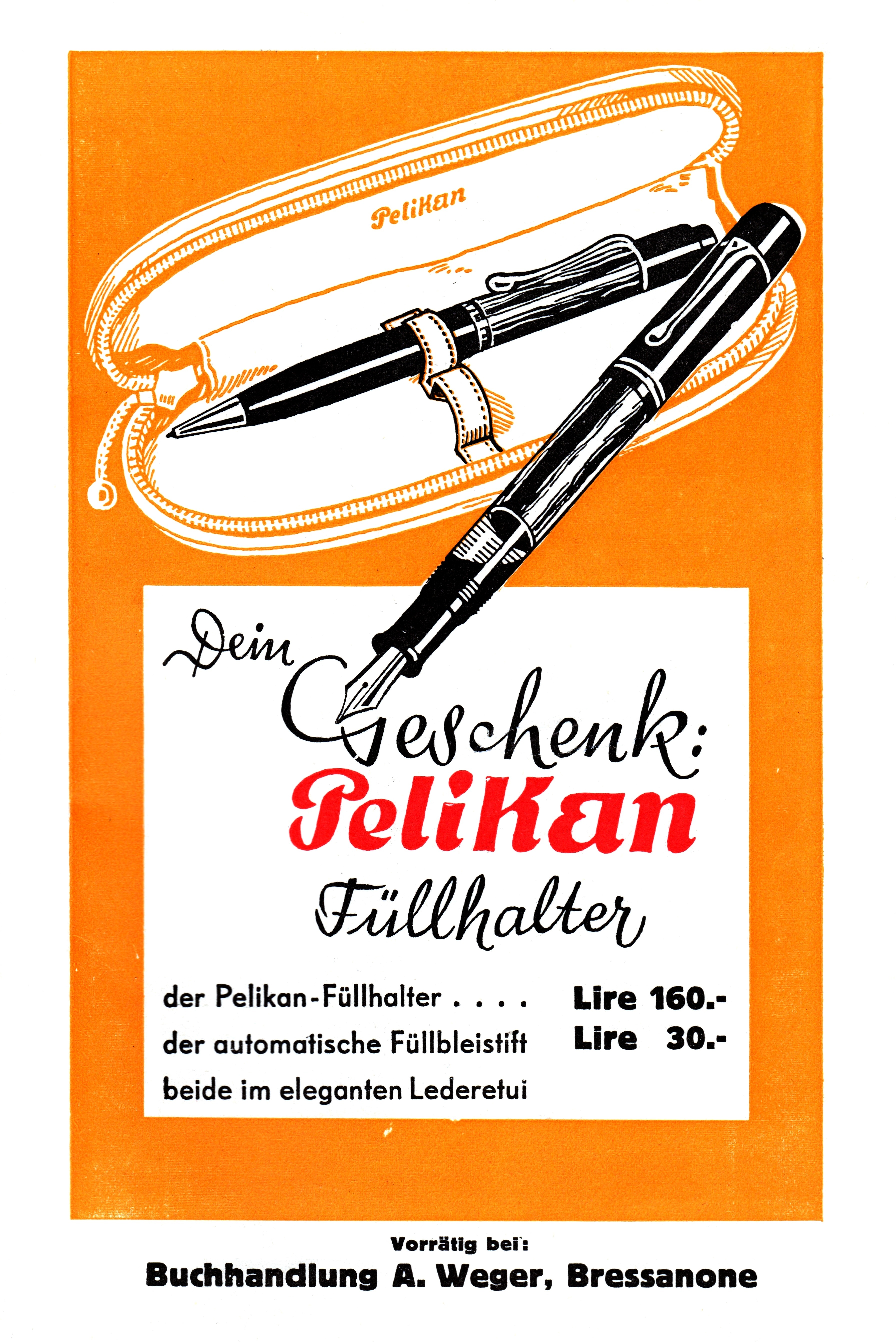 L’anno seguente Pelikan, o meglio la cartoleria A.Weger di Bressanone (che ancora oggi pubblica il Calendario), tenta di ingolosire i potenziali clienti andando a ripescare l’originale tedesco di una pubblicità che era in uso almeno dal Maggio 1931 nel resto d’Italia (archiviata in tre versioni sul Wiki). La penna era originariamente proposta a Lire 90: ma già dalla fine dell’anno 1931 il prezzo era stato portato a L.100 (ancora niente politica del --,99