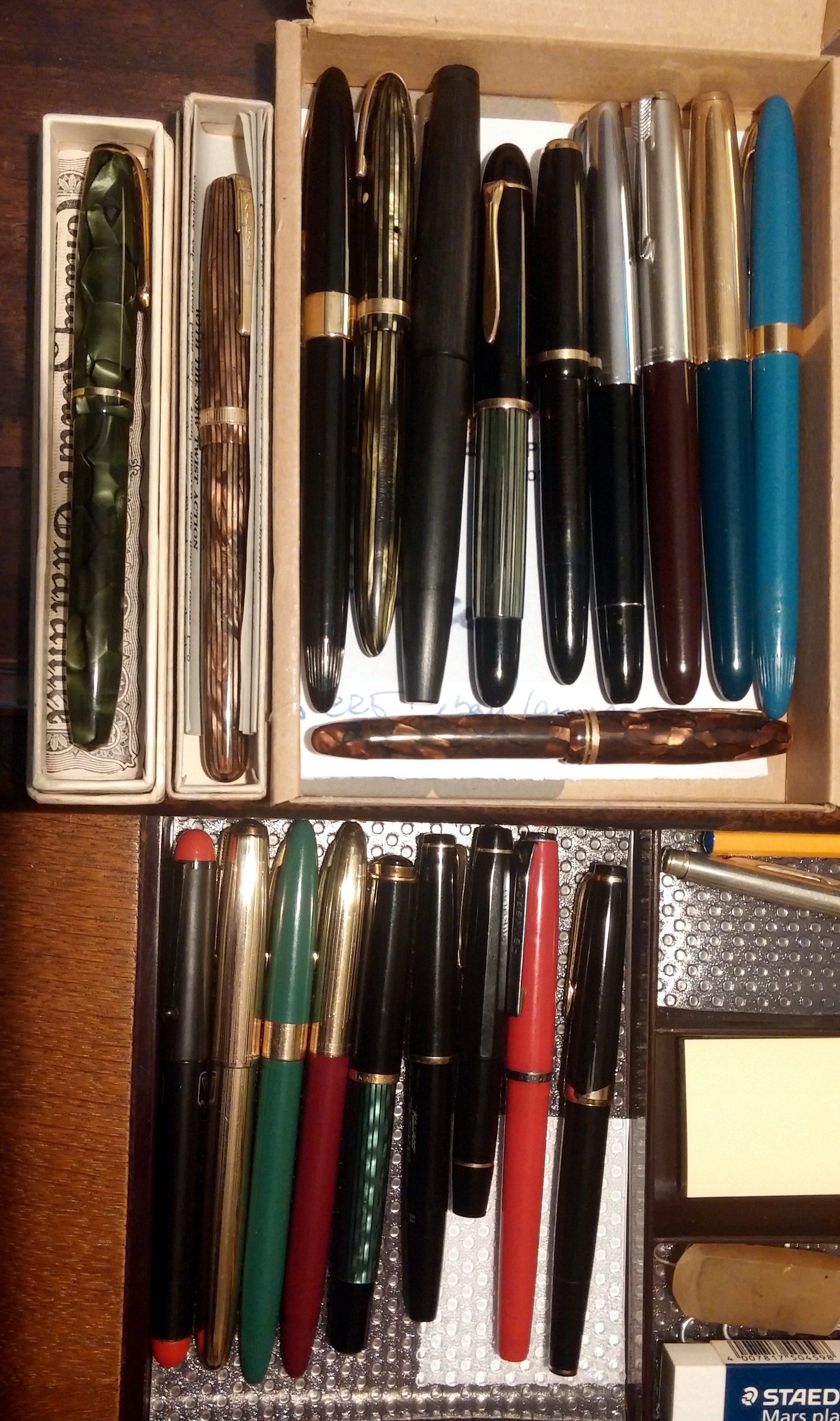 PS: per chi fosse interessato quelle in uso sono: Parker 51 Signet, Sheaffer Vailant verde, Sheaffer Crest bordeaux, Pelikan M400, Kaweco transparent 55f, Kaweco Sport V16, Pelikano Antimacchia 1973, Montblanc 12.
