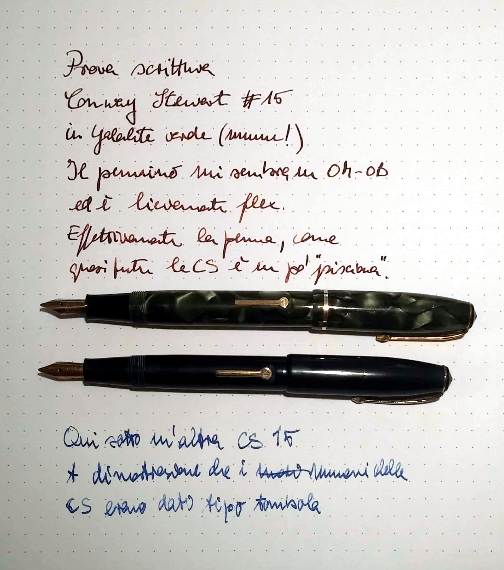 Risposta interessata: inchiostra la C.S 15 in galatite: ne ho una anch'io (rossa però) con pennino abbastanza flessibile ma flusso decisamente troppo abbondante, tale da non rendere possibili le variazioni di tratto che secondo me il pennino potrebbe anche dare. Così mi dici come va la tua, e magari capiamo se il problema del flusso eccessivo è connaturato alla penna (possibile, trattandosi di penna vecchiotta) o se è solo la mia che è una pisciona...