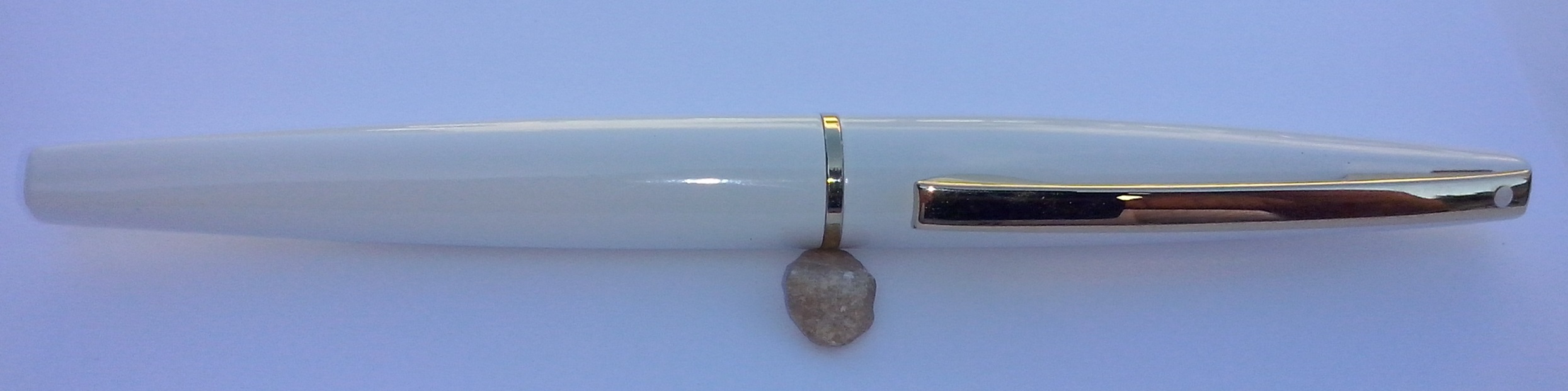 Da chiusa , quello che risalta è la perfetta simmetria tra cappuccio e fusto ( separati da un anello dorato ) e il lunghissimo clip col classico punto bianco e la piccola scritta "Sheaffer" sul lato.