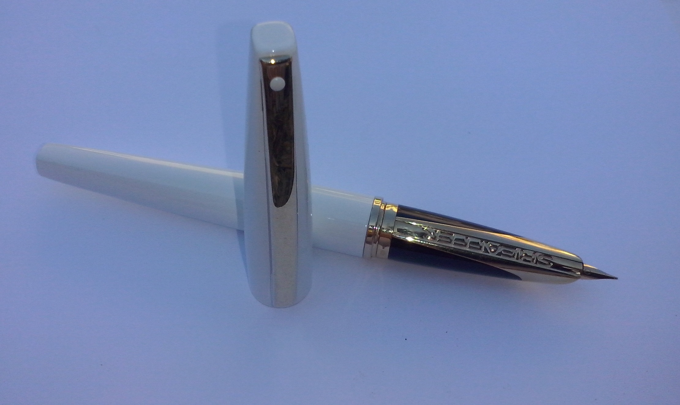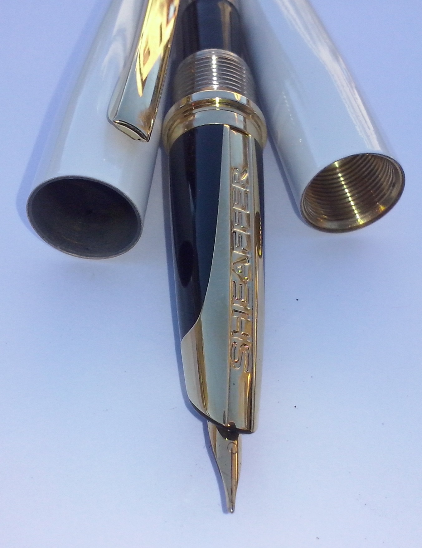 Fin qui non ci sarebbe nulla di eccezionale, ma è togliendo il cappuccio che cambia la musica. Si rimane colpiti da una lunga banda dorata, con una grande scritta SHEAFFER, che arriva fino al pennino, e che qui vicino avvolge per tutta la circonferenza la sezione prensile.