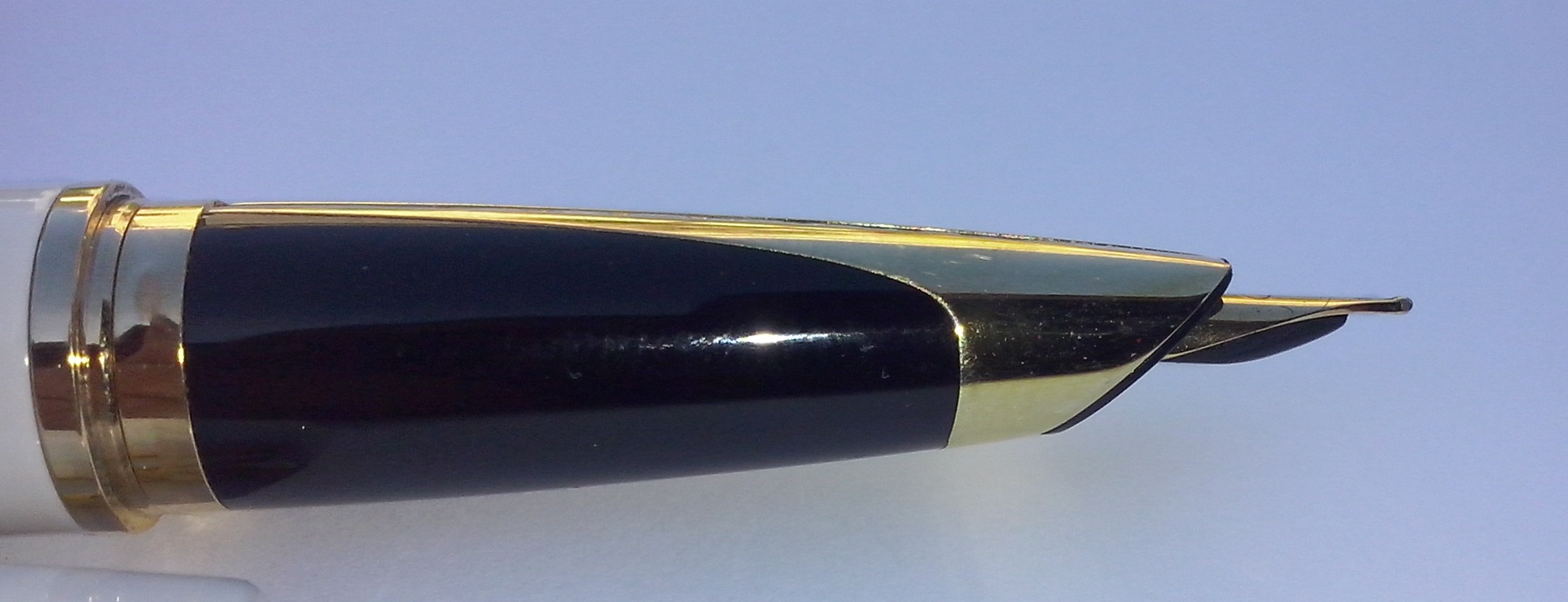 Colpisce anche il pennino semicoperto, è molto piccolo, e assomiglia molto a quello della Parker 51; l'alimentatore è ovviamente proporzionato al pennino ed è liscio.