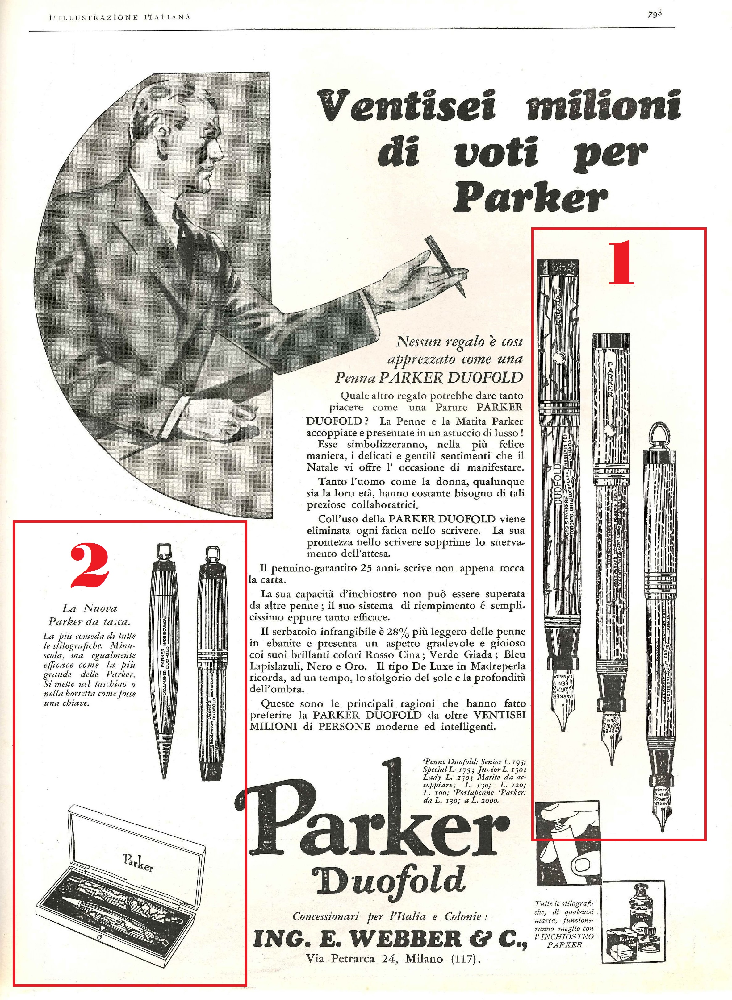 Innanzitutto si noti come, alla faccia delle pressanti raccomandazioni sull’italianità del linguaggio, nel 1936, nel pieno dell’ubriacatura imperiale e dell’autarchia ideologica, la coppia di stilografica e matita abbinata venisse bellamente definita “parure mignon”, comunque in luogo dell’inglese “set” (à la santé du roi de France, et merde pour le roi d'Angleterre!).