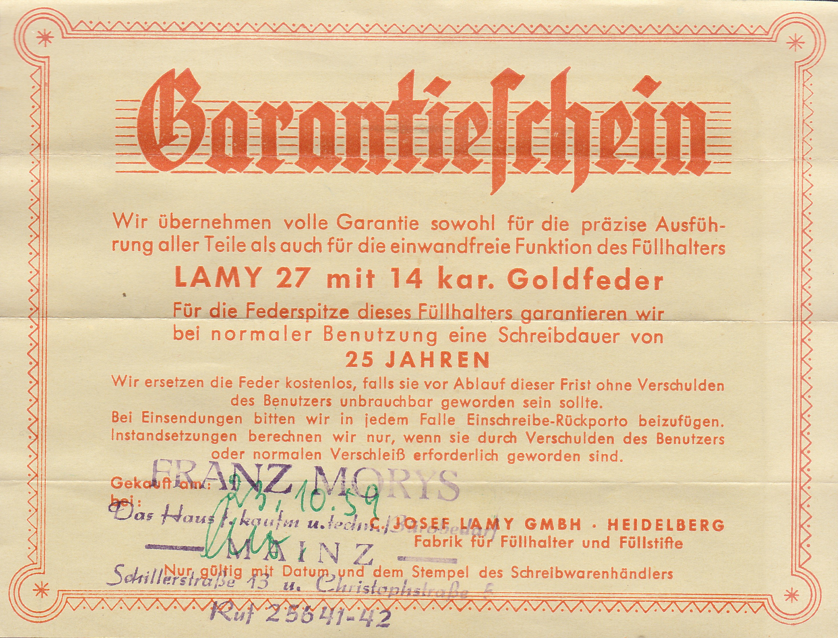 La prima notizia piacevole è che oltra alla scatola, la penna ha ancora in dotazione il foglietto di istruzioni e la garanzia venticinquennale. E' stata venduta a Magonza nell'ottobre del 1959 (evviva: è più vecchia di me).