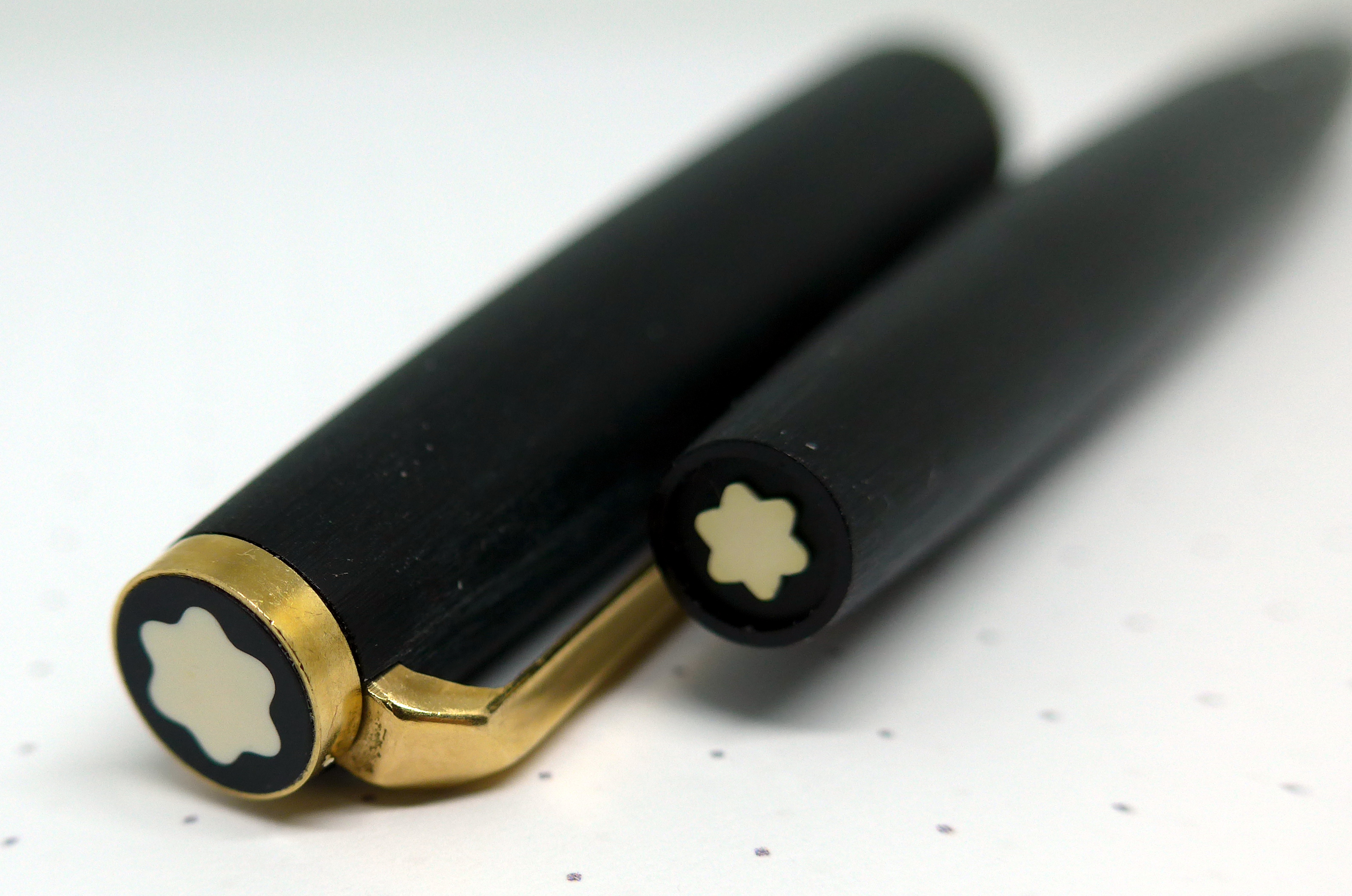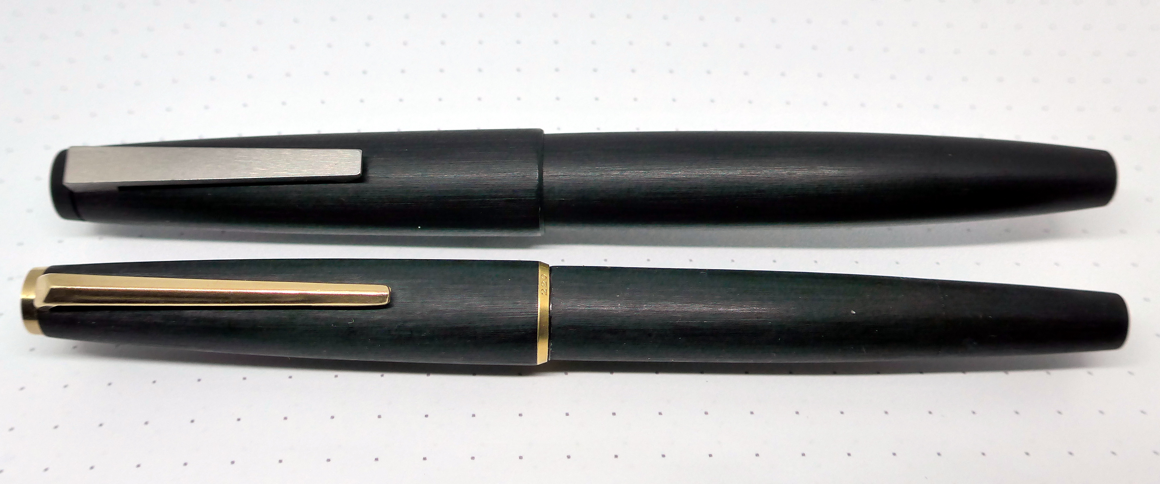 E, infine, un interessante confronto con una penna fatta dello stesso materiale, rifinita nello stesso modo, ma nella realtà un po più cicciotta di come appare, a causa della prospettiva, in questa fotografia: