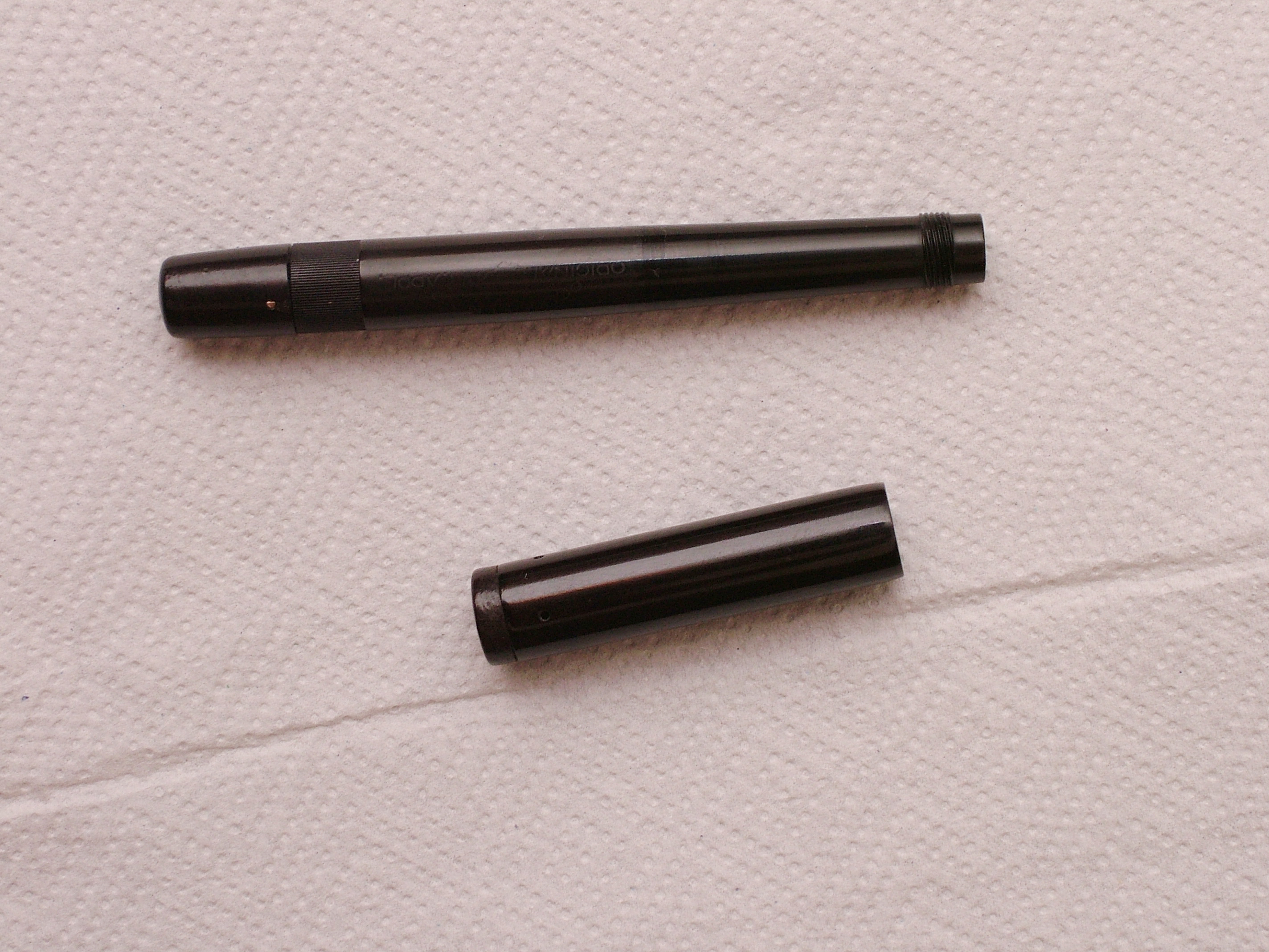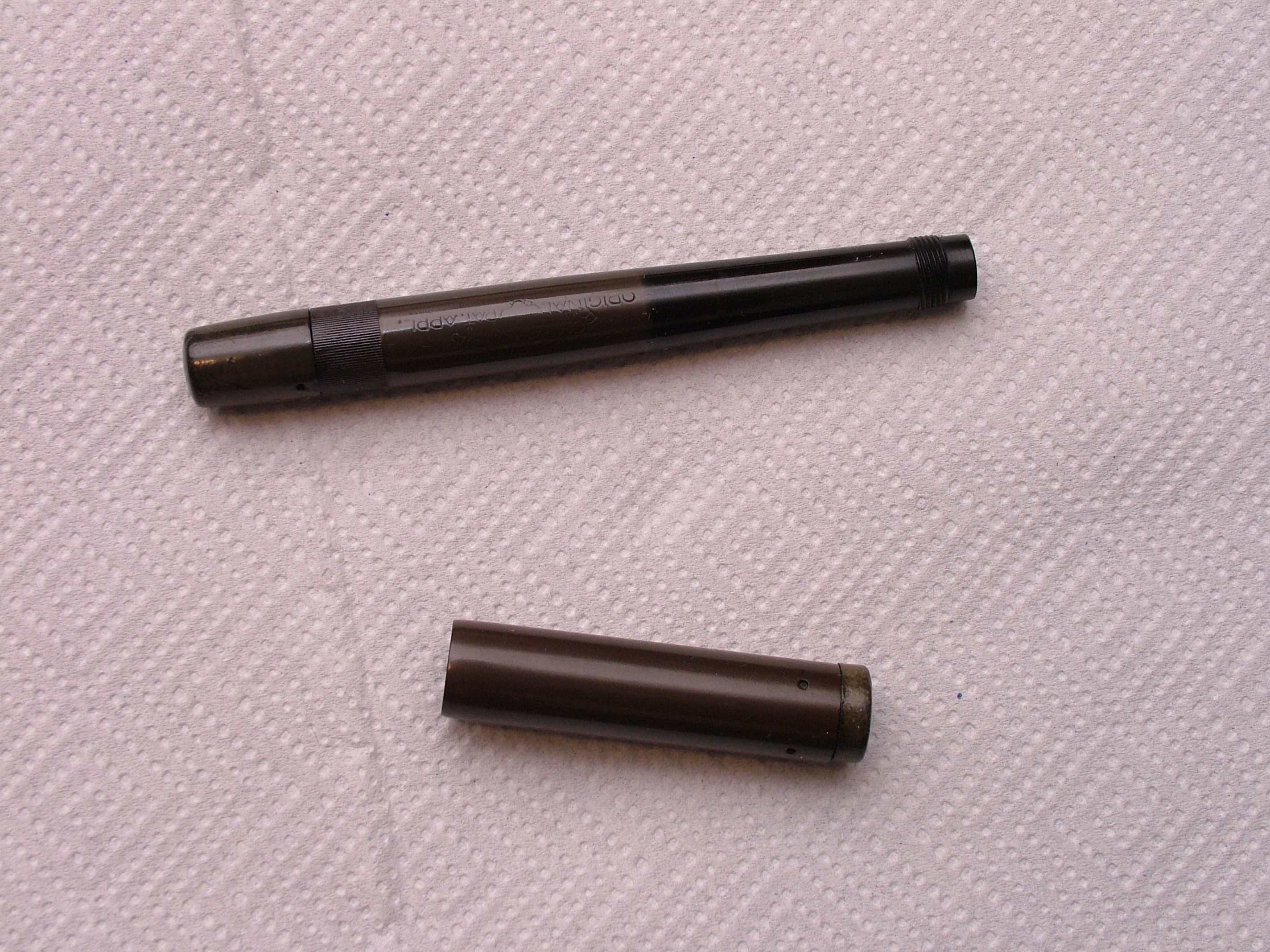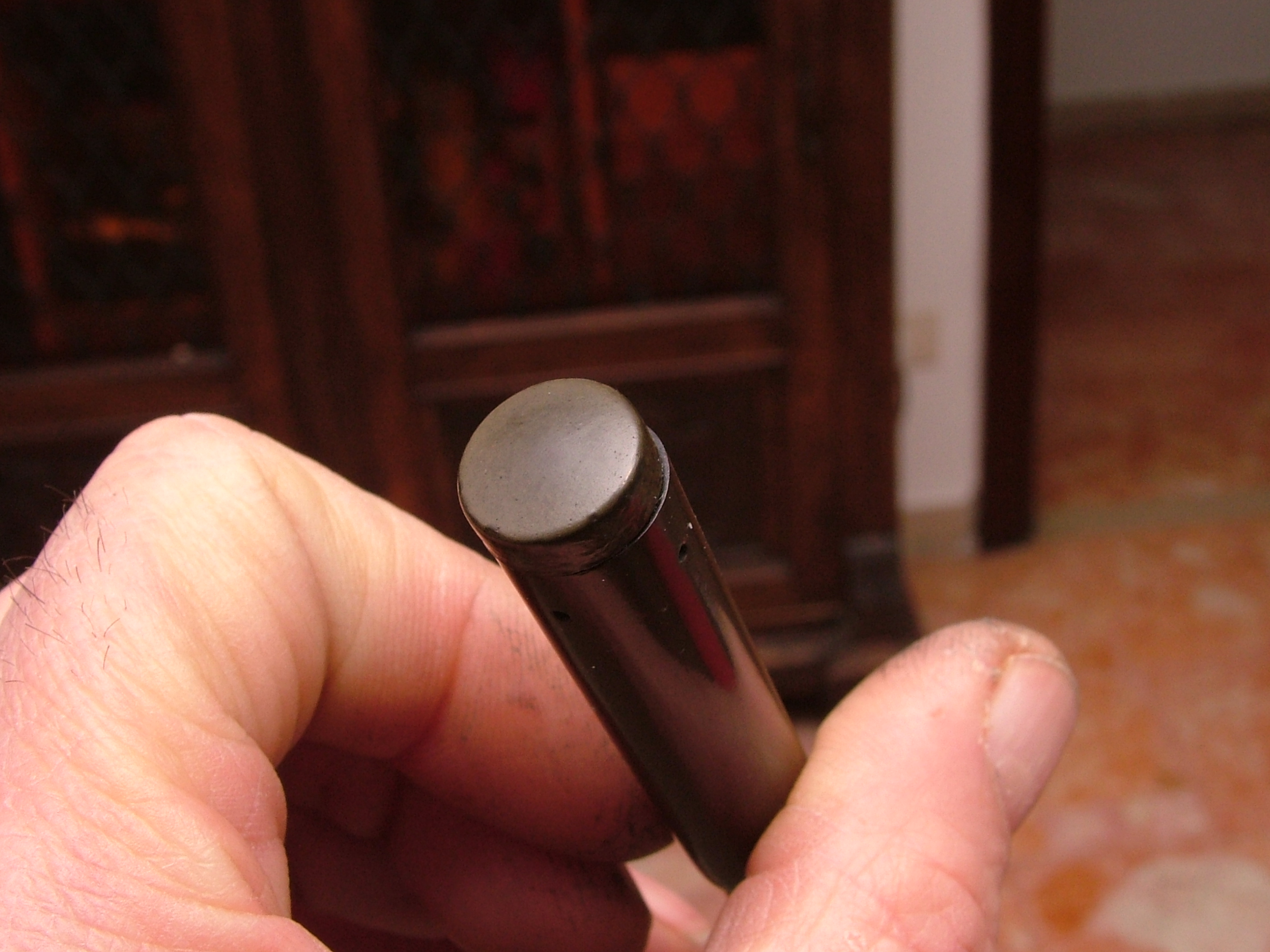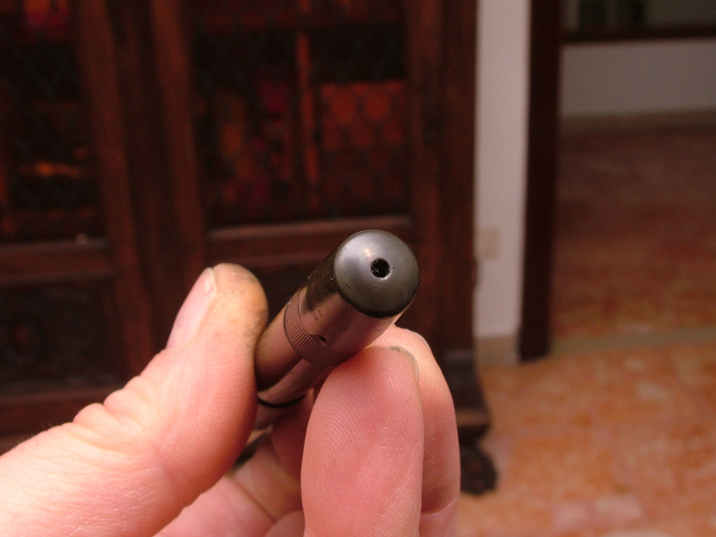 Come si vede dalle immagini che ha inserito, la penna di Massimo ha inequivocabilmente il foro sotto al fondello ed il canale verticale sul dorso del conduttore: servivano entrambi ad ospitare il perno metallico infisso all'interno della testina che impediva il danneggiamento del pennino con l'accidentale sollevamento del predetto a penna chiusa od a seguito di maldestri tentativi di inserire il cappuccio col pennino non perfettamente rientrato.