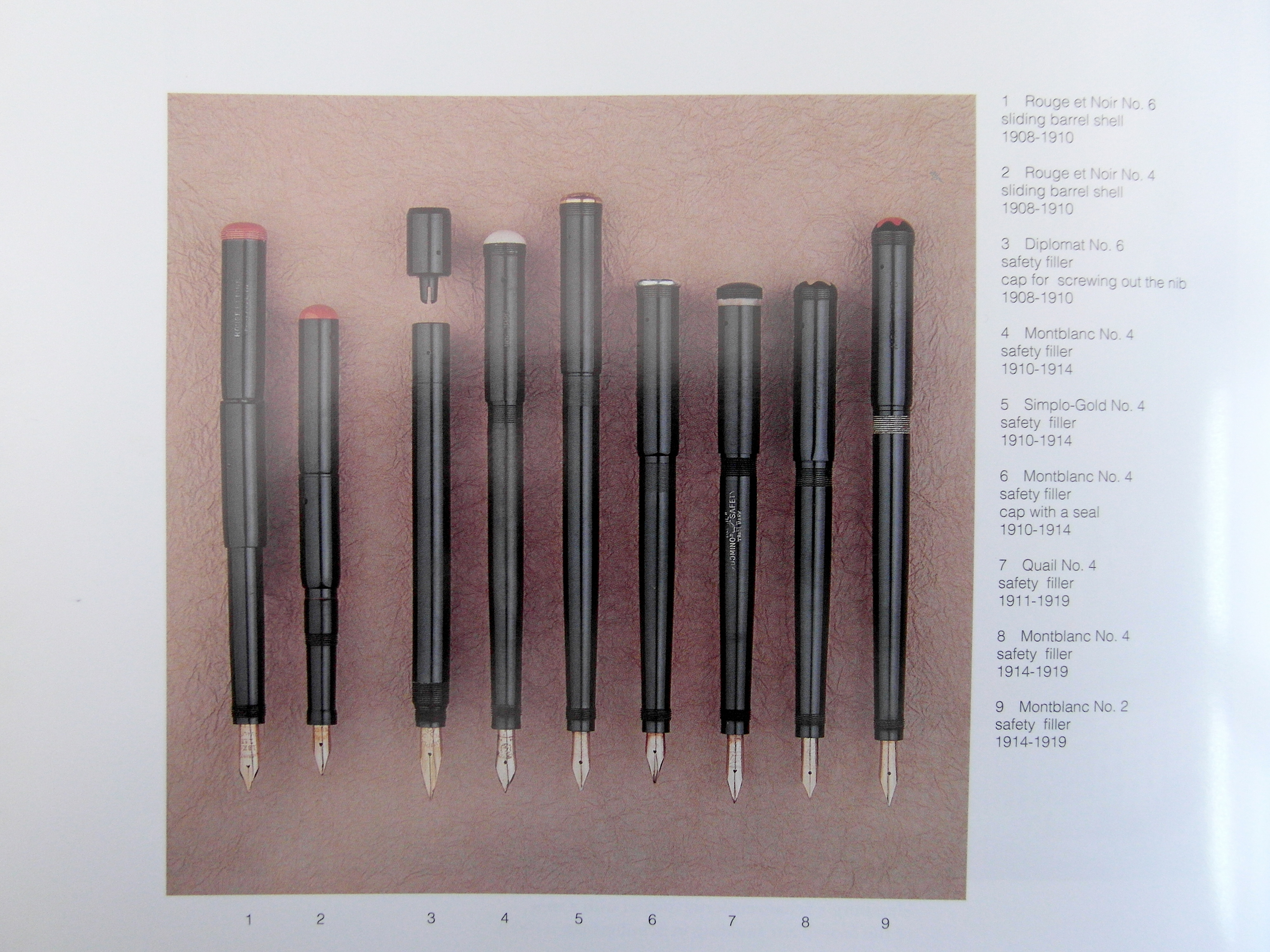 Sperando di fare cosa utile allego le immagini riprese dal libro di Jens Rösler "The Montblanc Diary & Collector's Guide" nelle quali sono riprodotte penne con la testina del cappuccio decisamente più appiattite di quella classica. Spesso sono riproduzioni di materiale pubblicitario, quindi non certo l'ideale per vedere il particolare della testina e dirimere la questione.
