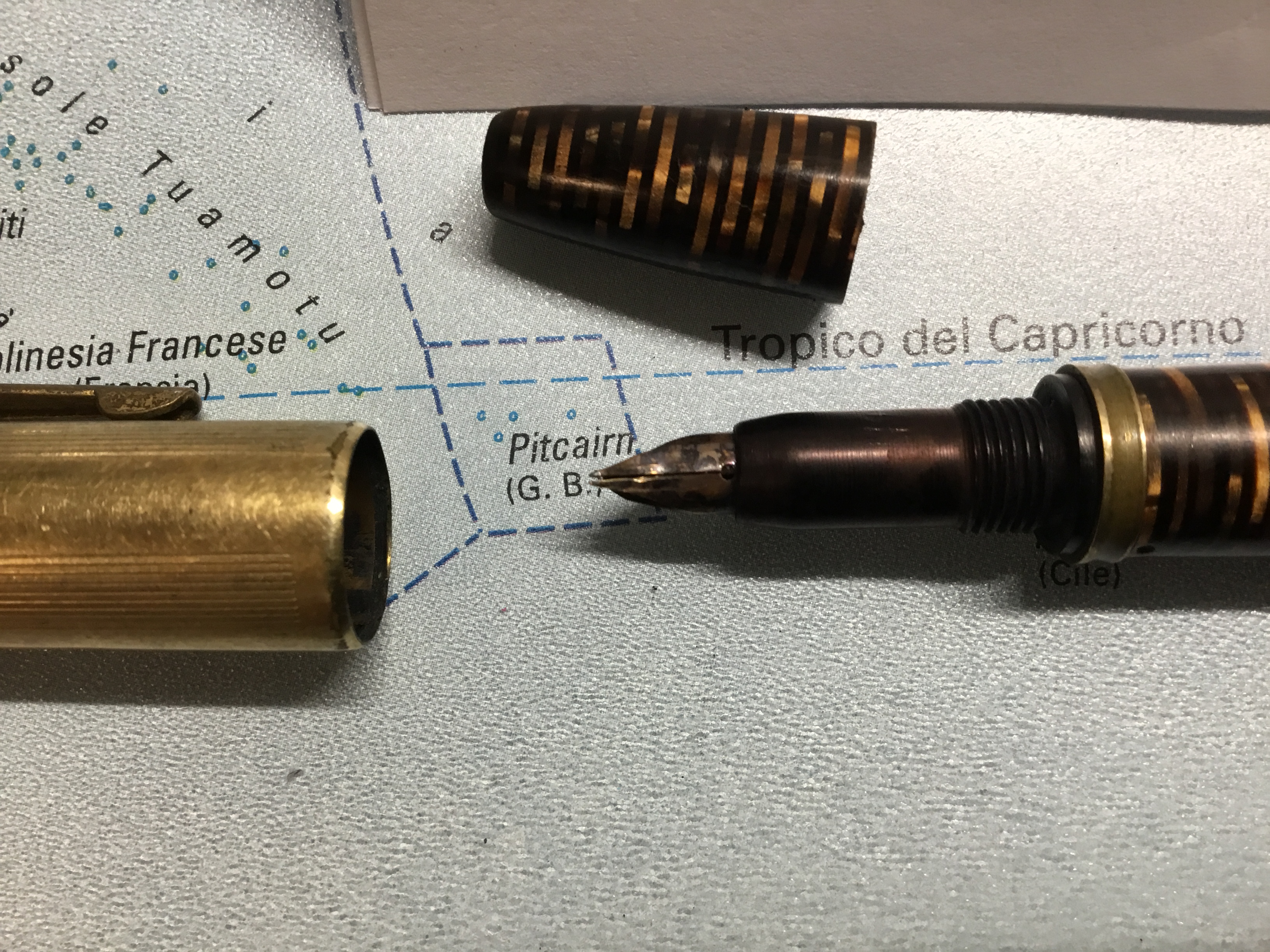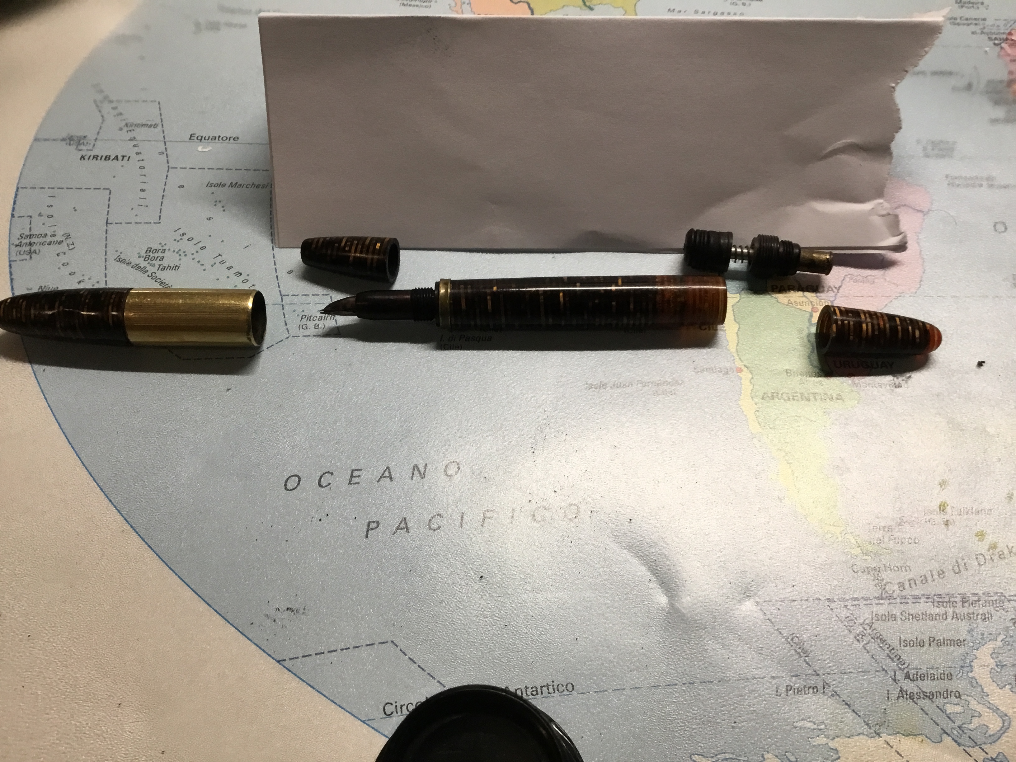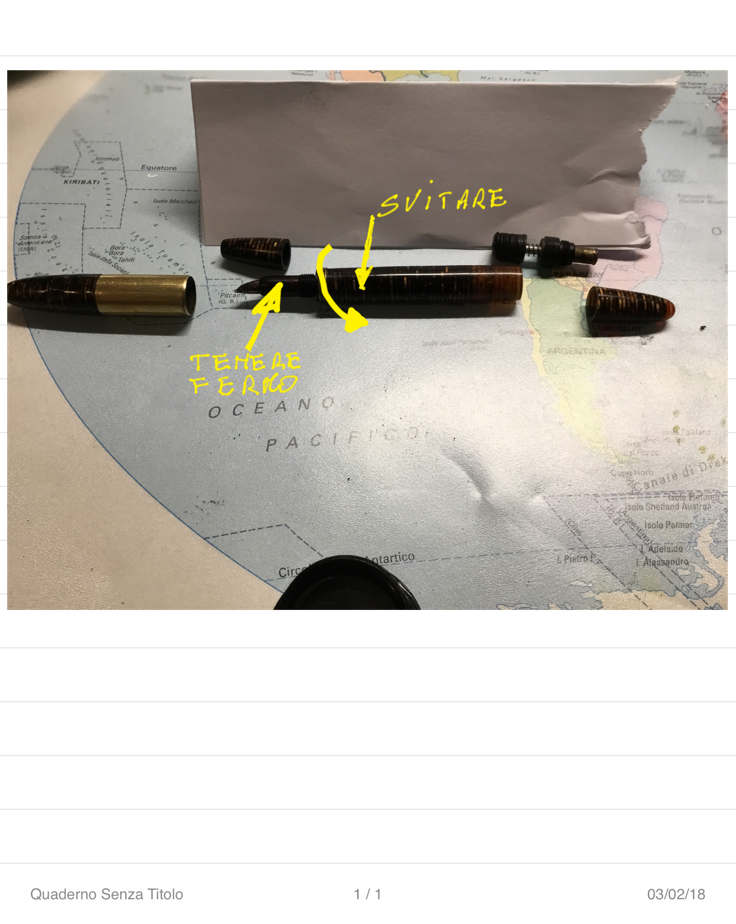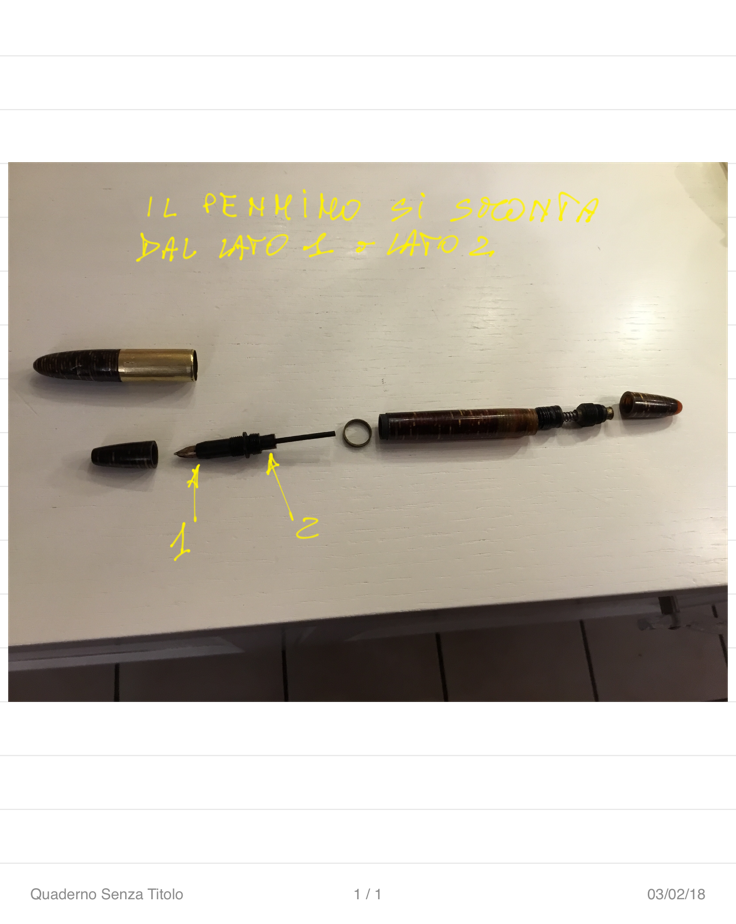 2) Aggiungo una cosa forse per dare a qualche esperto piu' indizi , io non riesco a capire se la parte a sinistra dell'anellino verso il pennino sia un tutt'uno con il fusto . All'interno del fusto vedo una piccola cannula di lunghezza circa la meta' del fuso , non so se è residuo di tornitura oppure invece è una cannula che ha qualche funzione fondamentale tipo "aria" per fare scendere inchiostro , scusate le supposizioni da ignorante ma ci tenevo ad aggiungerle . Secondo voi sarebbe da scaldare in corrispondenza dell'anellino per vedere se si smonta ? e poi sfilare pennino dall'interno ?