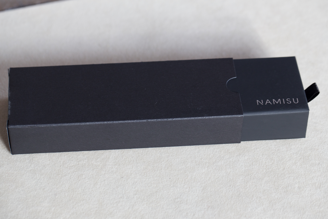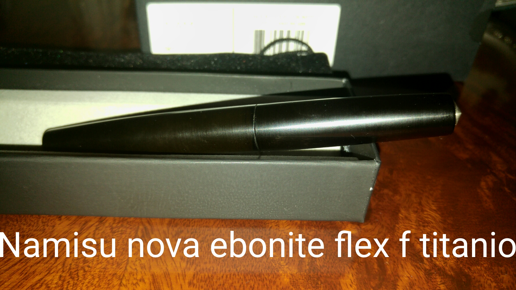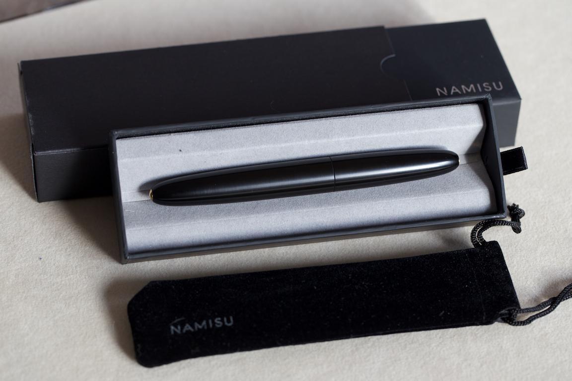 Buongiorno a tutti, oggi vi presento l' ultima arrivata, la Namisu Horizon. È una bella penna prodotta nel Regno Unito da un gruppo di giovani designer. È fatta in ebanite nera spazzolata, ha la classica forma a sigaro e ricorda una penna di produzione giapponese. Non ha clip, il pennino è di produzione Bock, nel mio caso l' extra fine scrive benissimo ed è stata una vera sorpresa. La carica avviene mediante converter, già incluso, o cartucce internazionali. Nell' essenziale ma elegante confezione troverete un bel portapenne in vellutino sintetico molto morbido, l' ideale per riporre la penna. Il cappuccio è estremamente leggero, ho quasi paura di romperlo solo toccandolo, il resto della penna è anch' esso leggero ma trasmette una certa solidità. Le dimensioni sono di 138 mm a penna chiusa, in mano calza perfettamente.