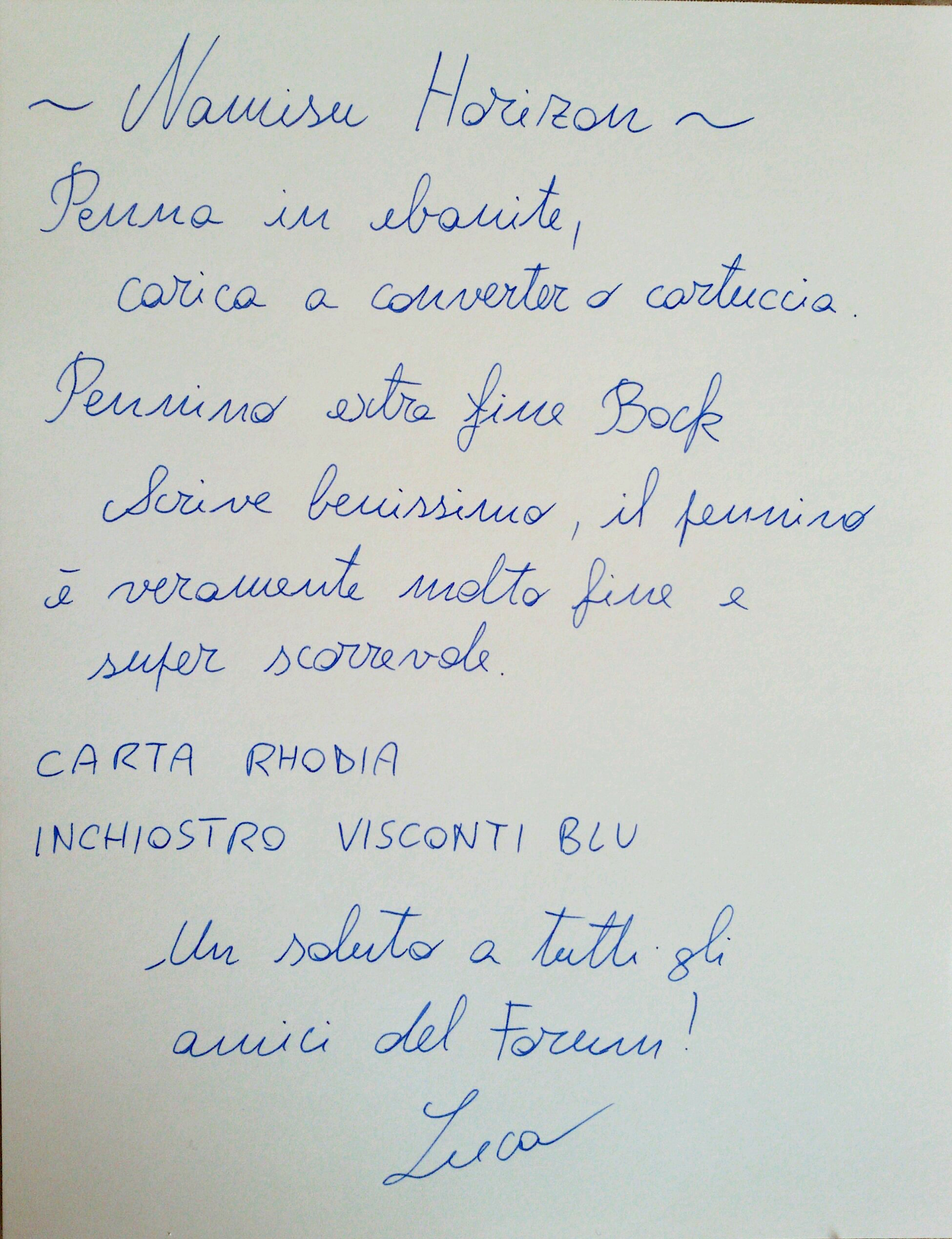 Grazie per la ottima recensione. Sono penne psrticolari e dalla linea che può lasciare perplessi ma il rapporto qualità - prezzo è molto buono. Ho da poco la Orion ckn pennino Bock EF al titanio, leggermente flessibile, e la penna scrive in modo eccellente. Questa Horizon ha anche un bel tocco di eleganza.