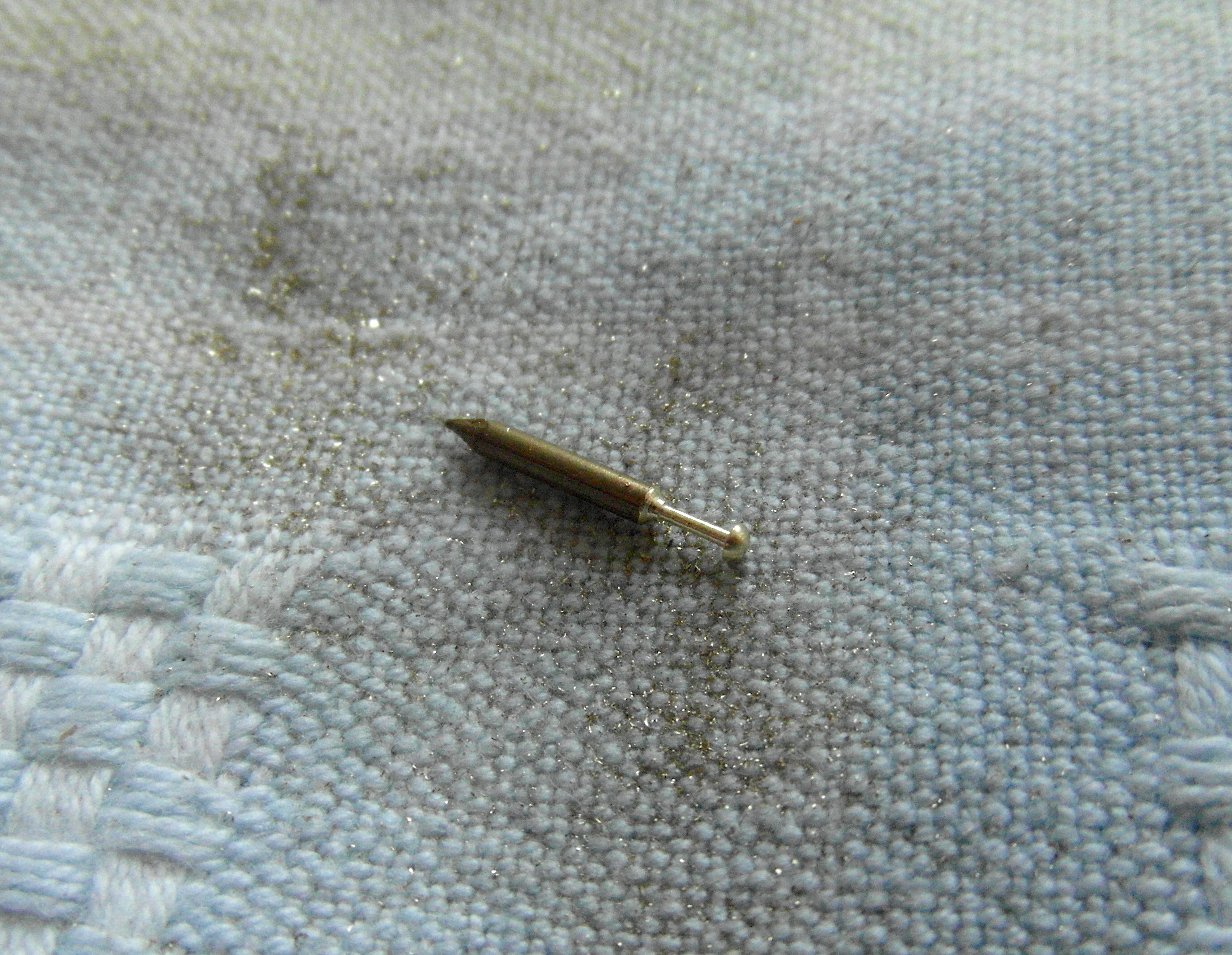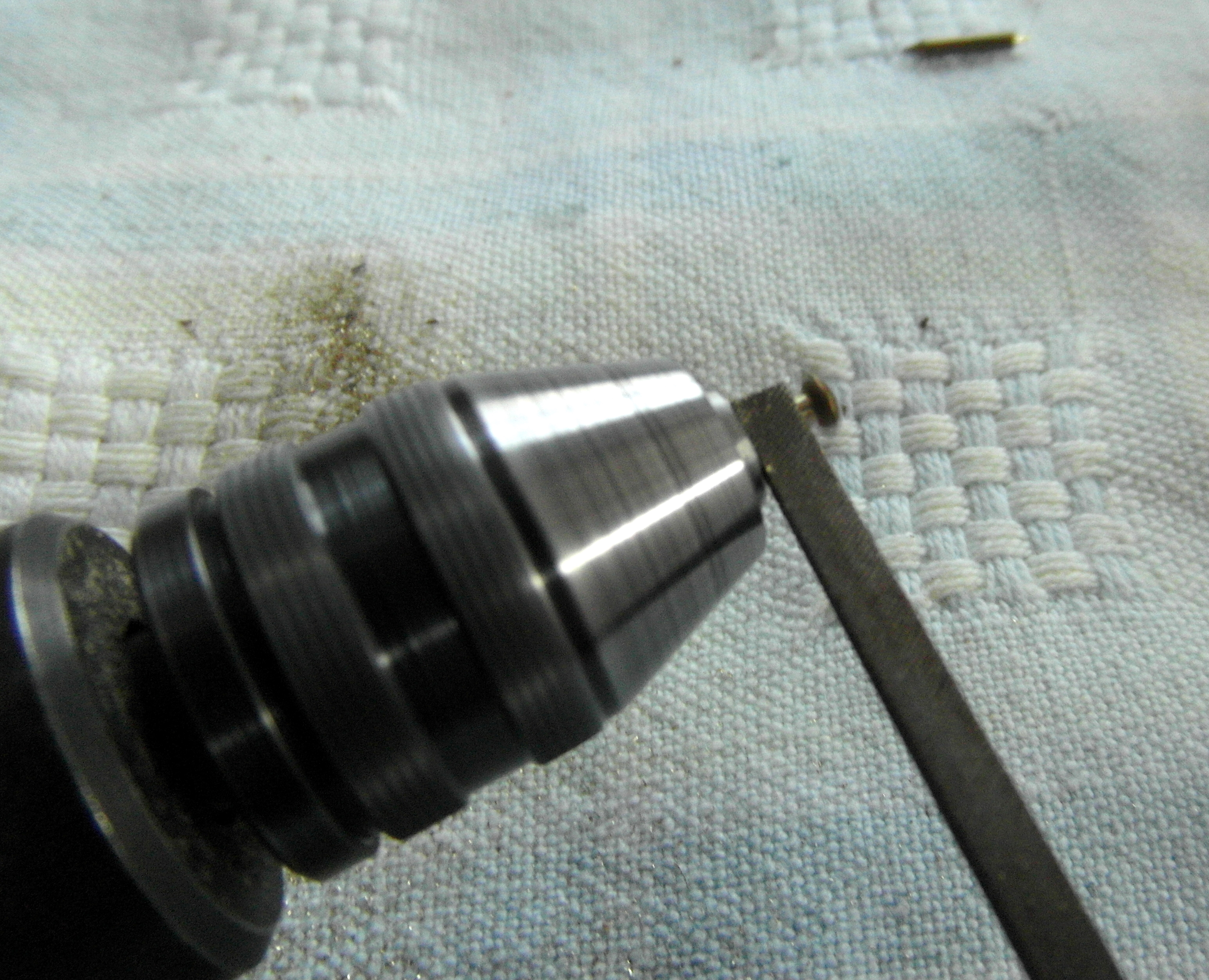 Costruisco quindi i due chiodini partendo da dei chiodi in ottone, che per quanto piccoli sono infinitamente grossi allo scopo; li strngo quindi nel mandrino del mini trapano e con l'aiuto di qualche piccola lima li riduco e li modello sino a raggiungere dimensioni e forma volute e lasciandoli di una lunghezza sufficiente a penetrare per lo spessore di almeno tutto il cappuccio; ma se penetrano anche nel contro cappuccio, tanto meglio.